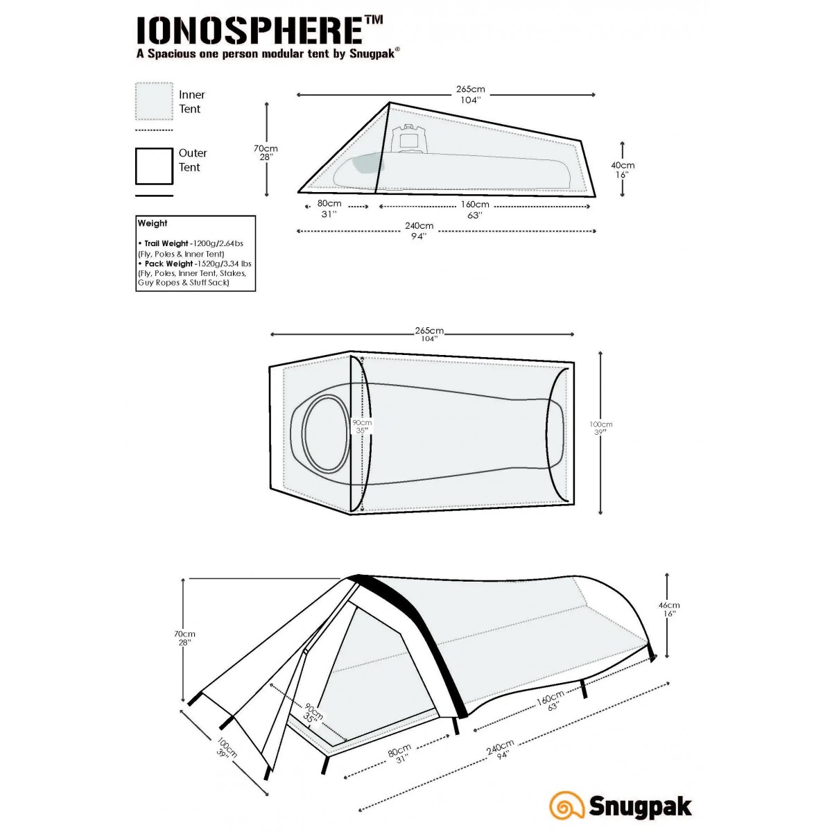 Ionosphere ™ Snugpak ® представляет собой двухполюсную компактную палатку с одним входом; она был специально разработана для запланированных ночевок, дикого кемпинга и приключенческих гонок, где требуется более надежная защита от погодных условий. Палатка имеет имеет впечатляющую площадь, занимающую 2,4 м в длину и 0,9 м в ширину, создавая достаточно места комфортного размещения одного человека со своим оборудованием; в чрезвычайной ситуации Ionosphere ™ может вместить двух человек. Палатка проста в установке, упаковывается до размеров 31х14см, минимальный вес всего 1,2 кг, в качестве каркаса используются проверенные дуги АЦП DAC ®, поэтому не занимает ценного места в вашем рюкзаке. Идеально подходит для более длительных предприятий и многодневного использования вместе с четырехсезонным спальным мешком Softie® Osprey 12. В целях экономии веса и места для летнего периода и теплых климатических условий к палатке Ionosphere идеально подойдет спальный мешок Snugpak Adventure весом всего 650гр или Snugpak Softie 3 Merlin весом 900гр. Палатка укроет от худшей неблагоприятной погоды, верхний тент выдержит давление в 5000-миллиметров водного столба, ткань обработана полиуретановым покрытием с ленточными швами, внутренний тент изготовлен из сетки Mosquito Net No-See-Um для предотвращения проникновения любых насекомых. Для летнего дикого кемпинга, ионосфера является идеальным вариантом, позволяя вам изменять и настраивать направление ветра, используя двухполюсную систему для формирования которое сдерживает образование конденсата до минимума. Между водонепроницаемым наружным тентом и внутренней сеткой достаточно места для хранения обуви, посуды, шлема, или трекинговых палок если это необходимо. Внутри палатки достаточно места для хранения рюкзака. По бокам есть также два небольших сетчатых кармана, которые очень удобны для предметов первой необходимости. Низкий профиль делает палатку более обтекаемой и соответственно устойчивой в сильных ветрах. Особенности Полный вес палатки 1520g включает в себя все (15 колышков – 195гр, вес упаковочного чехла с ремкомплектом-114 гр ) - выполненные из алюминия TH72M анодированные дуги Dac Poles DAC® Featherlite NSL®. - Палатка рассчитана для одного человека подходит для одного человека. - Палатка поставляется с набором колышек из 15 шт весом 13гр каждый. - Один боковой вход - Легкий, но прочный внешний тент 210t Ripstop Flysheet с водонепроницаемым полиуретановым покрытием 5000 мм. - пол изготовлен из легкого нейлон 190т с водонепроницаемым полиуретановым покрытием стойкостью 5000 мм. - Легкая антимоскитная 50D No-See-Um-Mesh. - Водонепроницаемые ленточные швы.