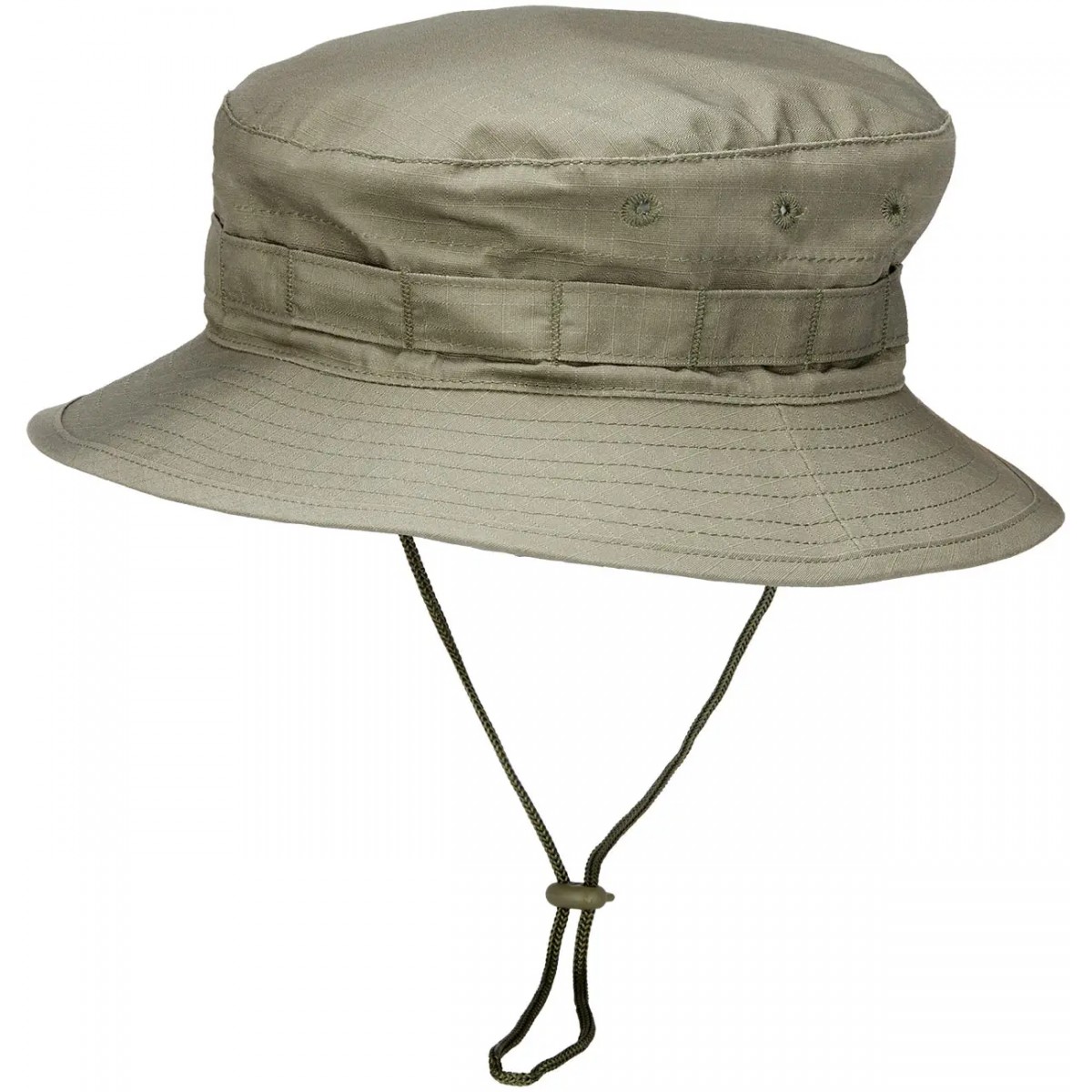 Панама выполнена из смесовой ткани с плетением Rip-Stop, состоящей из полиэстера (80%) и хлопка (20%). Данный материал обеспечивает хорошую воздухопроницаемость и не выгорает на солнце. Купол оснащен вентиляционными отверстиями и классической стропой для крепления маскировочных элементов.