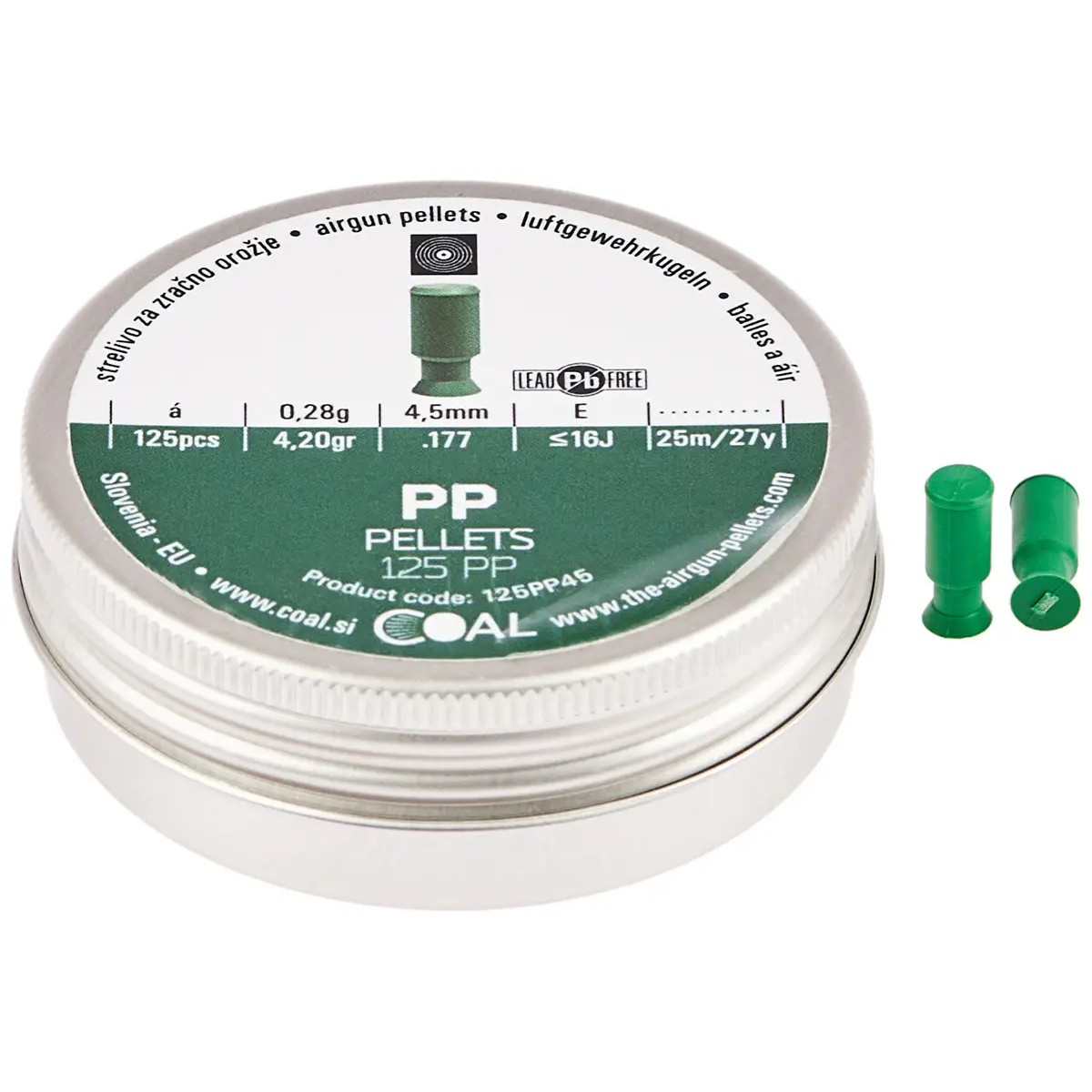 Линейка бессвинцовых полипропиленовых пуль PP с плоской головкой Coal, которые подходят для спортивной стрельбы из пневматического оружия калибра 4,5 мм. Они очень легкие и идеальны для стрельбы по мишеням.