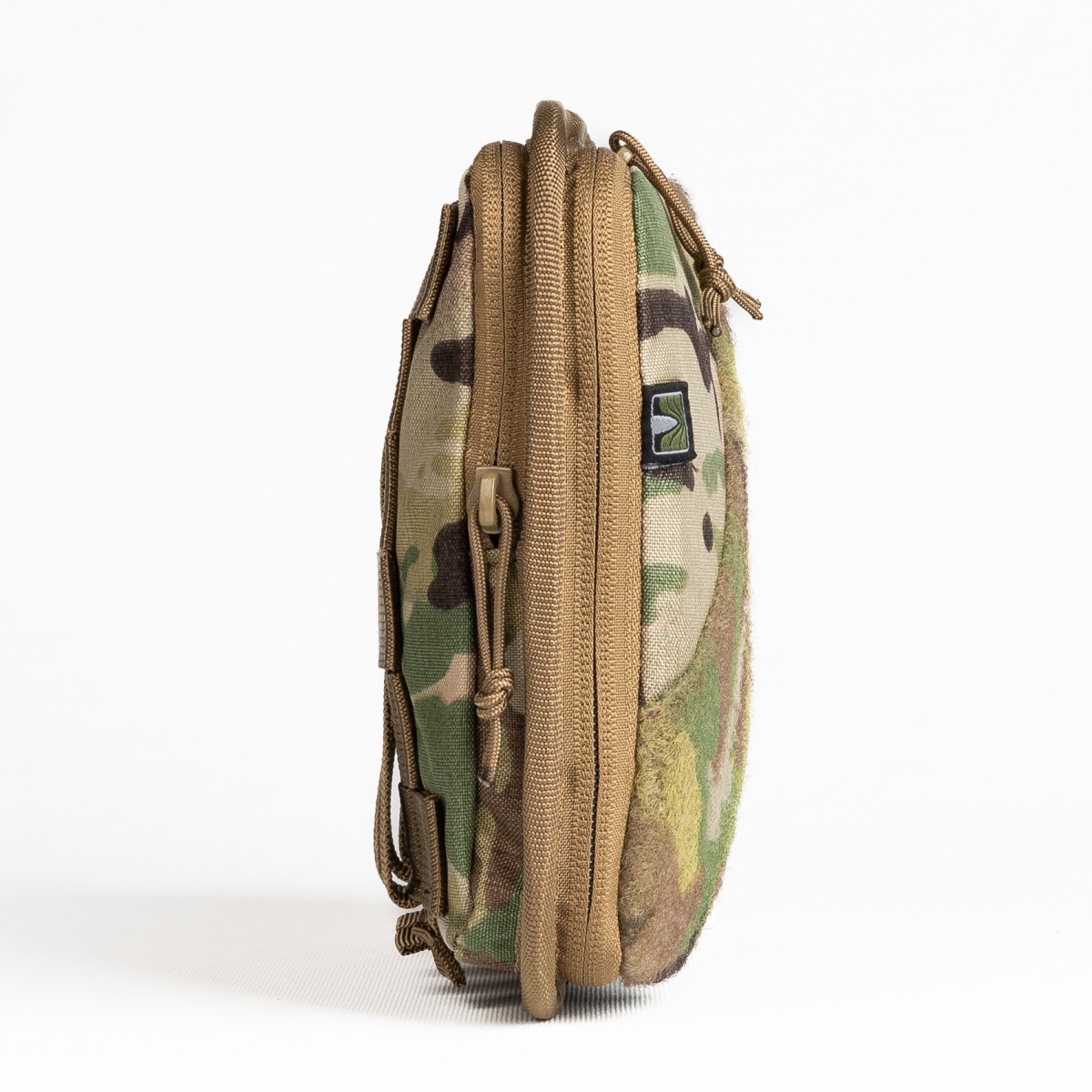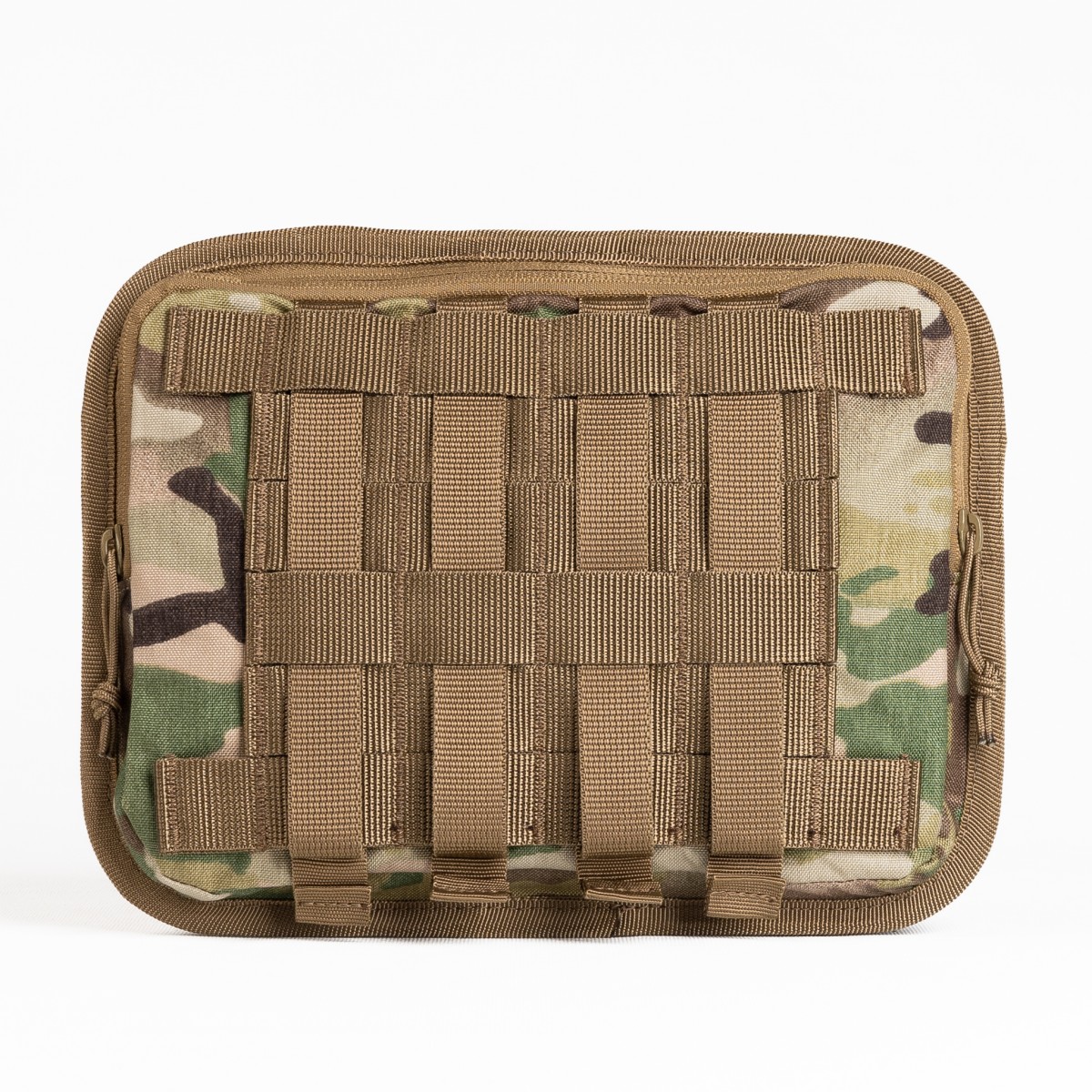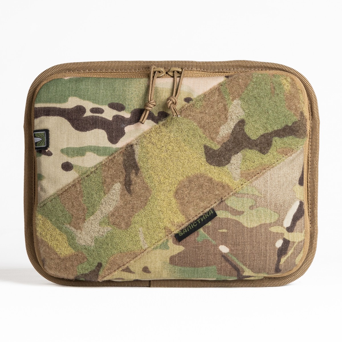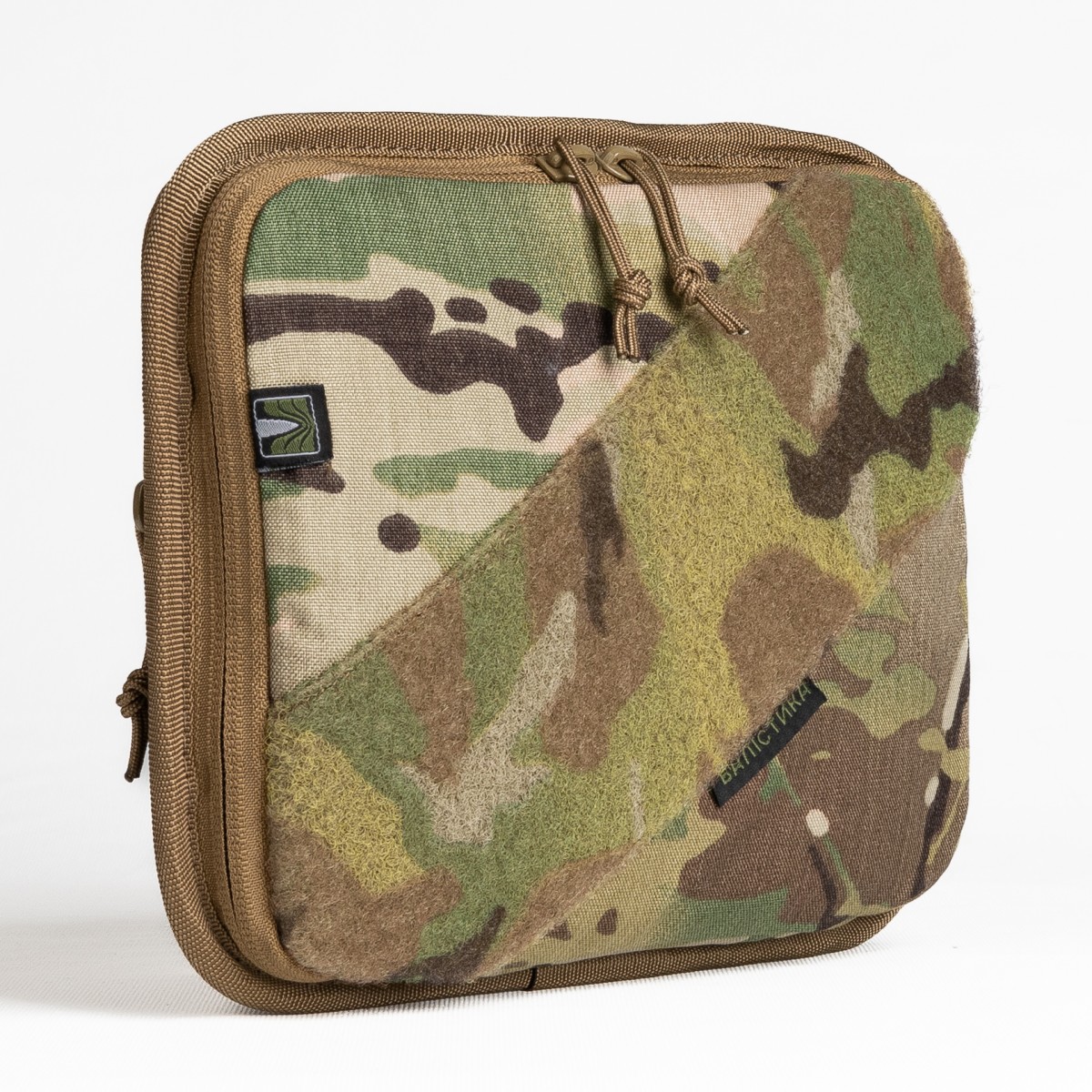 Подсумок от «Баллистика» позволяет комфортно переносить планшет до 9 дюймов. Это особенно пригодится военным, которые работают в сложных условиях и нуждаются в защите устройства от грязи, пыли, влаги и механических повреждений. При этом изделие достаточно просторное, чтобы вместить много других полезных инструментов. Особенности товара Подсумок состоит из двух отделов: Передний для планшета. Его передняя стенка оснащена карманом с клапаном, который изготовлен из прозрачной защитной пленки. Он имеет размер 22,5×16,5 см. Пленка предотвращает царапины, загрязнение устройства, при этом сохраняет четкость изображения и чувствительность сенсорного экрана. На второй стенке помещены петелька для карандаша и эластичная лента на всю ширину отдела, которая позволяет зафиксировать тактический блокнот всепогодный, карту, документы, офицерскую линейку (до 23 см) и пр. Задний утилитарный. Также имеет петельку для письменных принадлежностей и широкую резинку-фиксатор, которая разделена швами на четыре секции. В них можно поместить мультитул, фонарик, небольшие ножницы, складной нож и пр. К другим свойствам подсумка относятся такие: Фронтальная стенка внутри имеет слой пены, которая защищает содержимое от ударов. Внутренняя перегородка, которая разделяет отделы, усилена пластиковой вставкой, что позволяет изделию держать форму и предотвращает сминание бумаг. Также снаружи по всему периметру эта вставка обшита отделочной лентой для дополнительного укрепления. Отделение для планшета имеет широкое раскрывание до самого дна. С каждой стороны помещено по два паракордовых держателя, пришитые накрест. Они позволяют ограничивать угол раскрытия до 90°. Благодаря этому при размещении подсумка на груди плитоноски или бронежилета он служит рабочей платформой и при этом позволяет освободить руки. Отделы застегиваются на молнии, каждая из которых имеет по два бегунка, что позволяет расстегивать их на удобную сторону. При этом в переднем отделе бегунки встречаются, а в заднем – разбегаются на противоположные края. Подсумок надежно крепится к плитоноске на четыре секции системы MOLLE. К четырем петлям на крайних верхних и нижних ячейках MOLLE можно прикрепить ремешки 25 мм. Так можно будет носить подсумок на шее и поясе или только на плече. Ремешки не входят в комплект. Диагональная велкро-панель (27×8 см) на внешней стороне позволяет зафиксировать патчи или мелкие подсумки на липучке. Технические характеристики Внешний материал: Cordura 500D. Внутренний материал: Oxford 340D. Липучка: Velcro. Размер подсумка: 25×19×4 см. Размер кармана: 22,5×16,5 см (под планшет до 9 дюймов). Вес: 280 г.Основные характеристики Подсумок административный навигационный XL (Мультикам)