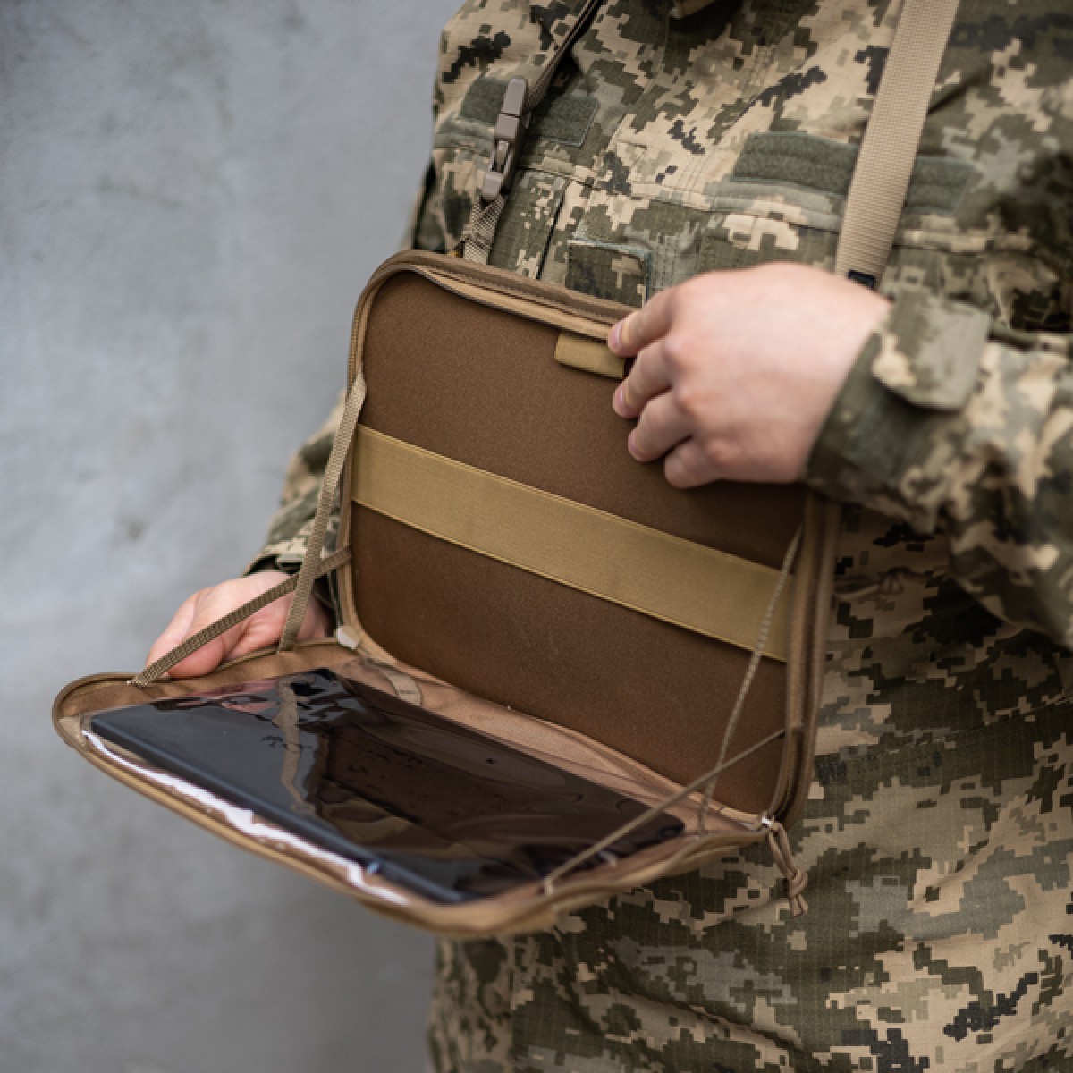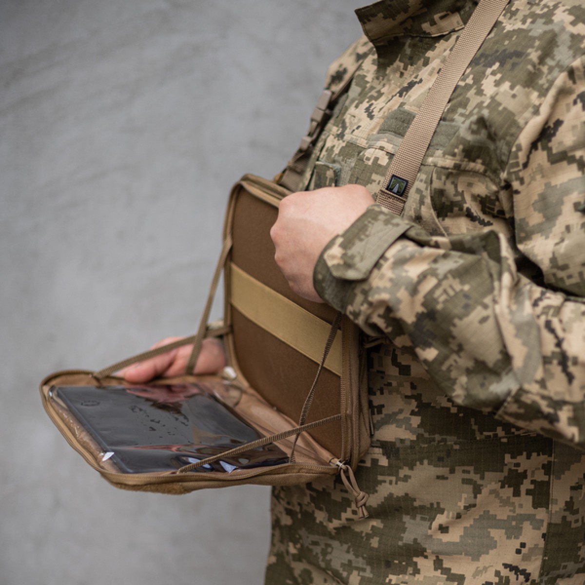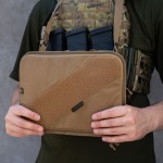 Административный подсумок от «Баллистика» позволяет транспортировать планшет до 13 дюймов. Изделие создано с учетом потребностей военных, которые работают в сложных условиях и нуждаются в защите устройства от грязи, пыли, влаги и механических повреждений. При этом подсумок достаточно просторный, чтобы вместить дополнительный инвентарь. Особенности товара Подсумок состоит из двух отделов: Передний для планшета. Передняя стенка отдела оснащена карманом с клапаном, который изготовлен из прозрачной защитной пленки. Он имеет размер 27×20 см. Пленка предотвращает царапины, загрязнение устройства, при этом сохраняет четкость изображения и чувствительность сенсорного экрана. На второй стенке отдела помещены петелька для карандаша и эластичная лента на всю ширину, которая позволяет зафиксировать тактический блокнот всепогодный, карту, документы, офицерскую линейку (до 29 см) и др. Задний утилитарный утилитарный. Также имеет петельку для письменных принадлежностей и широкую резинку-фиксатор, которая разделена швами на четыре секции. В них можно поместить мультитул, фонарик, небольшие ножницы, складной нож и пр. К другим особенностям подсумка относятся следующие: Фронтальная стенка внутри заполнена пеной, которая защищает содержимое от ударов. Внутренняя перегородка, которая разделяет отделы, усилена пластиковой вставкой, которая держит форму изделия и предотвращает сминание бумаг. Также снаружи по всему периметру эта вставка обшита отделочной лентой для дополнительного укрепления. Отделение для планшета имеет широкое раскрывание до самого дна. С каждой стороны нашиты по два держателя из тесьмы (шириной 8 мм), закрепленные накрест. Они позволяют ограничивать угол раскрытия до 90°. Благодаря этому при размещении подсумка на груди плитоноски или бронежилета он служит рабочей платформой и при этом освобождает руки. Отделы застегиваются на молнии, каждая из которых имеет по два бегунка, что позволяет расстегивать их на удобную сторону. При этом в переднем отделе бегунки встречаются, а в заднем – разбегаются на противоположные края. Подсумок надежно шнуруется к плитоноске на четыре секции системы MOLLE. В комплект входит регулируемый ремешок, который позволяет носить изделие на шее или через плечо. Для этого карабины, которыми он оснащен, продеваются через петли на крайних ячейках MOLLE. Диагональная велкро-панель (33×8 см) на внешней стороне подсумка позволяет крепить патчи или мелкие подсумки на липучке. Технические характеристики Внешний материал: Cordura 1000D. Внутренний материал: Oxford 600D. Липучка: Velcro. Размер подсумка: 31,5×23,5×4 см. Размер кармана: 27×20 см (под планшет до 13 дюймов). Длина ремешка: от 64 до 110 см. Вес: 410 г.Отзывы о Подсумок административный навигационный XXL Пленка (Койот)
