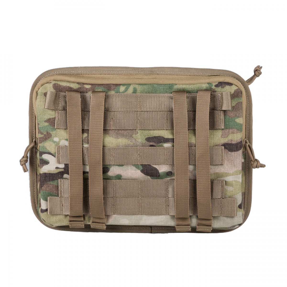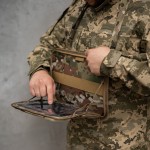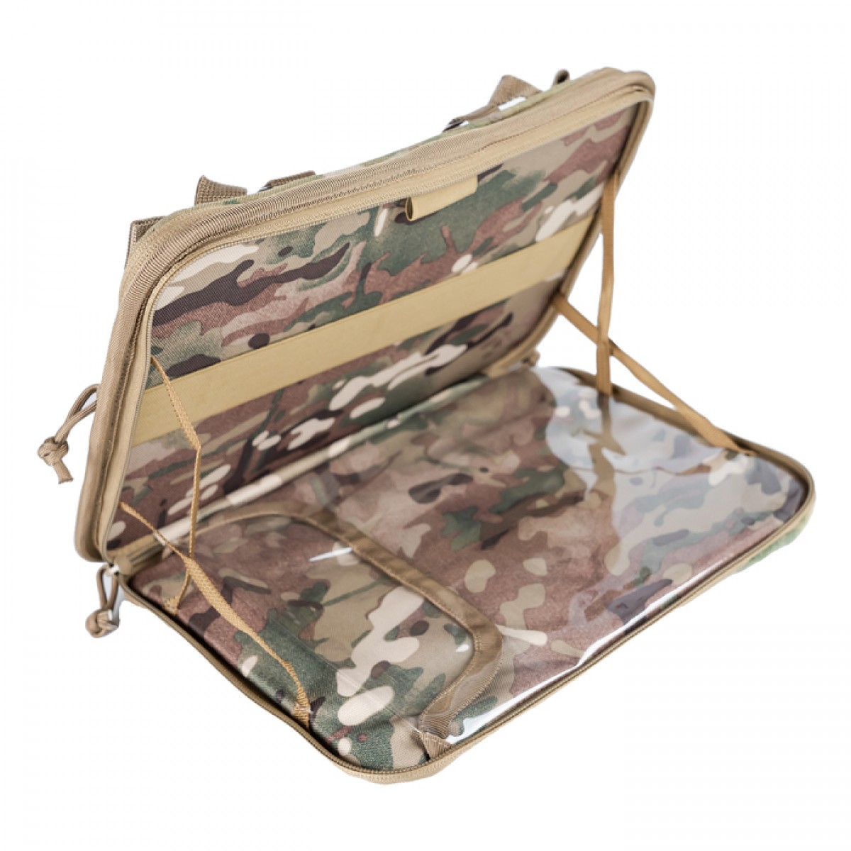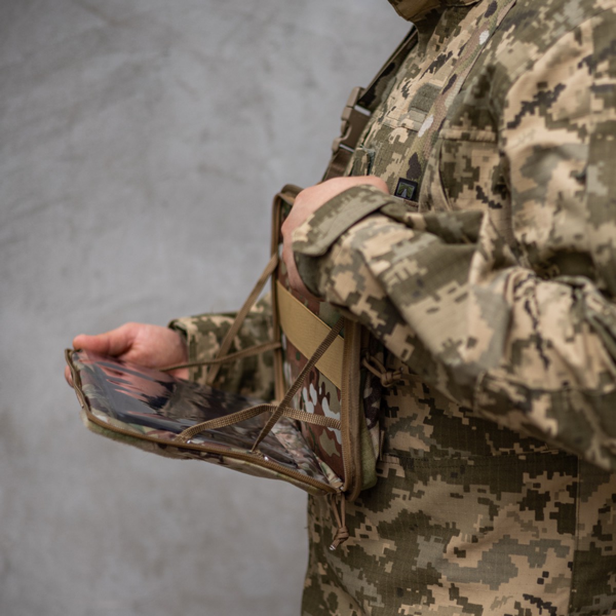 Административный подсумок от «Баллистика» позволяет транспортировать планшет до 13 дюймов. Изделие создано с учетом потребностей военных, которые работают в сложных условиях и нуждаются в защите устройства от грязи, пыли, влаги и механических повреждений. При этом подсумок достаточно просторный, чтобы вместить дополнительный инвентарь. Особенности товара Подсумок состоит из двух отделов: Передний для планшета. Передняя стенка отдела оснащена карманом с клапаном, который изготовлен из прозрачной защитной пленки. Он имеет размер 27×20 см. Пленка предотвращает царапины, загрязнение устройства, при этом сохраняет четкость изображения и чувствительность сенсорного экрана. На второй стенке отдела помещены петелька для карандаша и эластичная лента на всю ширину, которая позволяет зафиксировать тактический блокнот всепогодный, карту, документы, офицерскую линейку (до 29 см) и др. Задний утилитарный утилитарный. Также имеет петельку для письменных принадлежностей и широкую резинку-фиксатор, которая разделена швами на четыре секции. В них можно поместить мультитул, фонарик, небольшие ножницы, складной нож и пр. К другим особенностям подсумка относятся следующие: Фронтальная стенка внутри заполнена пеной, которая защищает содержимое от ударов. Внутренняя перегородка, которая разделяет отделы, усилена пластиковой вставкой, которая держит форму изделия и предотвращает сминание бумаг. Также снаружи по всему периметру эта вставка обшита отделочной лентой для дополнительного укрепления. Отделение для планшета имеет широкое раскрывание до самого дна. С каждой стороны нашиты по два держателя из тесьмы (шириной 8 мм), закрепленные накрест. Они позволяют ограничивать угол раскрытия до 90°. Благодаря этому при размещении подсумка на груди плитоноски или бронежилета он служит рабочей платформой и при этом освобождает руки. Отделы застегиваются на молнии, каждая из которых имеет по два бегунка, что позволяет расстегивать их на удобную сторону. При этом в переднем отделе бегунки встречаются, а в заднем – разбегаются на противоположные края. Подсумок надежно шнуруется к плитоноске на четыре секции системы MOLLE. В комплект входит регулируемый ремешок, который позволяет носить изделие на шее или через плечо. Для этого карабины, которыми он оснащен, продеваются через петли на крайних ячейках MOLLE. Диагональная велкро-панель (33×8 см) на внешней стороне подсумка позволяет крепить патчи или мелкие подсумки на липучке. Технические характеристики Внешний материал: Cordura 500D. Внутренний материал: Oxford 600D. Липучка: Velcro. Размер подсумка: 31,5×23,5×4 см. Размер кармана: 27×20 см (под планшет до 13 дюймов). Длина ремешка: от 64 до 110 см. Вес: 410 г.Отзывы о Подсумок административный навигационный XXL Пленка (Мультикам)