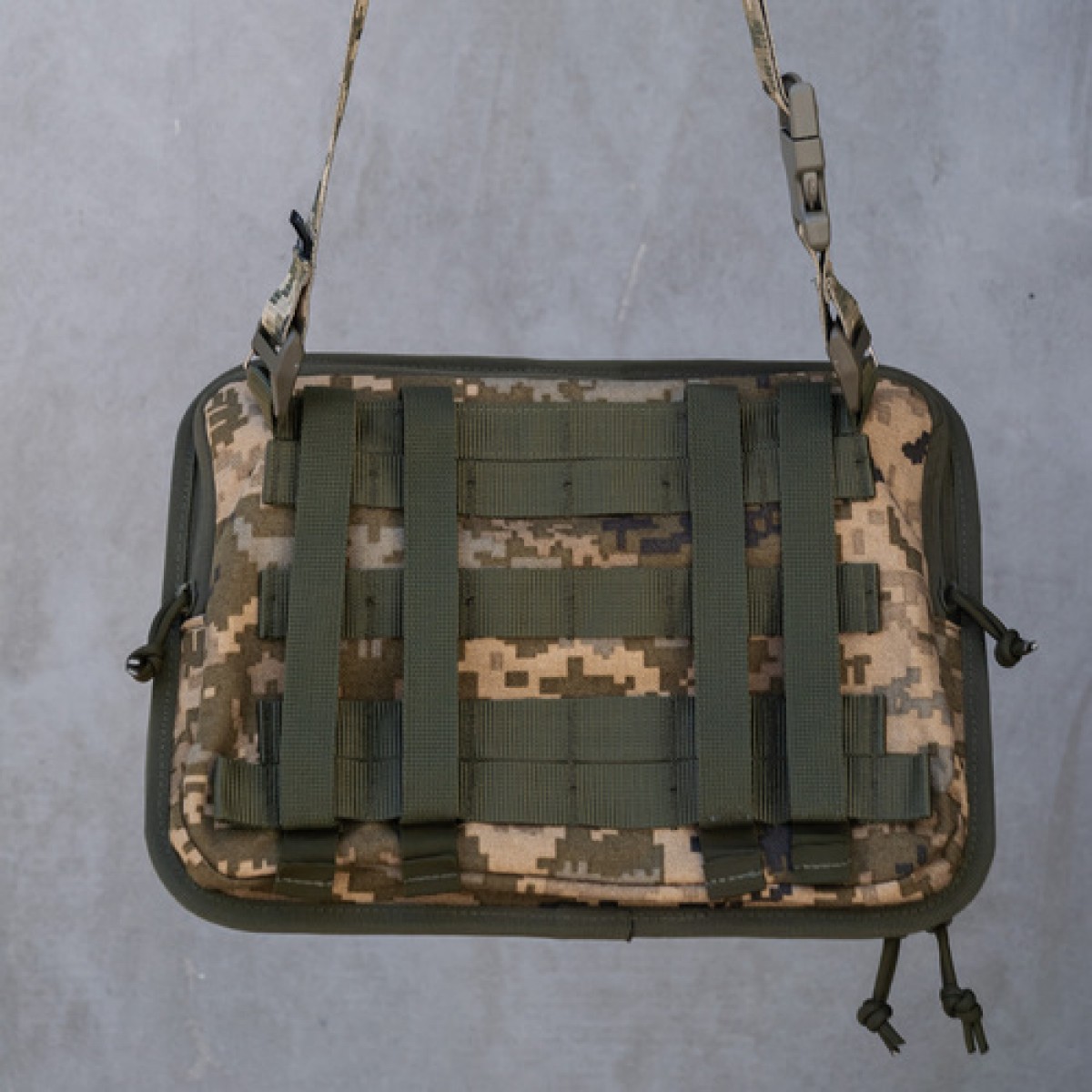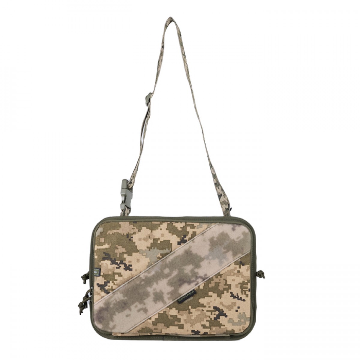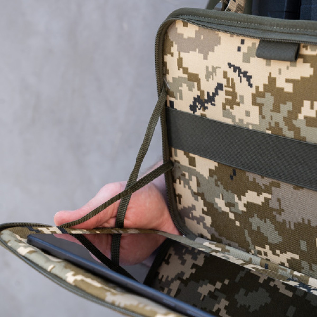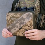 Административный подсумок от «Баллистика» позволяет транспортировать планшет до 13 дюймов. Изделие создано с учетом потребностей военных, которые работают в сложных условиях и нуждаются в защите устройства от грязи, пыли, влаги и механических повреждений. При этом подсумок достаточно просторный, чтобы вместить дополнительный инвентарь. Особенности товара Подсумок состоит из двух отделов: Передний для планшета. Передняя стенка отдела оснащена велкро-панелью (21×10 см). Конструкция состоит из жесткой липучки, которая пришита к подсумку, и мягкой накладки, которая снаружи имеет самоклеящуюся поверхность. Именно к ней крепится планшет и вместе с ней отсоединяется/присоединяется к жесткому велкро. На второй стенке отдела помещены петелька для карандаша и эластичная лента на всю ширину, которая позволяет зафиксировать тактический блокнот всепогодный, карту, документы, офицерскую линейку (до 29 см) и пр. Задний утилитарный. Также имеет петельку для письменных принадлежностей и широкую резинку-фиксатор, которая разделена швами на четыре секции. В них можно поместить мультитул, фонарик, небольшие ножницы, складной нож и пр. К другим особенностям подсумка относятся следующие: Фронтальная стенка внутри заполнена пеной, которая защищает содержимое от ударов. Внутренняя перегородка, которая разделяет отделы, усилена пластиковой вставкой, которая держит форму изделия и предотвращает сминание бумаг. Также снаружи по всему периметру эта вставка обшита отделочной лентой для дополнительного укрепления. Отделение для планшета имеет широкое раскрывание до самого дна. С каждой стороны нашиты по два держателя из тесьмы (шириной 8 мм), закрепленные накрест. Они позволяют ограничивать угол раскрытия до 90°. Благодаря этому при размещении подсумка на груди плитоноски или бронежилета он служит рабочей платформой и при этом освобождает руки. Отделы застегиваются на молнии, каждая из которых имеет по два бегунка, что позволяет расстегивать их на удобную сторону. При этом в переднем отделе бегунки встречаются, а в заднем – разбегаются на противоположные края. Подсумок надежно шнуруется к плитоноске на четыре секции системы MOLLE. В комплект входит регулируемый ремешок, который позволяет носить изделие на шее или через плечо. Для этого карабины, которыми он оснащен, продеваются через петли на крайних ячейках MOLLE. Диагональная велкро-панель (33×8 см) на внешней стороне подсумка позволяет крепить патчи или мелкие подсумки на липучке. Технические характеристики Внешний материал: нейлон 500D. Внутренний материал: Oxford 340D. Липучка: Velcro. Размер подсумка: 31,5×23,5×4 см. Внутренний размер отделения под планшет: 29×20 см (до 13 дюймов). Длина ремешка: от 64 до 110 см. Вес: 430 г.Отзывы о Подсумок административный навигационный XXL Велкро (ММ14)