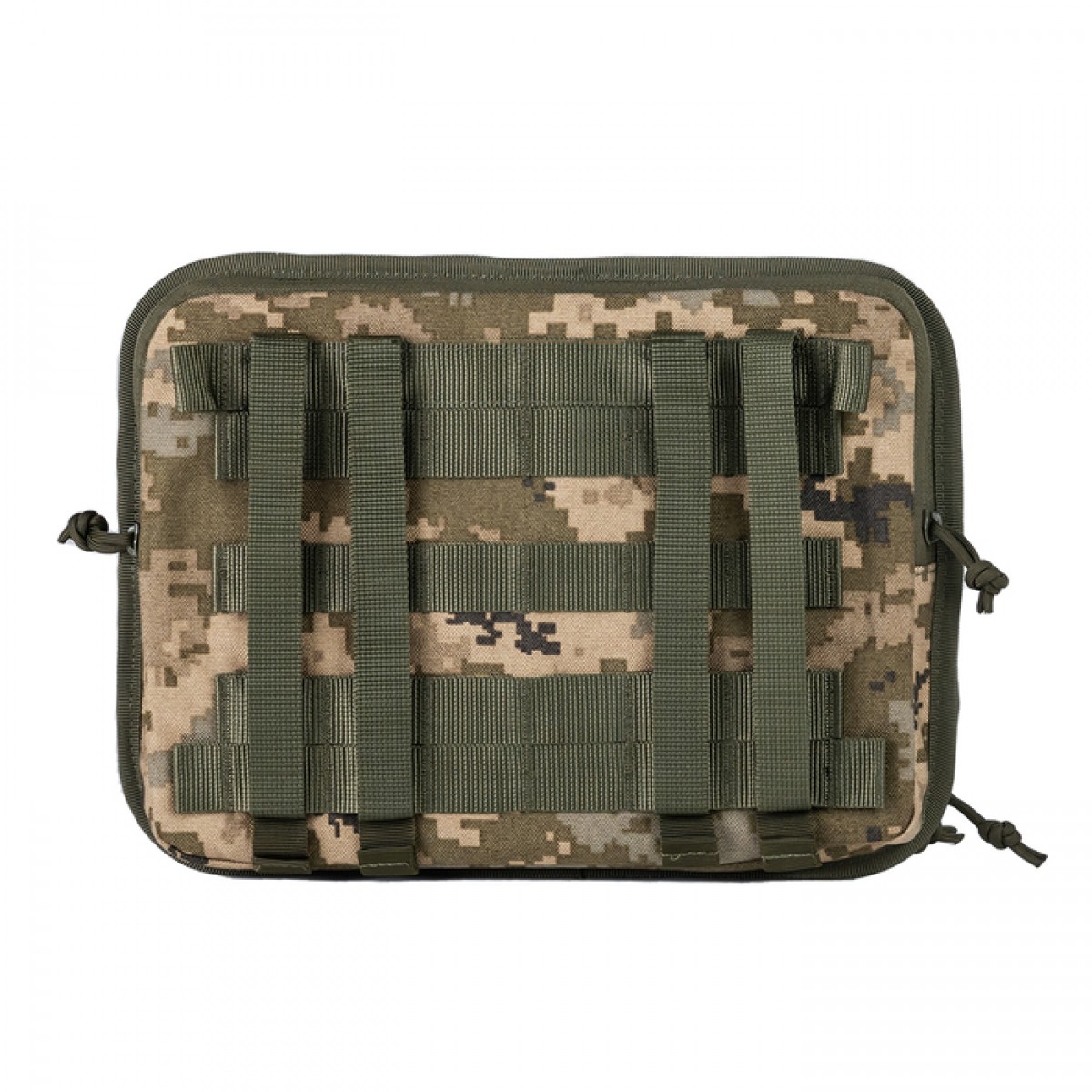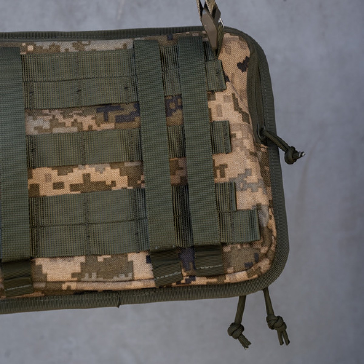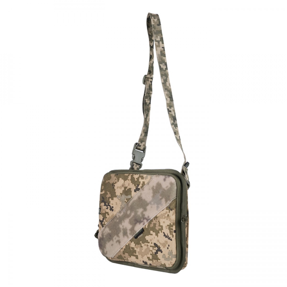 Административный подсумок от «Баллистика» позволяет транспортировать планшет до 13 дюймов. Изделие создано с учетом потребностей военных, которые работают в сложных условиях и нуждаются в защите устройства от грязи, пыли, влаги и механических повреждений. При этом подсумок достаточно просторный, чтобы вместить дополнительный инвентарь. Особенности товара Подсумок состоит из двух отделов: Передний для планшета. Передняя стенка отдела оснащена велкро-панелью (21×10 см). Конструкция состоит из жесткой липучки, которая пришита к подсумку, и мягкой накладки, которая снаружи имеет самоклеящуюся поверхность. Именно к ней крепится планшет и вместе с ней отсоединяется/присоединяется к жесткому велкро. На второй стенке отдела помещены петелька для карандаша и эластичная лента на всю ширину, которая позволяет зафиксировать тактический блокнот всепогодный, карту, документы, офицерскую линейку (до 29 см) и пр. Задний утилитарный. Также имеет петельку для письменных принадлежностей и широкую резинку-фиксатор, которая разделена швами на четыре секции. В них можно поместить мультитул, фонарик, небольшие ножницы, складной нож и пр. К другим особенностям подсумка относятся следующие: Фронтальная стенка внутри заполнена пеной, которая защищает содержимое от ударов. Внутренняя перегородка, которая разделяет отделы, усилена пластиковой вставкой, которая держит форму изделия и предотвращает сминание бумаг. Также снаружи по всему периметру эта вставка обшита отделочной лентой для дополнительного укрепления. Отделение для планшета имеет широкое раскрывание до самого дна. С каждой стороны нашиты по два держателя из тесьмы (шириной 8 мм), закрепленные накрест. Они позволяют ограничивать угол раскрытия до 90°. Благодаря этому при размещении подсумка на груди плитоноски или бронежилета он служит рабочей платформой и при этом освобождает руки. Отделы застегиваются на молнии, каждая из которых имеет по два бегунка, что позволяет расстегивать их на удобную сторону. При этом в переднем отделе бегунки встречаются, а в заднем – разбегаются на противоположные края. Подсумок надежно шнуруется к плитоноске на четыре секции системы MOLLE. В комплект входит регулируемый ремешок, который позволяет носить изделие на шее или через плечо. Для этого карабины, которыми он оснащен, продеваются через петли на крайних ячейках MOLLE. Диагональная велкро-панель (33×8 см) на внешней стороне подсумка позволяет крепить патчи или мелкие подсумки на липучке. Технические характеристики Внешний материал: нейлон 500D. Внутренний материал: Oxford 340D. Липучка: Velcro. Размер подсумка: 31,5×23,5×4 см. Внутренний размер отделения под планшет: 29×20 см (до 13 дюймов). Длина ремешка: от 64 до 110 см. Вес: 430 г.Отзывы о Подсумок административный навигационный XXL Велкро (ММ14)