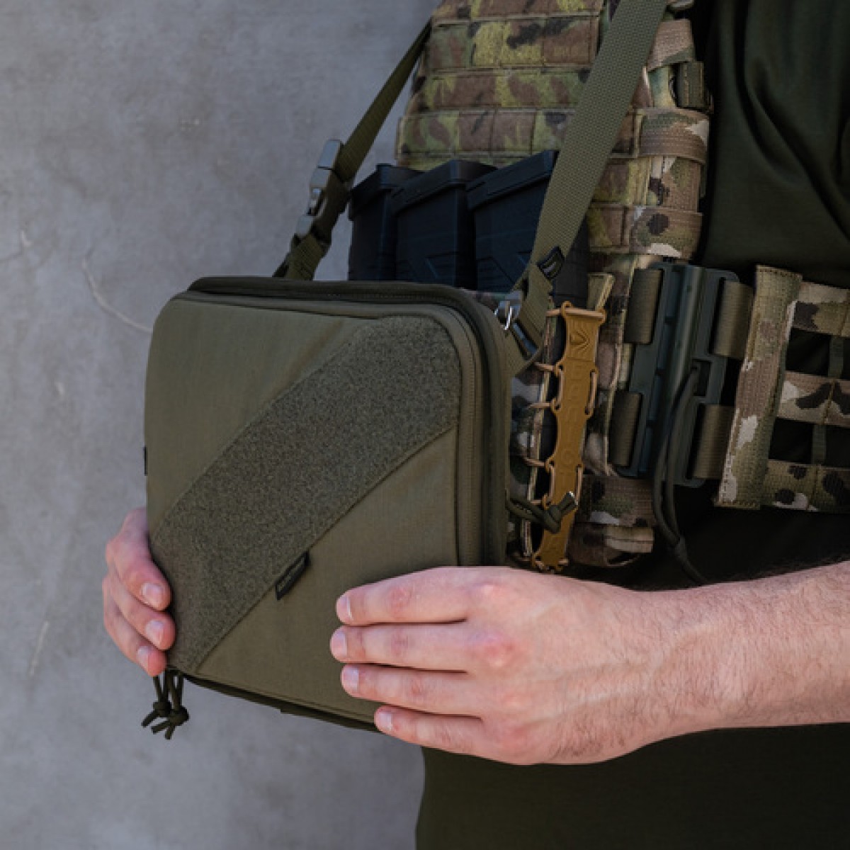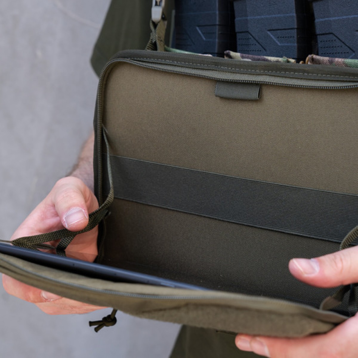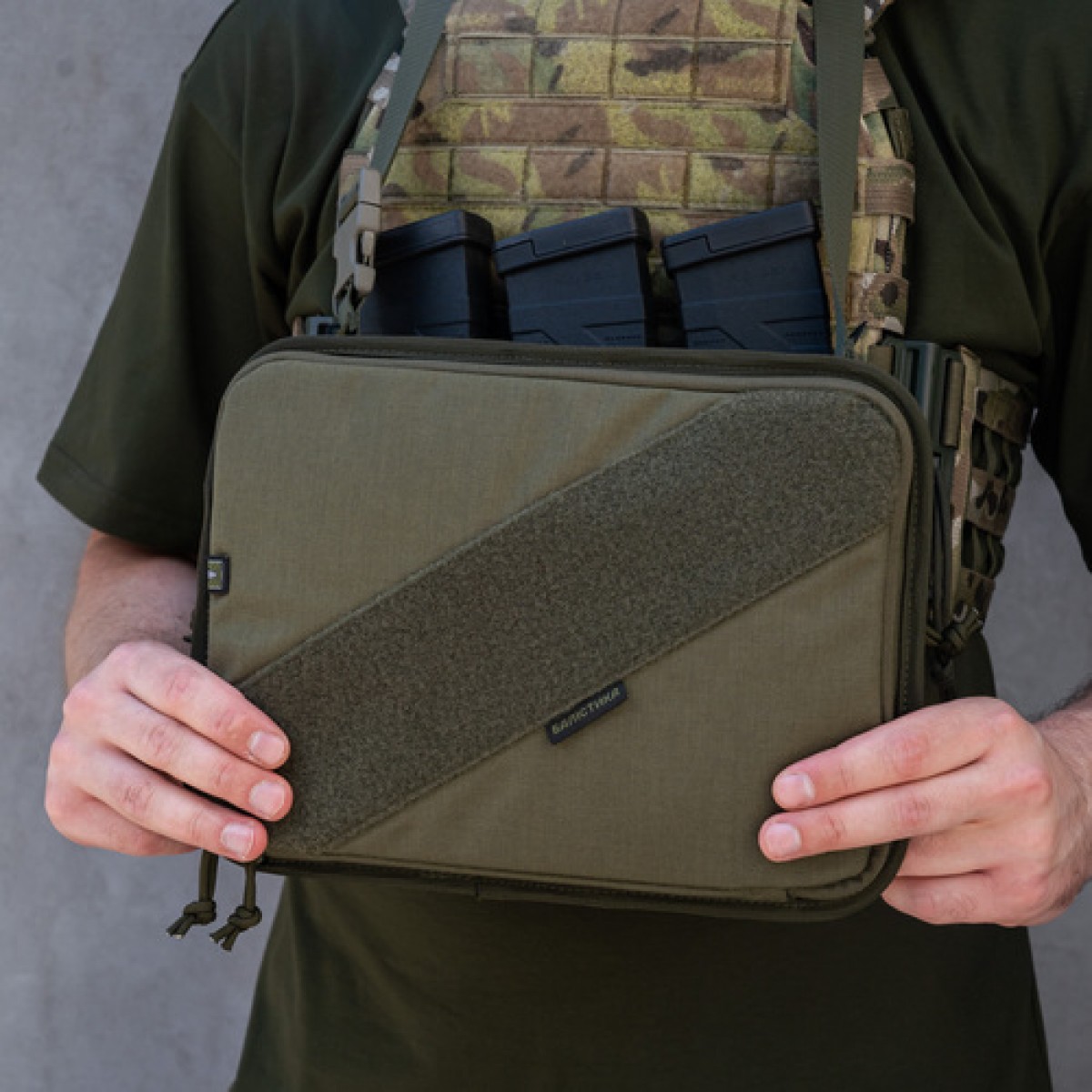 Административный подсумок от «Баллистика» позволяет транспортировать планшет до 13 дюймов. Изделие создано с учетом потребностей военных, которые работают в сложных условиях и нуждаются в защите устройства от грязи, пыли, влаги и механических повреждений. При этом подсумок достаточно просторный, чтобы вместить дополнительный инвентарь. Особенности товара Подсумок состоит из двух отделов: Передний для планшета. Передняя стенка отдела оснащена велкро-панелью (21×10 см). Конструкция состоит из жесткой липучки, которая пришита к подсумку, и мягкой накладки, которая снаружи имеет самоклеящуюся поверхность. Именно к ней крепится планшет и вместе с ней отсоединяется/присоединяется к жесткому велкро. На второй стенке отдела помещены петелька для карандаша и эластичная лента на всю ширину, которая позволяет зафиксировать тактический блокнот всепогодный, карту, документы, офицерскую линейку (до 29 см) и пр. Задний утилитарный. Также имеет петельку для письменных принадлежностей и широкую резинку-фиксатор, которая разделена швами на четыре секции. В них можно поместить мультитул, фонарик, небольшие ножницы, складной нож и пр. К другим особенностям подсумка относятся следующие: Фронтальная стенка внутри заполнена пеной, которая защищает содержимое от ударов. Внутренняя перегородка, которая разделяет отделы, усилена пластиковой вставкой, которая держит форму изделия и предотвращает сминание бумаг. Также снаружи по всему периметру эта вставка обшита отделочной лентой для дополнительного укрепления. Отделение для планшета имеет широкое раскрывание до самого дна. С каждой стороны нашиты по два держателя из тесьмы (шириной 8 мм), закрепленные накрест. Они позволяют ограничивать угол раскрытия до 90°. Благодаря этому при размещении подсумка на груди плитоноски или бронежилета он служит рабочей платформой и при этом освобождает руки. Отделы застегиваются на молнии, каждая из которых имеет по два бегунка, что позволяет расстегивать их на удобную сторону. При этом в переднем отделе бегунки встречаются, а в заднем – разбегаются на противоположные края. Подсумок надежно шнуруется к плитоноске на четыре секции системы MOLLE. В комплект входит регулируемый ремешок, который позволяет носить изделие на шее или через плечо. Для этого карабины, которыми он оснащен, продеваются через петли на крайних ячейках MOLLE. Диагональная велкро-панель (33×8 см) на внешней стороне подсумка позволяет крепить патчи или мелкие подсумки на липучке. Технические характеристики Внешний материал: Cordura 1000D. Внутренний материал: Oxford 340D. Липучка: Velcro. Размер подсумка: 31,5×23,5×4 см. Внутренний размер отделения под планшет: 29×20 см (до 13 дюймов). Длина ремешка: от 64 до 110 см. Вес: 430 г.Отзывы о Подсумок административный навигационный XXL Велкро (Олива)