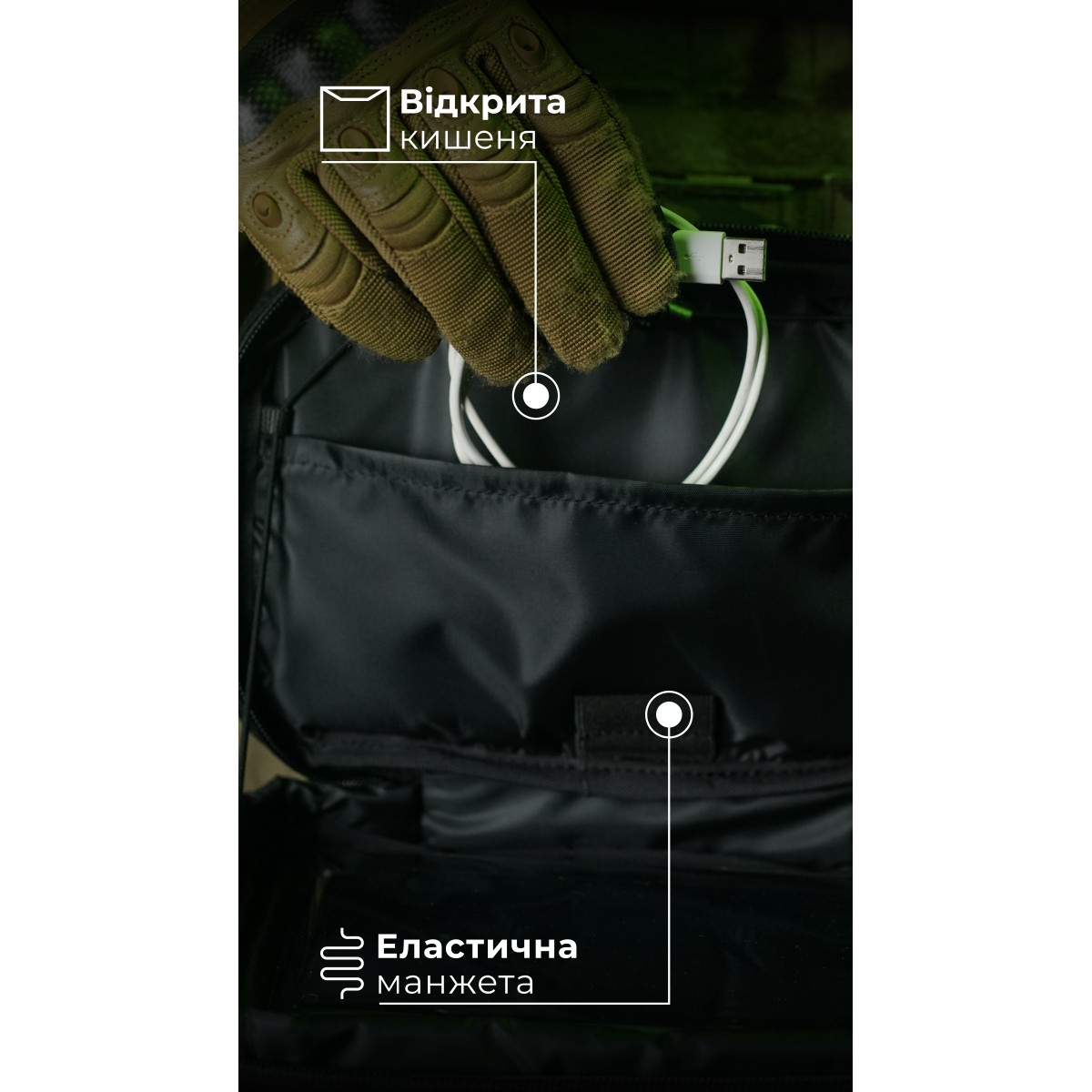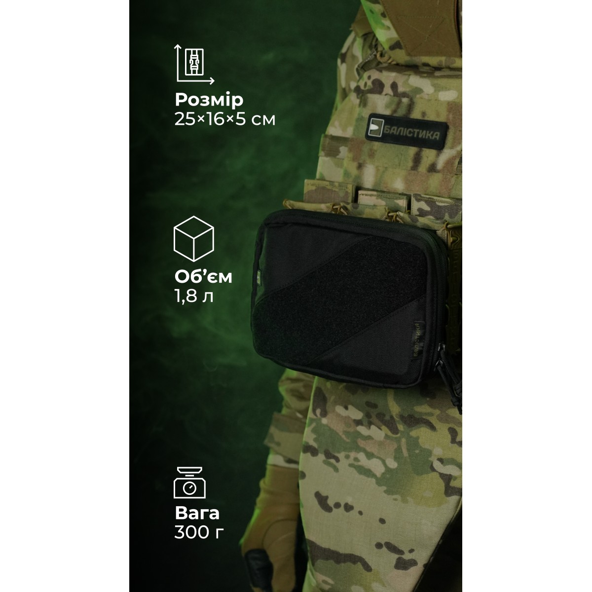 Низкопрофильный подсумок «Берестяник» рассчитан на планшет диагональю до 8 дюймов. Благодаря демпферным стенкам и ПВХ-пленке надежно защищает ваше устройство от ударов, грязи, пыли и влаги. ✅ Ключевые преимущества Предназначен для планшета до 8ʺ Прозрачный карман для устройства Открытый карман для мелочей Регулируемый угол раскрытия Двойная эластичная манжета под канцелярию Демпферные и пластиковые вставки для защиты от повреждений Крепится на ширину 6 ячеек молли, в частности на 3 подсумках «Колчан» Можно носить на ремешке (в комплекте) Внешняя велкро-панель под патчи и идентификаторы Описание товара «Берестяник» выполнен в минималистичном стиле и имеет одно отделение. Кроме планшета, в нем также поместятся несколько мелких вещей (необязательно одновременно) – карта, блокнот формата А5, зарядное устройство, павербанк, пара энергетических батончиков и т. д. На передней стенке размещен карман из прозрачной пленки (23×15 см). Подвернутый клапан на ней не дает устройству выскользнуть и минимизирует попадание внутрь грязи. На задней стенке нашит открытый карман с невысоким бортиком (23,5×10,5 см). Снаружи на этом кармане размещена двойная манжета из эластичной тесьмы, в которую можно вложить ручку, маркер или карандаш. Сумка застегивается молнией с двумя бегунками и имеет широкое раскрытие до дна. ✔️ Держатель из миникорда и фиксатор позволяют регулировать угол раскрытия. ✔️ Благодаря этому при размещении подсумка на передней панели плитоноски или бронежилета он выступает рабочей платформой и освобождает руки. Стенки подсумка оснащены демпферами и пластиковыми вставками. В боковинах и дне также зашита пенка. Подсумок шнуруется к плитоноске четырьмя стропами и занимает ширину шести ячеек молли. Оптимально закрепить его сверху на трех подсумках «Колчан». При необходимости его можно носить на ремешке (110×2,5 см) через плечо. ✔️ Ремешок поставляется вместе с подсумком и крепится карабинами к крайним верхним ячейкам молли или вертикальным стропам. ✔️ Фастекс на нем обеспечивает быстрое снятие, а двухщелевая рамка – регулировку под комплекцию. Спереди предусмотрена фирменная косая велкро-панель (~27×8 см), на которую можно крепить патчи и идентификаторы. ❓ Часто задаваемые вопросы Не мешает ли тентовое окно работе с сенсорным экраном? Нет, оно полностью передает нажатие. Поэтому вы можете работать с планшетом, даже не вынимая его из кармана. Поместится ли планшет на 10 дюймов? Подсумок создан под планшеты до 8 дюймов. Можно ли стирать подсумок с ПВХ-пленкой? Рекомендуем только ручную стирку с безфосфатным порошком в воде комнатной температуры. Не применяйте чрезмерную силу и жесткие щетки при очистке пленки.Отзывы о Подсумок для планшета "Берестяник" (До 8" | С тентовым окном | Черный) ТМ Баллистика