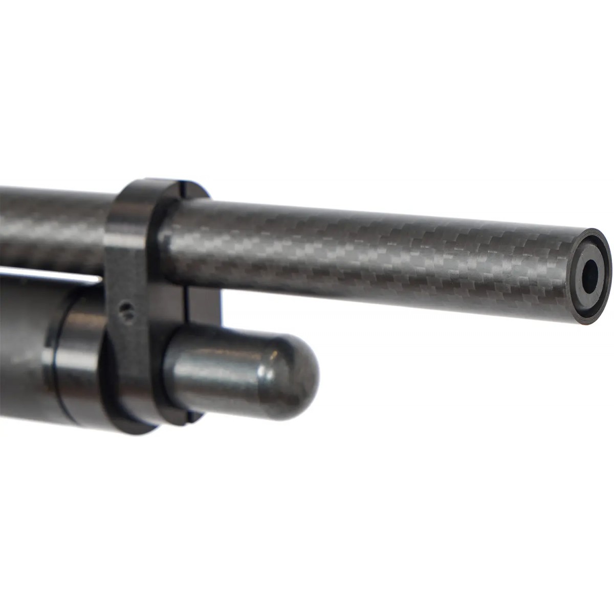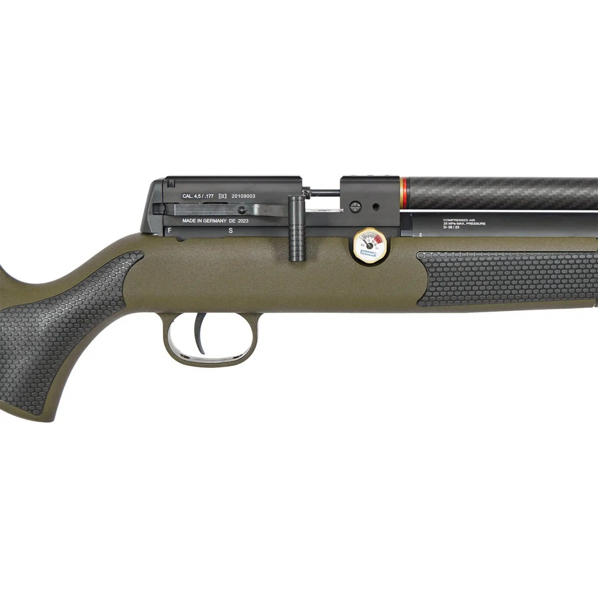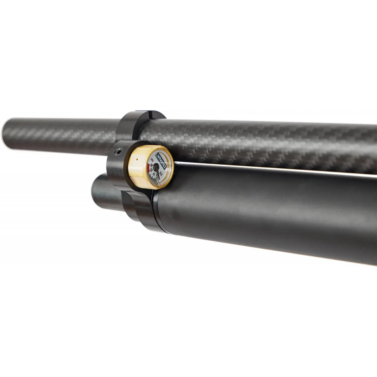 Еще одной конструктивной особенностью является расположение манометра HPA. Он расположен в передней части напорной трубки и повернут к стрелку, что дает возможность наблюдать за уровнем давления в резервуаре без изменения положения при стрельбе. Большим преимуществом этой особенности является безопасность, поскольку, чтобы проверить давление, не нужно переворачивать винтовку стволом вниз.