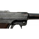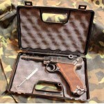 Пистолет упакован в удобный, небольшой пластиковый кейс на клипсах. Кейс внутри оснащён мягкой поролоновой подушкой, на которой размещён пистолет.Пистолет грамотно состарен на заводе и имеет антуражный вид. Деревянные накладки на рукоять выполнены очень точно и грамотно. Ствол заглушен намертво с двух сторон, причём настолько грамотно, что сразу это не увидишь. Для выхода пороховых газов проделано специальное отверстие у основания ствола, возле места стыка ствола и ствольной коробки. Ствол намертво посажен в ствольную коробку и замена его невозможна. Запирание ствола – кривошипно-шатунное. Запирающая система, как и в оригинале, состоит из двух рычагов: шатуна и кривошипа. Предохранитель, как и в оригинале, флажкового типа. Пистолет оснащён однорядным, коробчатым магазином на четыре 9-ти мм холостых патрона.