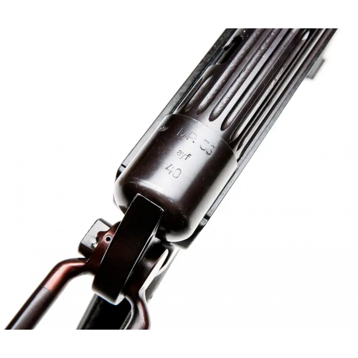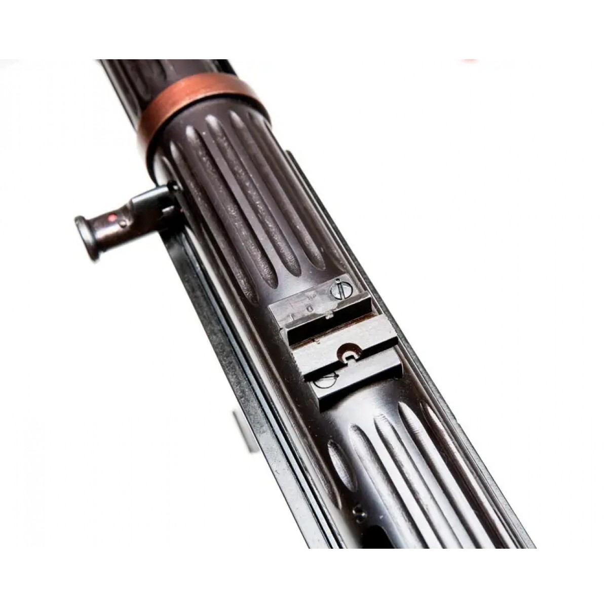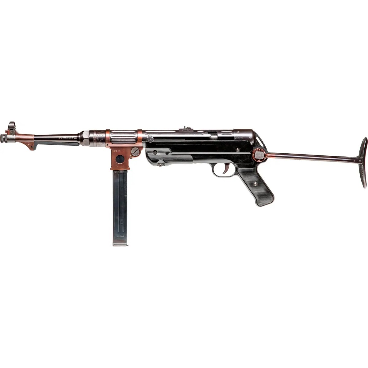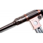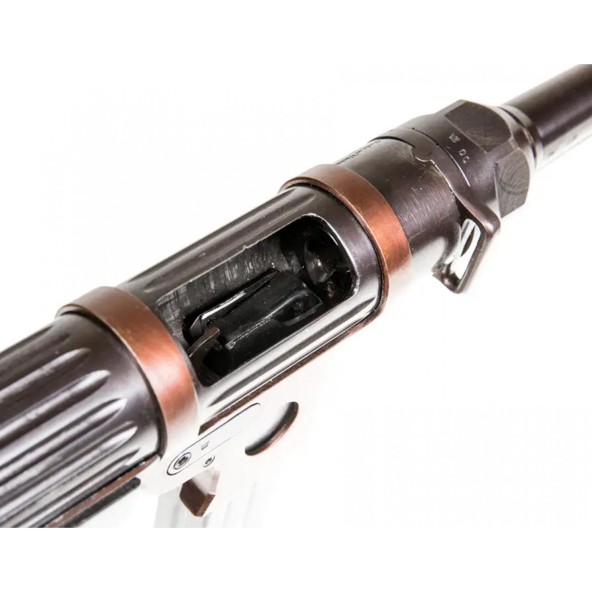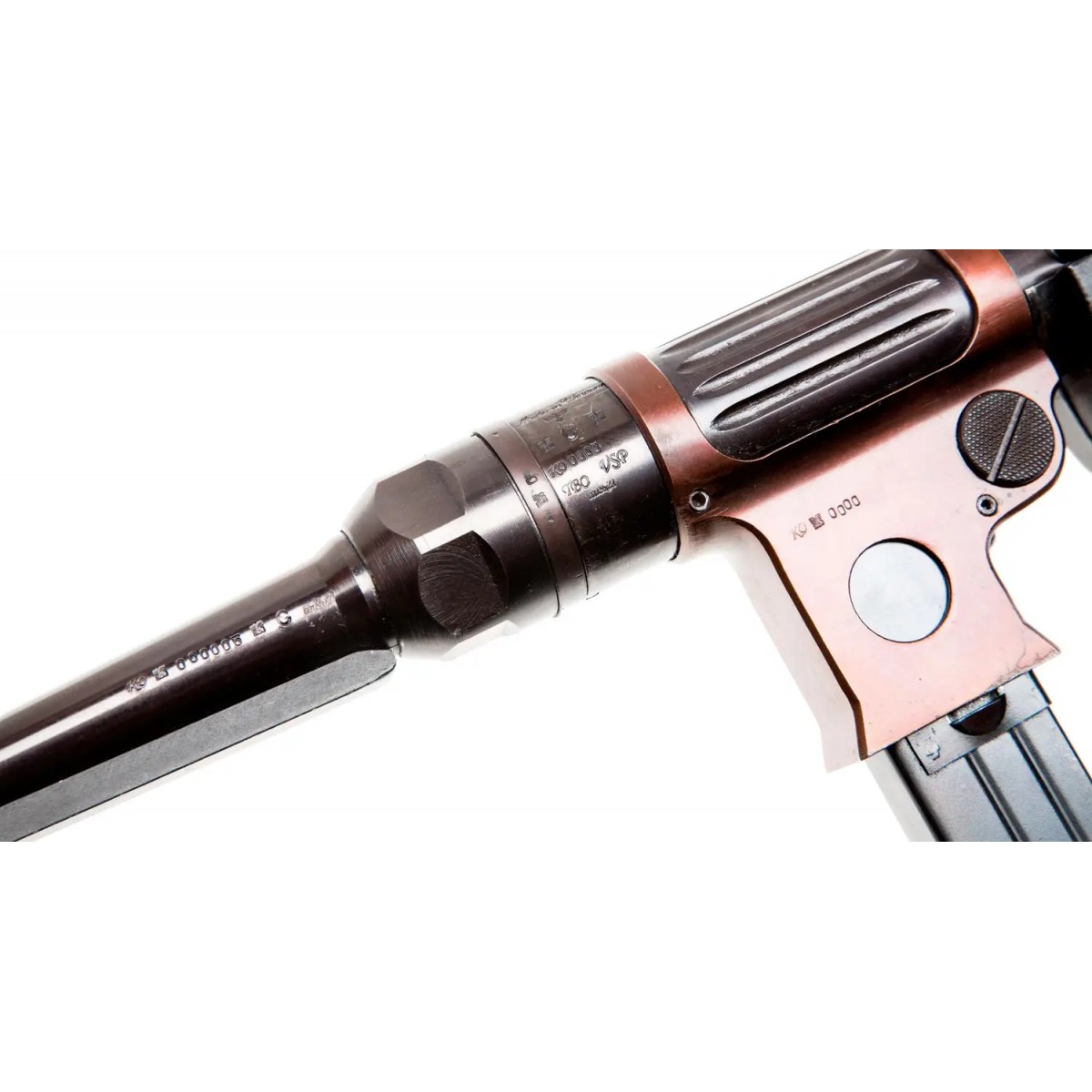 Automatic M.P.38 СХП - современная сигнально-шумовая копия пистолета-пулемета МР38 конструкции Генриха Фольмера, широко известного под названием «шмайссер» и считающегося неотъемлемым атрибутом солдата Вермахта. В свое время М.Р.38 стал первым в мире пистолетом-пулеметом со складным прикладом. В оружии полностью отсутствовали деревянные детали: только металл и пластик (бакелит). У M.P.38 рукоятка перезарядки располагалась слева, что позволяло даже при взведении удерживать его за пистолетную рукоятку правой рукой и направленным в сторону противника. Гнездо магазина, за которое рекомендовалось удерживать оружие при стрельбе, выполнялось фрезерованием. Верхняя часть ствольной коробки пистолета-пулемета была снабжена продольными ребрами жесткости. Пистолет-пулемет имел только автоматический режим ведения огня, но благодаря тормозящему затвор пневматическому демпферу темп стрельбы был умеренный (400 выстрелов в минуту), так что опытный стрелок без усилия отсекал по одному выстрелу. Также следствием как демпфера, так и накола капсюля при неполном выкате затвора являлась плавная работа автоматики, что повысило точность стрельбы и управляемость оружия.