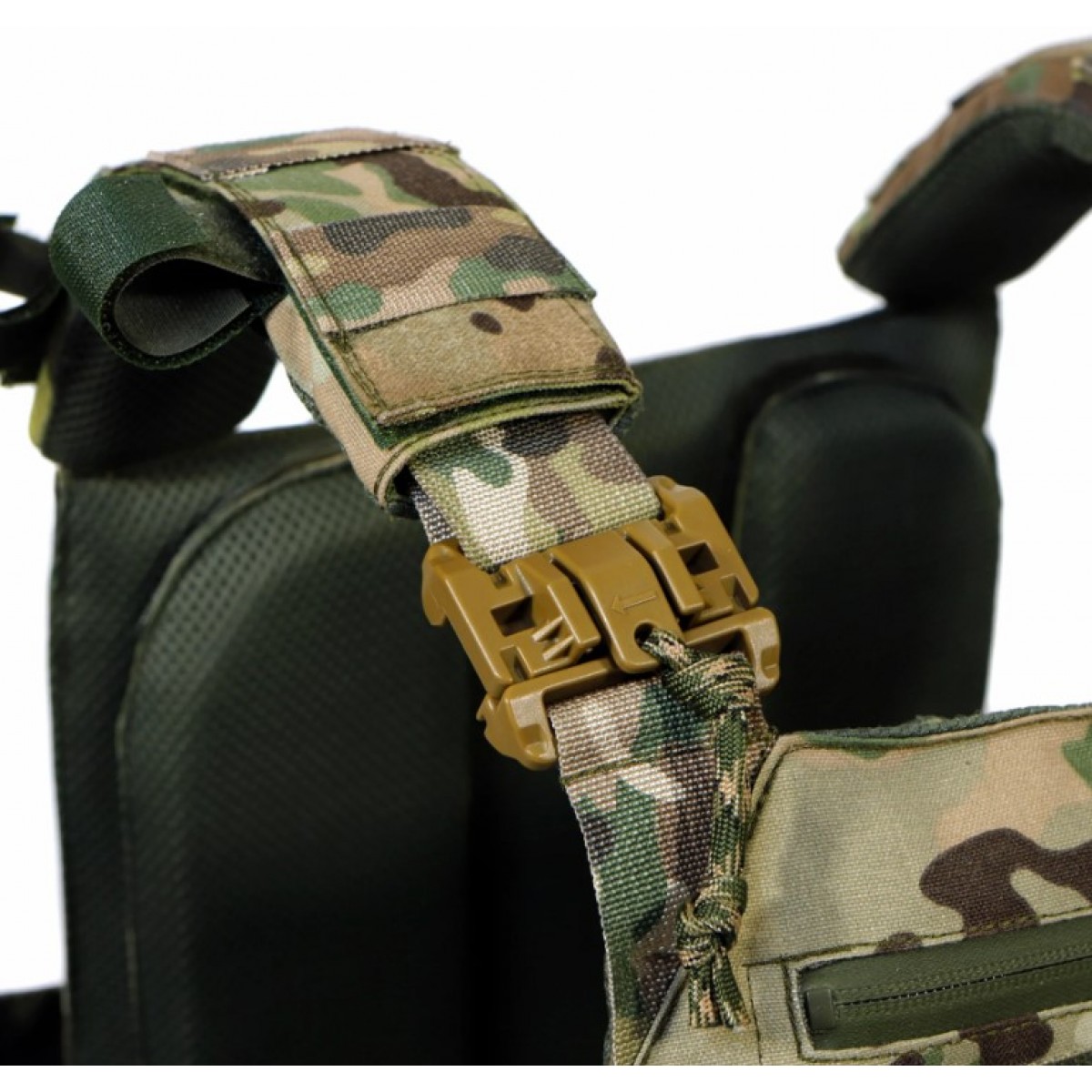 Кроме того, на ремнях есть 3D буферы с сеткой для циркуляции воздуха и максимального комфорта при ношении. Плитоноска Plate Carrier доступна в цвете Multicam (мультикам) и пиксель. Фурнитура качественная, также есть эвакуационная ручка.