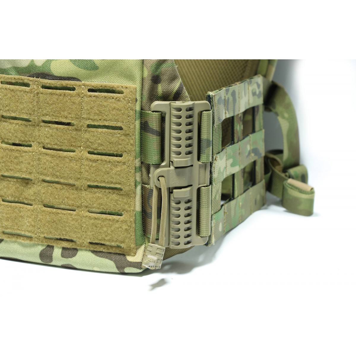 Верхние лямки крепления изготовлены с использованием 3D сетки и демпфера, имеют эргономичную форму, которая распределяет нагрузку, поэтому плитоноска почти не ощутима, то есть не нагружает плечи. Также на плечах установлены пряжки быстрого сброса.