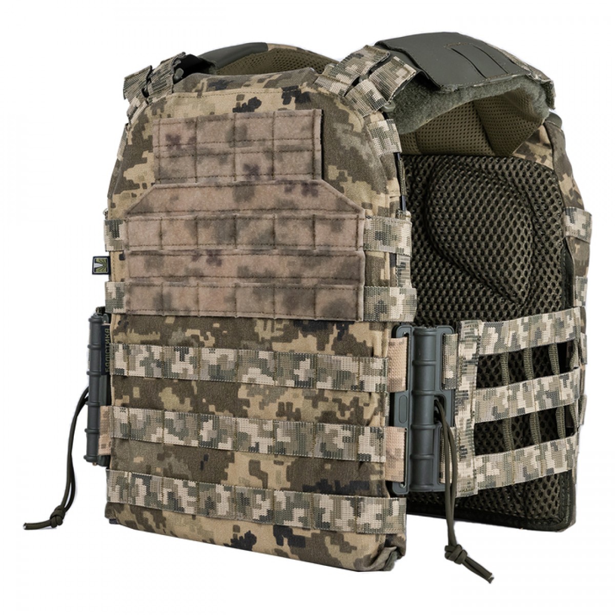Действенное и функциональное изделие от «Баллистики» создано под пластины увеличенного размера. Как и все плитоноски серии Lite, эта модель не имеет встроенного рюкзака под гидратор, однако его можно прикрепить отдельно. В нашем фирменном интернет-магазине можно купить этот продукт по лучшей стоимости и оснастить его дополнительными модулями защиты. ℹ️ Плитоноска совместима с плитами размером L (27×33 см): Анатомическая полиэтиленовая бронеплита с демпфером (3 класс | 1,85 кг | L | 27х33 см | НВМПЕ ✡ Израиль) ТМ Баллистика Бронепластина 3-го класса защиты увеличенная 27*33 см Бронепластина 4-го класса защиты увеличенная 27*33 Основные преимущества плитоноски М3 Pro Lite Продукт отличается рядом важных свойств: Прочность. Все ответственные места на чехле усилены отделочной лентой, что обеспечивает долговечность. Увеличенные плиты. Благодаря большей площади плит изделие подходит бойцам с крупным телосложением, обеспечивает лучшее покрытие верхней части туловища и жизненно важных органов, таких как сердце и легкие. Высокое качество изготовления. М3 Pro Lite изготавливается на программируемом оборудовании, что гарантирует точность исполнения системы MOLLE, надежность швов и соединений. Комфорт. Продуманная конструкция обеспечивает равномерное распределение веса, уменьшение нагрузки на плечи и спину военного. Компоненты плитоноски М3 Pro Lite Плитоноска M3 Pro Lite имеет следующие составляющие: Передние и задние панели для вставки плит. Изделие рассчитано на пластины размером 27×33 см со скошенными верхними углами. Такие плиты поставляются в бронежилетах ВСУ, Нацгвардии, СБУ, НАБУ, ГУР. Также в изделии от «Баллистики» можно использовать плиты SAPI L, ESAPI L. Скелетный камербанд. Крепится с помощью специально разработанной эластичной стропы, которая не рвется даже в растянутом состоянии. Эргономичные верхние лямки. Изготовлены с использованием 3D-сетки и толстого демпфера, распределяют нагрузку и делают плитоноску почти не ощутимой. Имеют вставки из гиполона, которые препятствуют скольжению приклада во время стрельбы. Система экстренного сброса. Запатентованная «Баллистикой» система с элементами стального троса позволяет мгновенно разложить плитоноску на части. Ручка привода находится на уровне груди, легко нащупывается и фиксируется кнопкой. Система MOLLE. Ячейки на фронтальной и тыльной части плитоноски, лямках и камербандах позволяют шнуровать любые подсумки – под магазины, гранаты, аптечки, электронные устройства, средства связи и т. д. На стропу, усиливающую боковой шов, также можно крепить различные мелкие вещи. Широкая панель Velcro. Обеспечивает фиксацию идентификаторов, а также служит креплением для модуля защиты шеи. Демпфер. Внутренняя часть плейт керриер имеет 15-миллиметровую демпферную основу – 3D-сетку толщиной 5 мм и подушки из EVA-пены толщиной 10 мм. Они обеспечивают качественную вентиляцию, отвод лишнего тепла и при этом значительно уменьшают запреградную деформацию. Технические характеристики Вес чехла: 1100 г. Материал: нейлон (Cordura 1000D), 3D-сетка, гиполон. Стропа: полиамид нейлон. Липучка: Velcro® Alfatex. Фурнитура: 2M (Италия), Ammolit Plus (Украина). Особенности: с быстрым сбросом; без плит. Размер: регулируемый (по талии 60-120 см). Под бронеплиты: L 27×33 см.Отзывы о Плитоноска М3 Pro Lite (XL 27х33 см) (ММ-14) с системой быстрого сброса