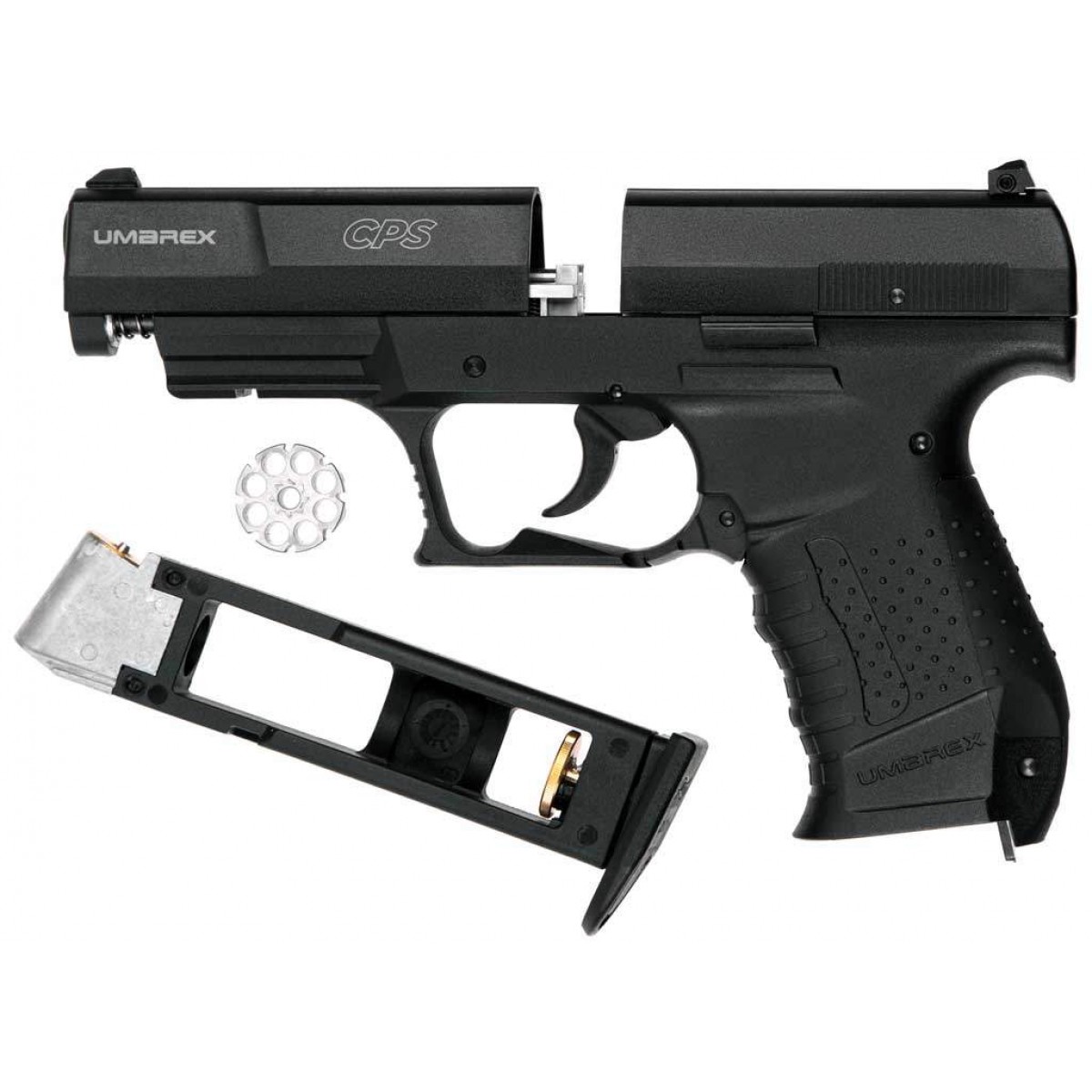 Umarex C · P · S — недорогой пистолет начального уровня, работающий на углекислом газе, но он не снижает точности. Быстросьёмный магазин позволяет легко заменять капсулы с CO₂. Рама имеет планку Вивера для аксессуаров, таких как фонарь либо лазерный целеуказатель.