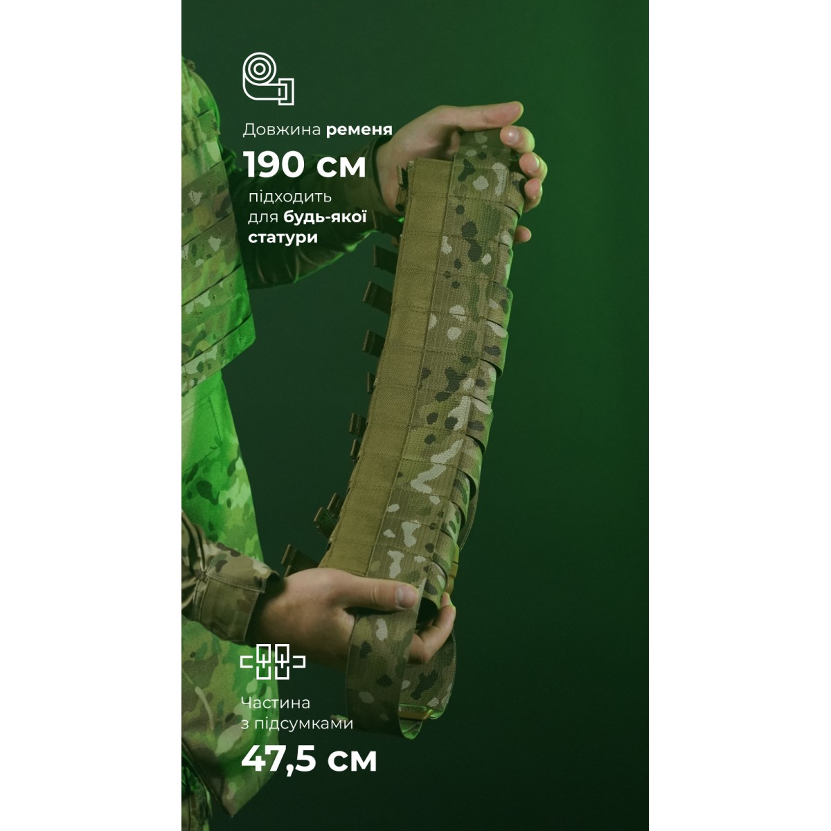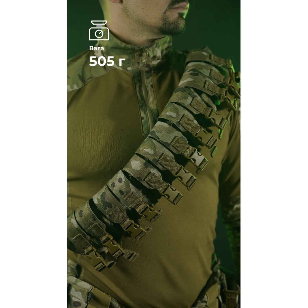 Бандольера предназначена для переноски 40-миллиметровых гранат в ходе боя и во время выполнения других задач. Она позволяет надежно фиксировать боекомплект и не требует изменений в основном комплекте снаряжения – достаточно просто перекинуть ее через плечо. ✅ Ключевые преимущества Вместит 12 гранат калибра 40 мм для подствольных гранатометов Регулируемая фиксация боеприпасов в отдельных подсумках Совместима с плитоносками или бронежилетами Длина ремня (190 см) подходит для любого телосложения, бронежилетов или зимней одежды Можно носить через плечо или на поясе Можно комбинировать две бандольеры Жесткая конструкция не дает изделию перекручиваться под тяжестью гранат, держит форму Полиамидная стропа + Cordura 1000D, выносливая фурнитура WJ, AMM Описание товара «Пращ» предназначен для военнослужащих, которые имеют на вооружении подствольные или другие 40-миллиметровые гранатометы. Состоит из 12 отдельных подсумков, нашитых на широкий ремень. Каждый подсумок закрывается клапаном с фастексом. Стропа на фастексе регулируется, что позволяет настроить плотность фиксации боеприпасов. Застежки типа фастекс не только обеспечивают быстрый доступ к гранатам, но и существенно увеличивают выносливость изделия – они не боятся влаги, пыли и не изнашиваются так быстро, как липучка. Ремень (190 см) оснащен фастексом и двумя двухщелевыми пряжками для регулировки длины. Благодаря достаточной длине бандольера подходит для бойцов с крупным телосложением, под большие бронежилеты и объемные зимние куртки. Изделие можно носить как через плечо, так и на поясе. При необходимости можно комбинировать сразу две бандольеры, например крест-накрест на груди. Основа бандольеры жесткая, поскольку сшита из прочной полиамидной стропы и Cordura 1000D. Это помогает ей держать форму и не перекручиваться под тяжестью боекомплекта. ❓ Часто задаваемые вопросы Совместим ли «Пращ» с другим снаряжением? Да, его можно сочетать с плитоносками или бронежилетами – он не мешает основным элементам снаряжения и не дублирует их функции, а наоборот, расширяет возможности для ношения боекомплекта. Его можно быстро надевать или снимать вне зависимости от основного снаряжения. Не выпадают ли гранаты во время движения или бега? Нет. Каждый подсумок имеет клапан с фастексом и регулируемую стропу, которая позволяет надежно закрепить боекомплект. Объем подсумка позволяет плотно посадить гранату без люфта. Можно ли использовать «Пращ» для других типов боеприпасов? Бандольера создана специально под 40-мм гранаты. Другие боеприпасы или снаряжение могут не соответствовать размеру, поэтому «Баллистика» не гарантирует совместимость. Есть ли версия для левшей? Конструкция универсальна и подходит как для праворуких, так и для леворуких бойцов. Благодаря регулируемой длине ремня ее легко настроить под удобный угол ношения. Предусмотрено ли крепление на систему MOLLE? Нет. Бандольера не имеет системы MOLLE – она самодостаточна и не требует дополнительного крепления. Ее главное преимущество – быстрое надевание и сброс. Как ухаживать за бандольерой? Чтобы сохранить долговечность и функциональность материала, нужно периодически очищать изделие от загрязнений мягкой щеткой или протирать влажной тканью. Допускается мойка под проточной водой. Стирать изделие в стиральной машинке категорически 