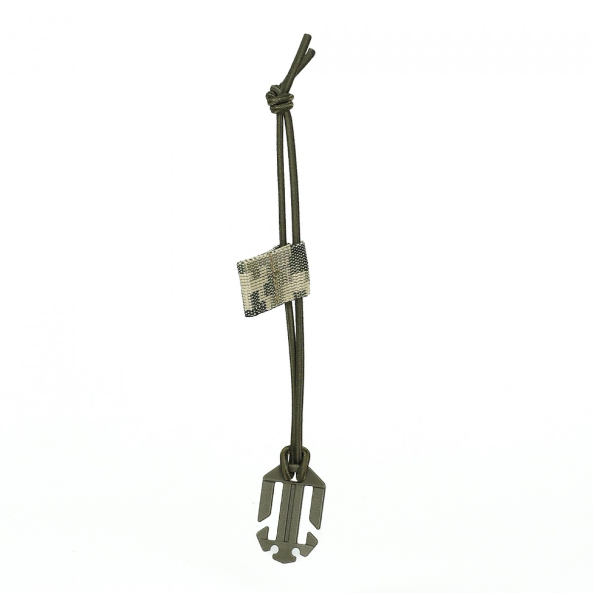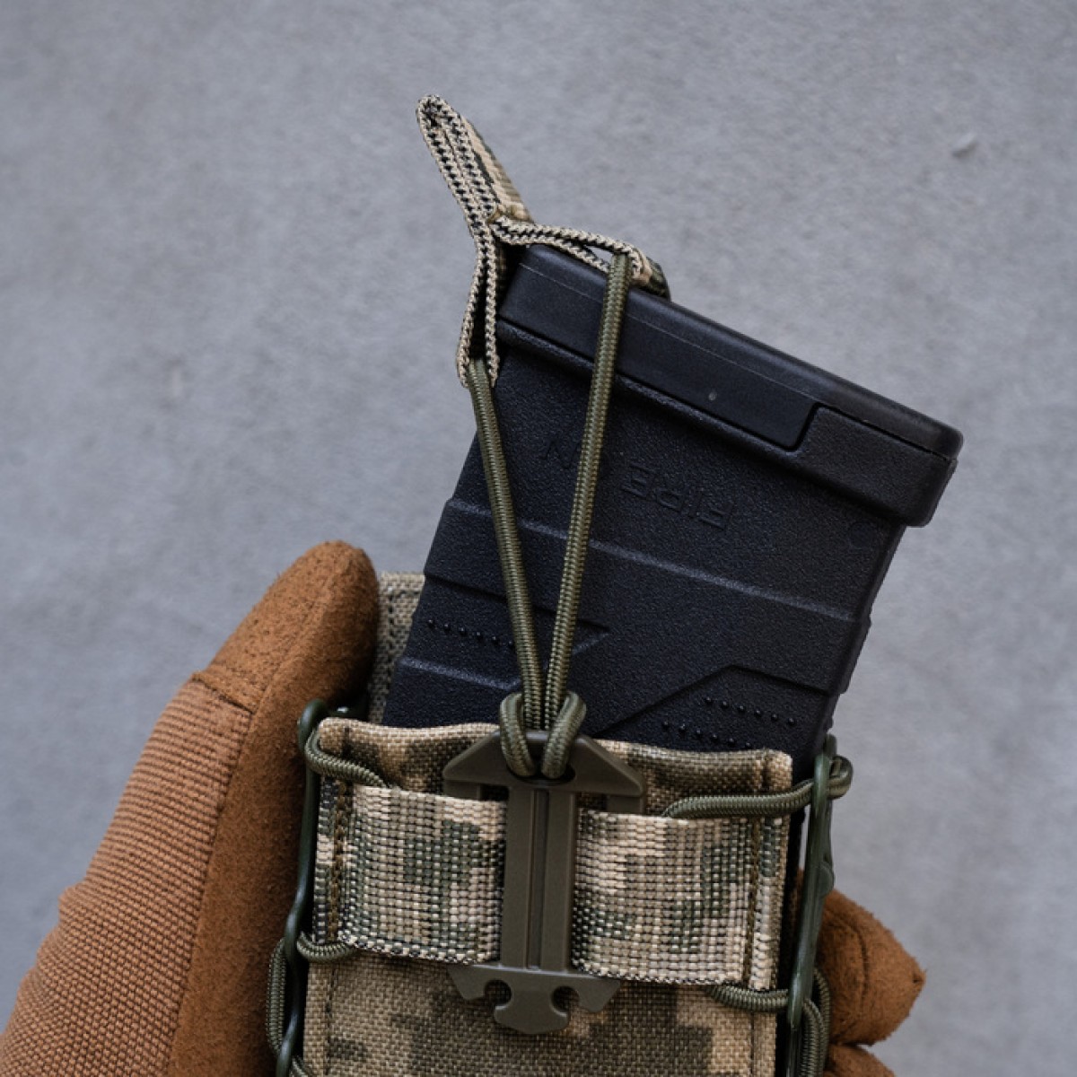 Подсумок для магазинов АК/AR «Колчан» крепко держит магазин даже без верхних фиксирующих элементов. Он не выпадает при активных боевых действиях, быстром передвижении по пересеченной местности, даже при прыжках с парашютом – проверено бойцами спецподразделения. Однако, если вы хотите еще большей уверенности в надежности фиксации, можете воспользоваться отдельным креплением. Особенности изделия Крепление к «Колчану» предназначено дополнительно зафиксировать магазин в подсумке. Его можно хранить в небольшом кармашке и надевать при необходимости. Фиксатор состоит из эластичного шнурка, доминатора из прочного пластика и ручки из стропы. Доминатор вставляется под ячейки MOLLE на передней панели подсумка, а концы шнурка завязываются узлом на ячейках с другой стороны. При этом ручка накладывается на более высокий угол магазина. Когда его нужно достать, шнурок ручкой отводят в сторону. Простая и надежная конструкция фиксатора позволяет удобно закреплять не только магазины в подсумке, но и подвешивать к снаряжению турникеты, мультитулы, фонарики и другие мелочи, к которым нужен быстрый доступ.Отзывы о Фиксатор к подсумкам для магазинов АК/AR "Колчан" (ММ14)