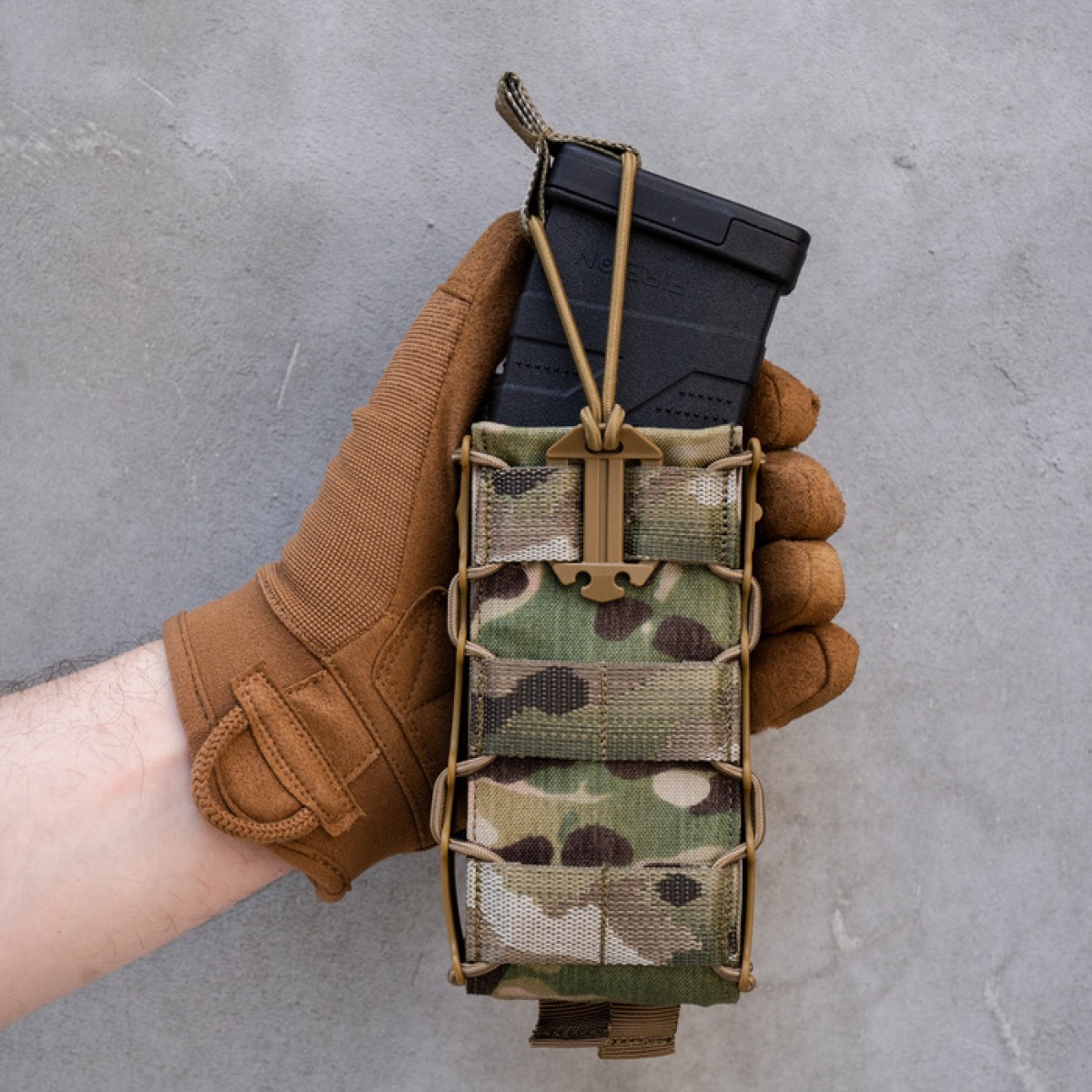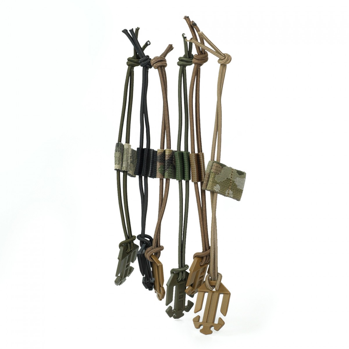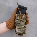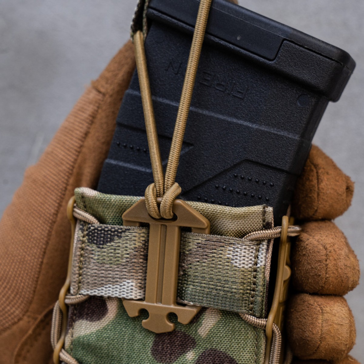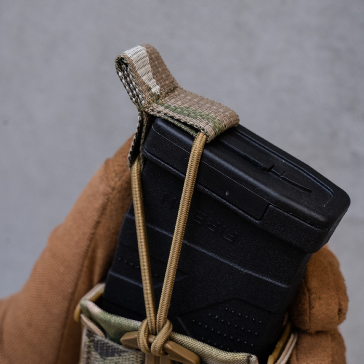 Подсумок для магазинов АК/AR «Колчан» крепко держит магазин даже без верхних фиксирующих элементов. Он не выпадает при активных боевых действиях, быстром передвижении по пересеченной местности, даже при прыжках с парашютом – проверено бойцами спецподразделения. Однако, если вы хотите еще большей уверенности в надежности фиксации, можете воспользоваться отдельным креплением. Особенности изделия Крепление к «Колчану» предназначено дополнительно зафиксировать магазин в подсумке. Его можно хранить в небольшом кармашке и надевать при необходимости. Фиксатор состоит из эластичного шнурка, доминатора из прочного пластика и ручки из стропы. Доминатор вставляется под ячейки MOLLE на передней панели подсумка, а концы шнурка завязываются узлом на ячейках с другой стороны. При этом ручка накладывается на более высокий угол магазина. Когда его нужно достать, шнурок ручкой отводят в сторону. Простая и надежная конструкция фиксатора позволяет удобно закреплять не только магазины в подсумке, но и подвешивать к снаряжению турникеты, мультитулы, фонарики и другие мелочи, к которым нужен быстрый доступ.Отзывы о Фиксатор к подсумкам для магазинов АК/AR "Колчан" (Мультикам)