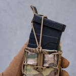 Подсумок для магазинов АК/AR «Колчан» крепко держит магазин даже без верхних фиксирующих элементов. Он не выпадает при активных боевых действиях, быстром передвижении по пересеченной местности, даже при прыжках с парашютом – проверено бойцами спецподразделения. Однако, если вы хотите еще большей уверенности в надежности фиксации, можете воспользоваться отдельным креплением. Особенности изделия Крепление к «Колчану» предназначено дополнительно зафиксировать магазин в подсумке. Его можно хранить в небольшом кармашке и надевать при необходимости. Фиксатор состоит из эластичного шнурка, доминатора из прочного пластика и ручки из стропы. Доминатор вставляется под ячейки MOLLE на передней панели подсумка, а концы шнурка завязываются узлом на ячейках с другой стороны. При этом ручка накладывается на более высокий угол магазина. Когда его нужно достать, шнурок ручкой отводят в сторону. Простая и надежная конструкция фиксатора позволяет удобно закреплять не только магазины в подсумке, но и подвешивать к снаряжению турникеты, мультитулы, фонарики и другие мелочи, к которым нужен быстрый доступ.Отзывы о Фиксатор к подсумкам для магазинов АК/AR "Колчан" (Мультикам неоригинальный)