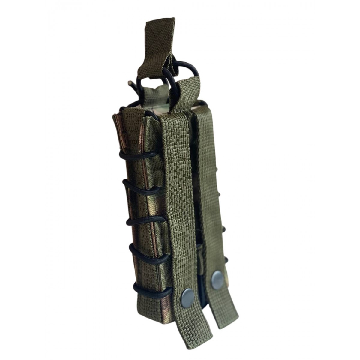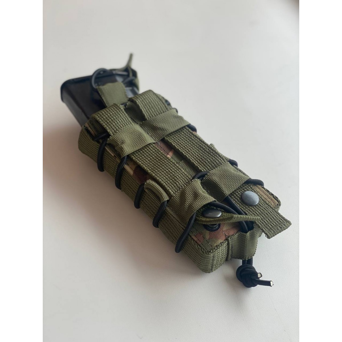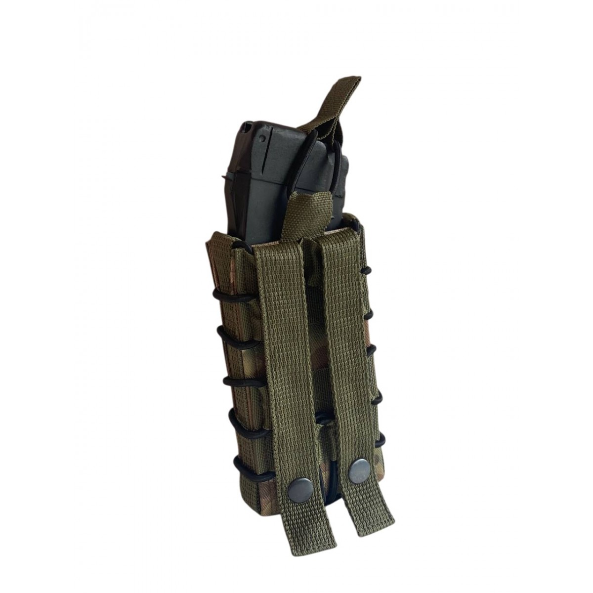 Одинарный подсумок для магазина АК изготовлен из качественных материалов и оснащен стандартным креплением MOLLE, усиленным кнопками, что позволяет использовать его с любыми серийными разгрузочными системами, тактическими поясами и бронежилетами. Магазин сверху фиксируется резинкой для быстрой перезарядки, с запасом длины для различных нужд.