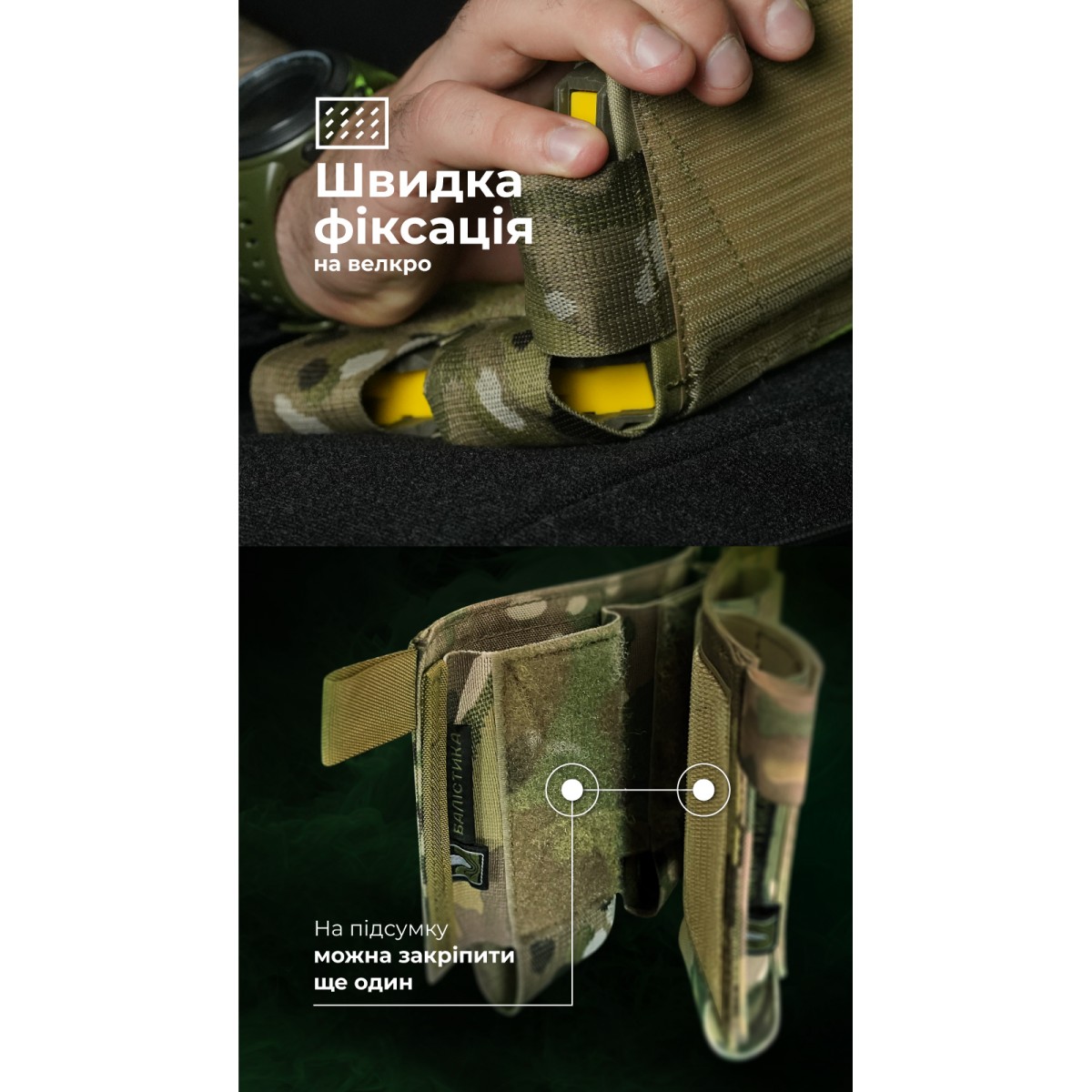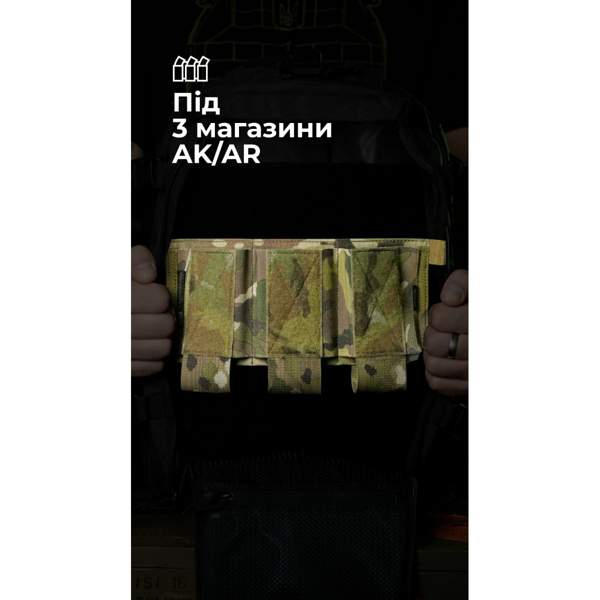 Эластичный и выносливый подсумок подходит для хранения магазинов AK/AR ✅ Ключевые преимущества 3 секции под магазины AK/AR Быстрая фиксация на велкро-панель Можно закрепить несколько подобных подсумков друг поверх друга Совместим со штурмовым рюкзаком «Штормар» Выносливые материалы – Cordura 500D, полиамидная стропа Описание товара Подсумок (26×14,5 см) состоит из трех секций, пришитых к гибкой платформе и разделенных швами. Каждая секция открыта, а ее дно сформировано из широкой стропы. Плотность удержания обеспечивается благодаря эластичной тесьме, из которой изготовлена передняя часть подсумка. Крепится к снаряжению на липучку (24×10 см). Сверху с обеих сторон предусмотрены петли для более легкого отрыва от снаряжения. Впереди на каждом отсеке помещена велкро-панель (5×10 см). На них можно закрепить еще один такой подсумок под магазины. Благодаря отсутствию жестких элементов не занимает много места в сложенном виде. ❓ Часто задаваемые вопросы Совместим ли подсумок с системой MOLLE? Нет, этот подсумок может крепиться только на велкро-панель. Можно ли крепить подсумок на снаряжении по вертикали или диагонали? Да, подсумок можно фиксировать в разных положениях на велкро-панели, если вам так удобно. Можно ли стирать подсумок? Да, можно стирать вручную или очищать мягкой щеткой с водой и бесфосфатным порошком.Отзывы о Подсумок для магазинов “Трискель” (3 магазина | Велкро | Мультикам) ТМ Баллистика