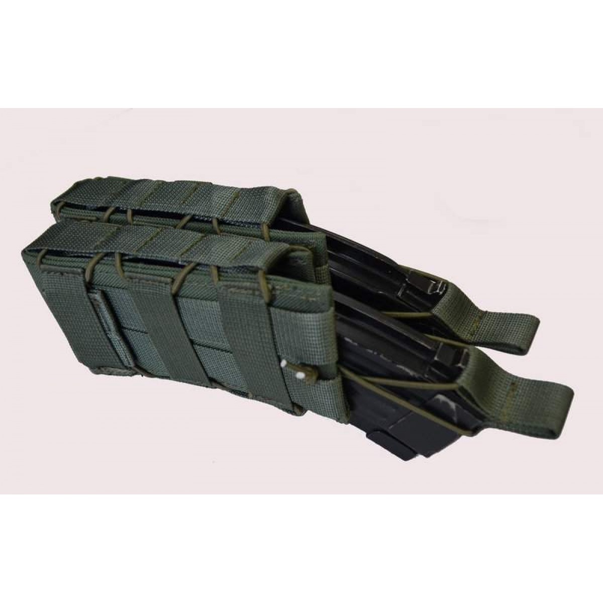 - В верхней части подсумка расположена резинка, имеющая сшитую ременную ленту, которая прижимает верхнюю часть магазина - это обеспечивает дополнительную фиксацию магазина и делает надежнее его ношение.
