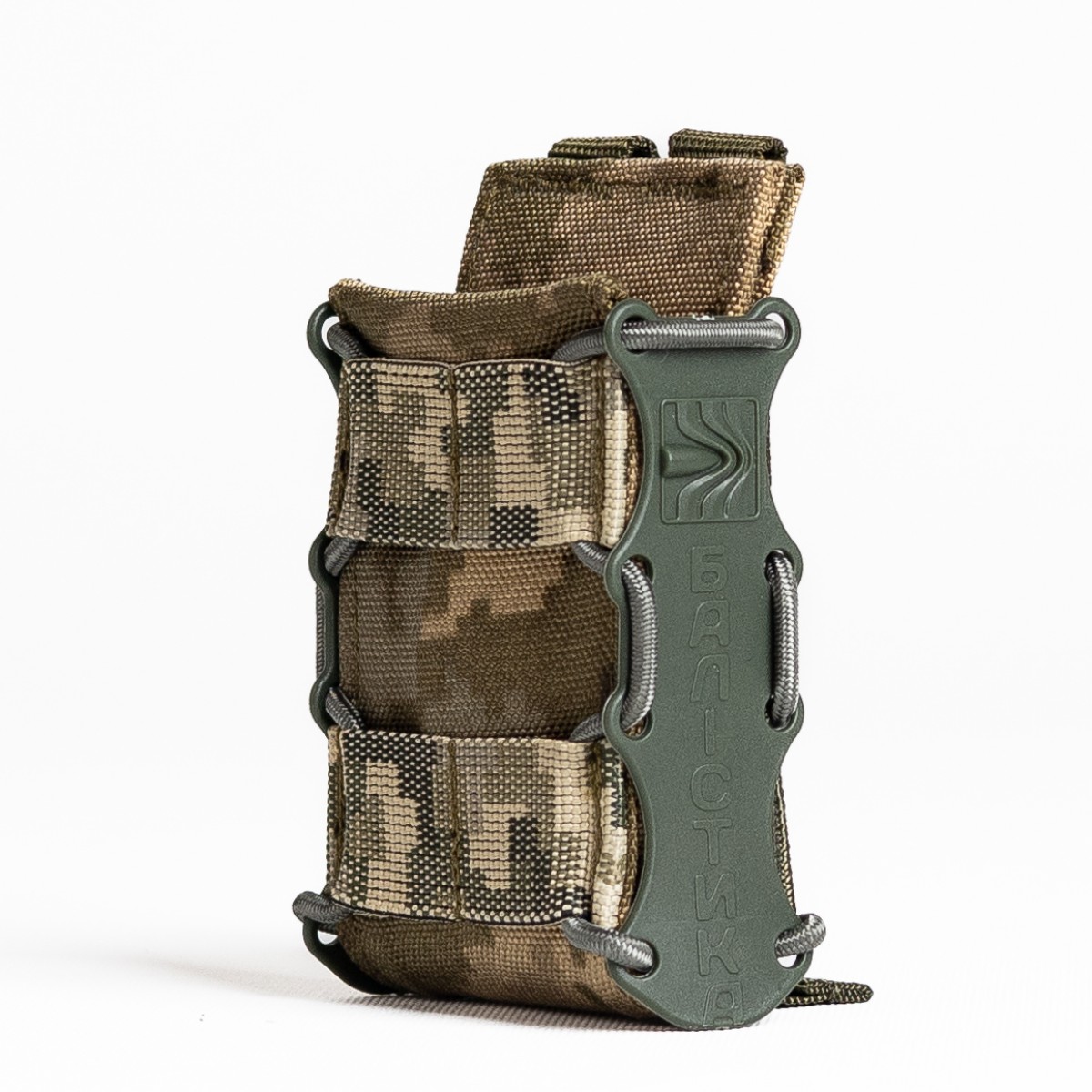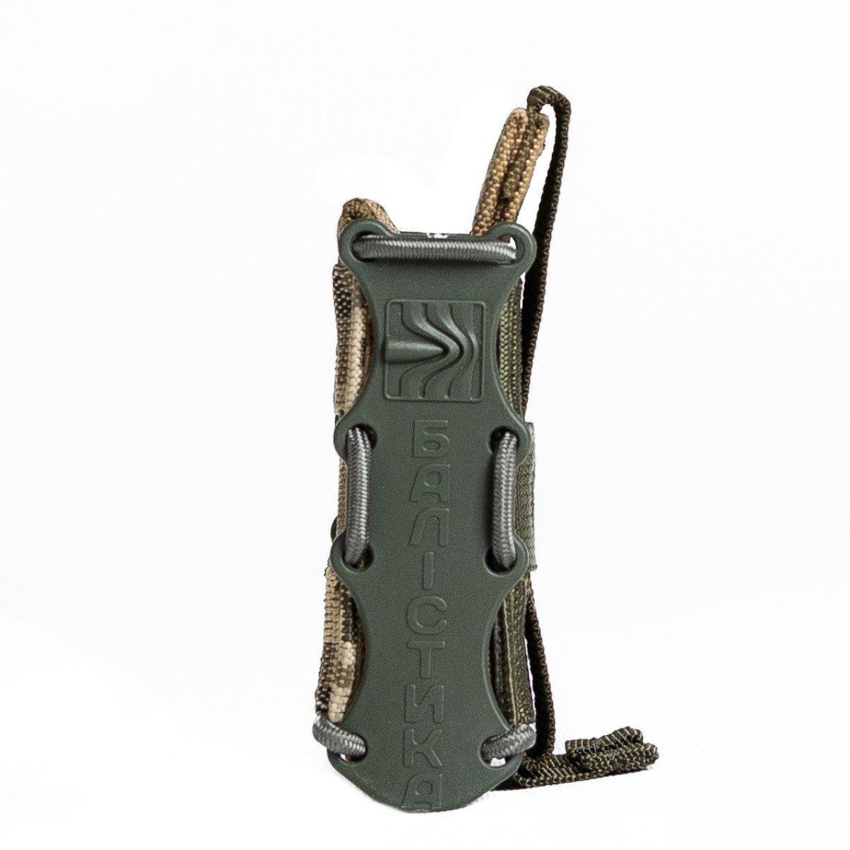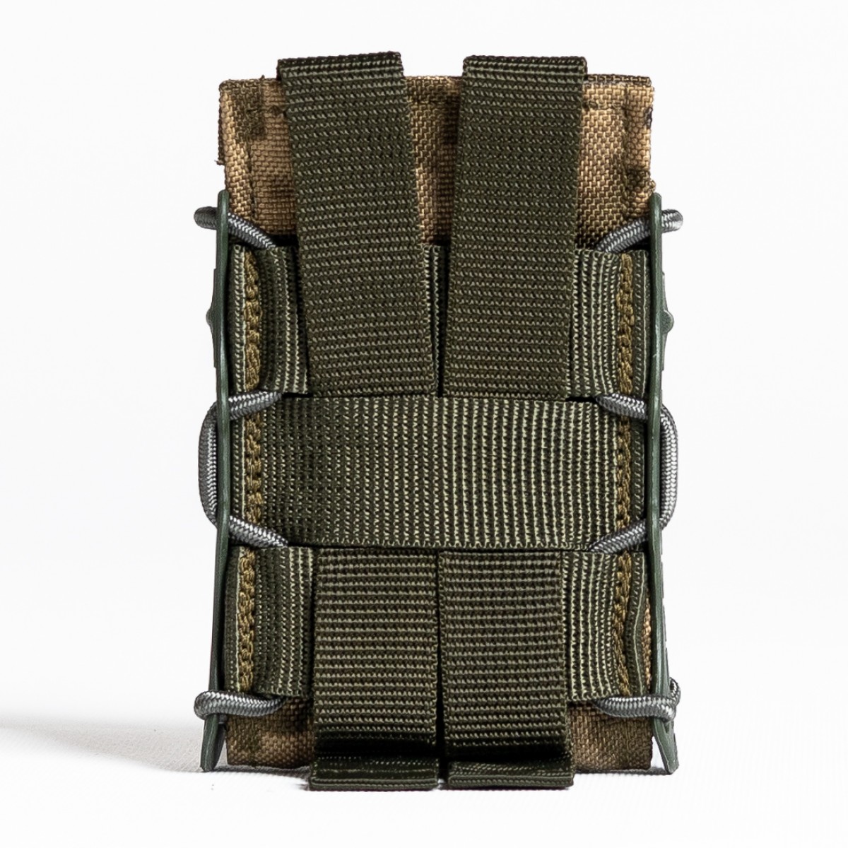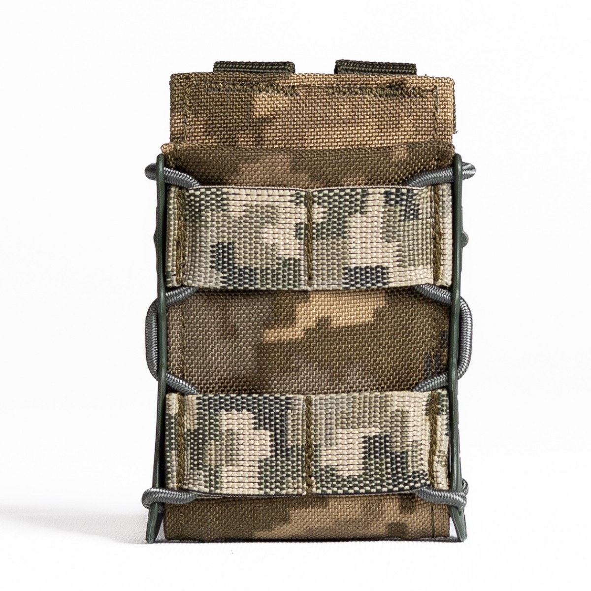 Одинарный подсумок «Колчан» в размере мини предназначен для ношения заполненных магазинов АК/AR. Он предоставляет оперативный доступ к боеприпасам, не занимает много места на снаряжении и при этом обеспечивает надежную фиксацию. Особенности подсумка Подсумок под магазины АК и AR Мини «Колчан» отличается от стандартной модели лишь укороченным размером, остальные его характеристики остались неизменными: Благодаря тому что в этом подсумке уменьшена высота, большая часть магазина остается открытой. Это позволяет легче ухватить его рукой, а соответственно, ускорить перезарядку. Задняя стенка выше передней, что позволяет быстро, почти вслепую вставлять и доставать магазин. Несмотря на небольшую зону контакта подсумка с магазином, боковые пластиковые стенки и плотная резинка обеспечивают ту же непревзойденную прочность удержания. Благодаря возможности отрегулировать натяжение резинки каждый стрелок может подобрать оптимальную для него жесткость фиксации магазина. Компактная форма позволяет разместить на снаряжении сразу несколько подсумков подряд, без пропуска ячеек MOLLE. Ведь пластиковые элементы не выступают за их границы и соседние подсумки не мешают друг другу. Стропы на задней части подсумка позволяют шнуровать его не только на систему MOLLE, но и на ремень. На передней панели также размещены ячейки, что позволяет прикрепить сверху другие колчаны для создания двойных подсумков. Технические характеристики Материал: Cordura 500D\1000D. Материал стенки: полиамид. Внутренняя часть: формованный пластик. Размеры: Ширина: 7,5 см. Толщина: 3 см. Высота передней стенки: 9 см. Высота задней стенки: 11 см.Отзывы о Подсумок под магазины АК/AR Мини "Колчан" (ММ14)