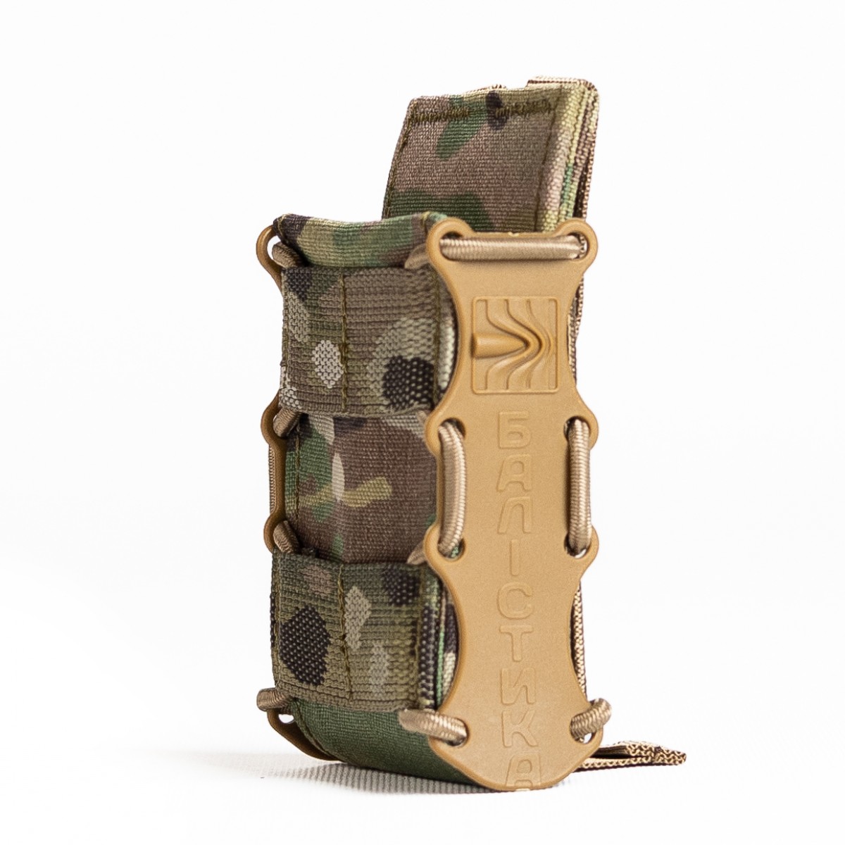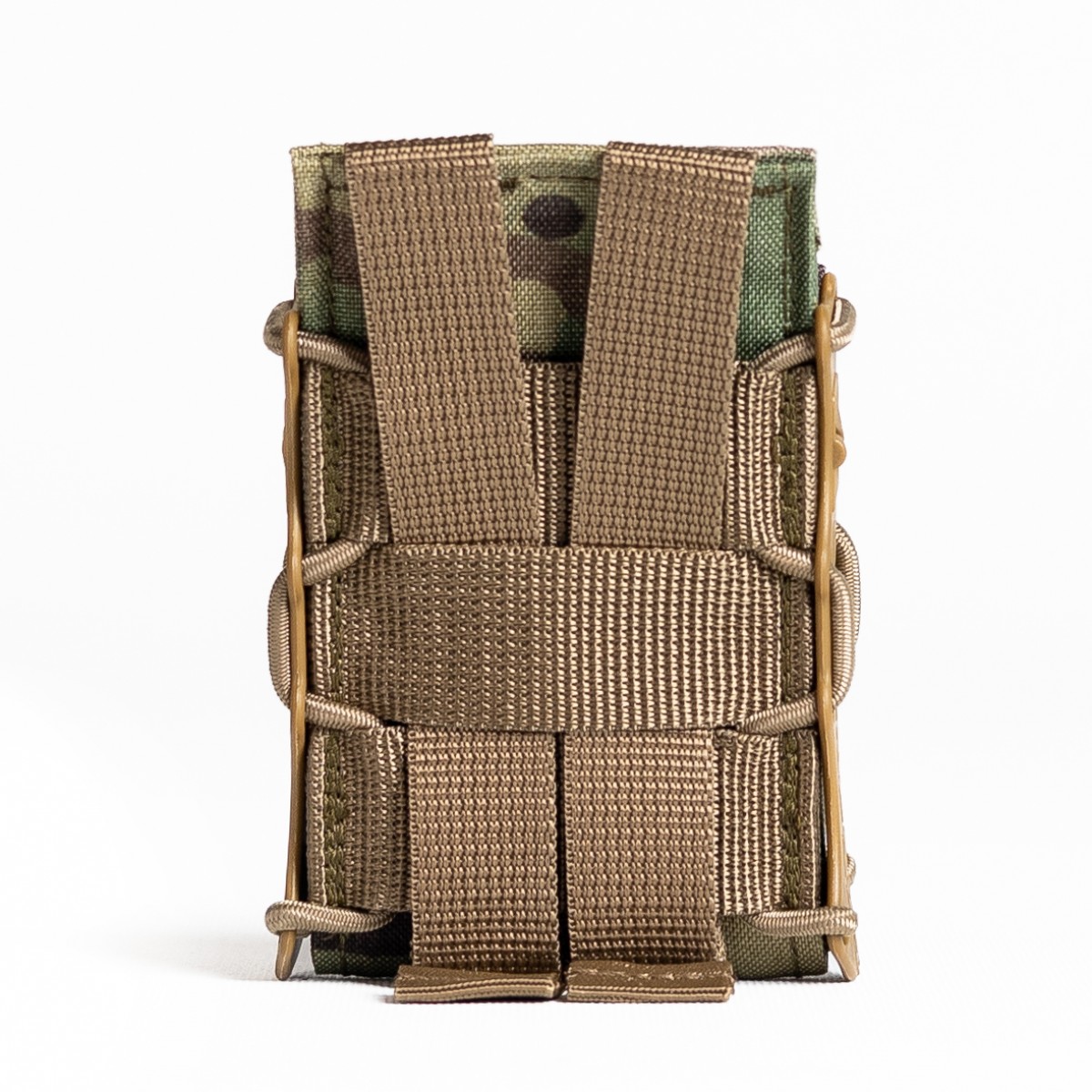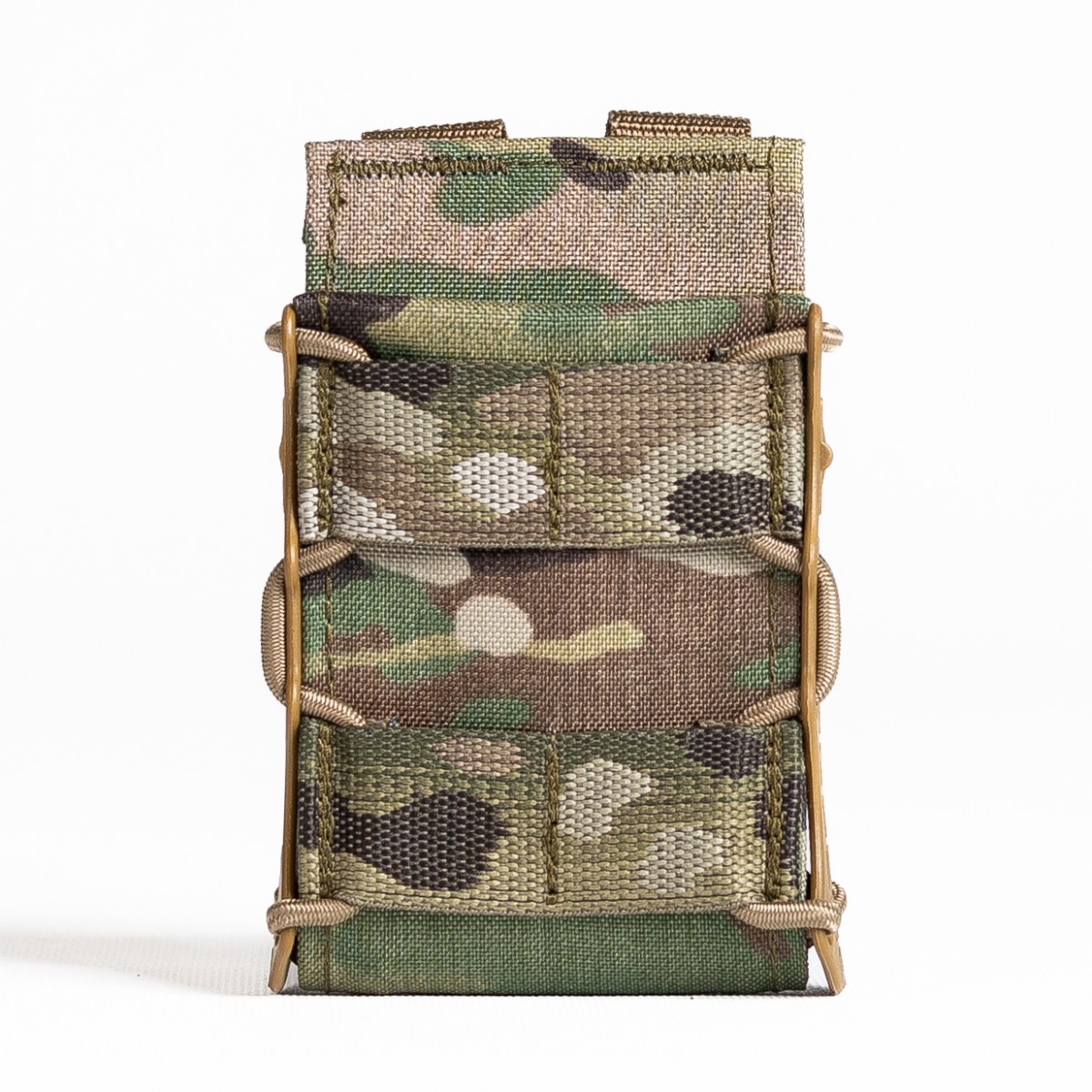Одинарный подсумок «Колчан» в размере мини предназначен для ношения заполненных магазинов АК/AR. Он предоставляет оперативный доступ к боеприпасам, не занимает много места на снаряжении и при этом обеспечивает надежную фиксацию. Особенности подсумка Подсумок под магазины АК и AR Мини «Колчан» отличается от стандартной модели лишь укороченным размером, остальные его характеристики остались неизменными: Благодаря тому что в этом подсумке уменьшена высота, большая часть магазина остается открытой. Это позволяет легче ухватить его рукой, а соответственно, ускорить перезарядку. Задняя стенка выше передней, что позволяет быстро, почти вслепую вставлять и доставать магазин. Несмотря на небольшую зону контакта подсумка с магазином, боковые пластиковые стенки и плотная резинка обеспечивают ту же непревзойденную прочность удержания. Благодаря возможности отрегулировать натяжение резинки каждый стрелок может подобрать оптимальную для него жесткость фиксации магазина. Компактная форма позволяет разместить на снаряжении сразу несколько подсумков подряд, без пропуска ячеек MOLLE. Ведь пластиковые элементы не выступают за их границы и соседние подсумки не мешают друг другу. Стропы на задней части подсумка позволяют шнуровать его не только на систему MOLLE, но и на ремень. На передней панели также размещены ячейки, что позволяет прикрепить сверху другие колчаны для создания двойных подсумков. Технические характеристики Материал: Cordura 500D\1000D. Материал стенки: полиамид. Внутренняя часть: формованный пластик. Размеры: Ширина: 7,5 см. Толщина: 3 см. Высота передней стенки: 9 см. Высота задней стенки: 11 см.Отзывы о Подсумок под магазины АК/AR Мини "Колчан" (Мультикам)