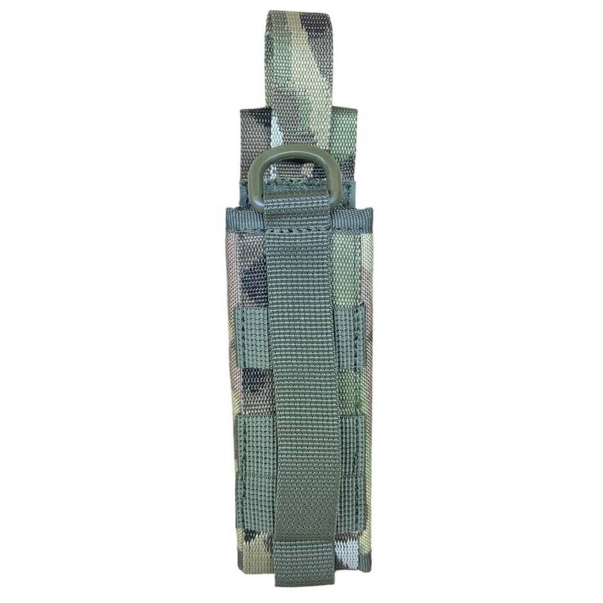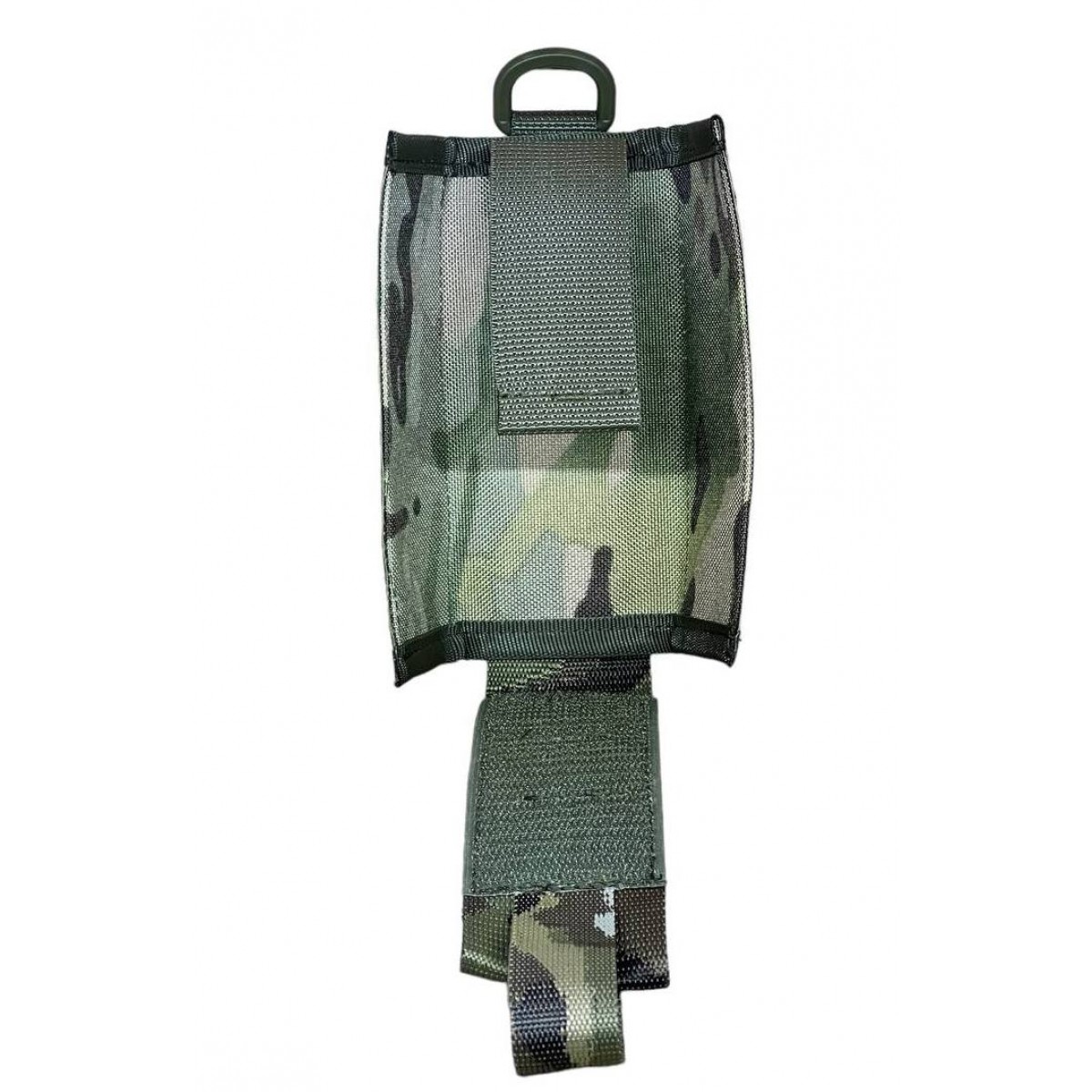 К снаряжению крепится с помощью системы MOLLE, расположенной на задней стенке, или пластикового полукольца.