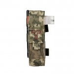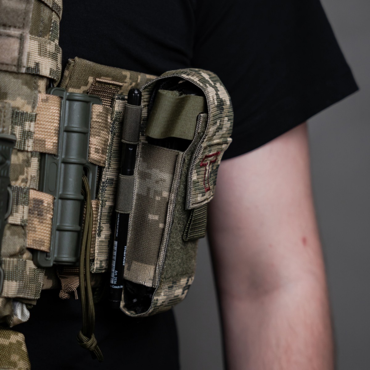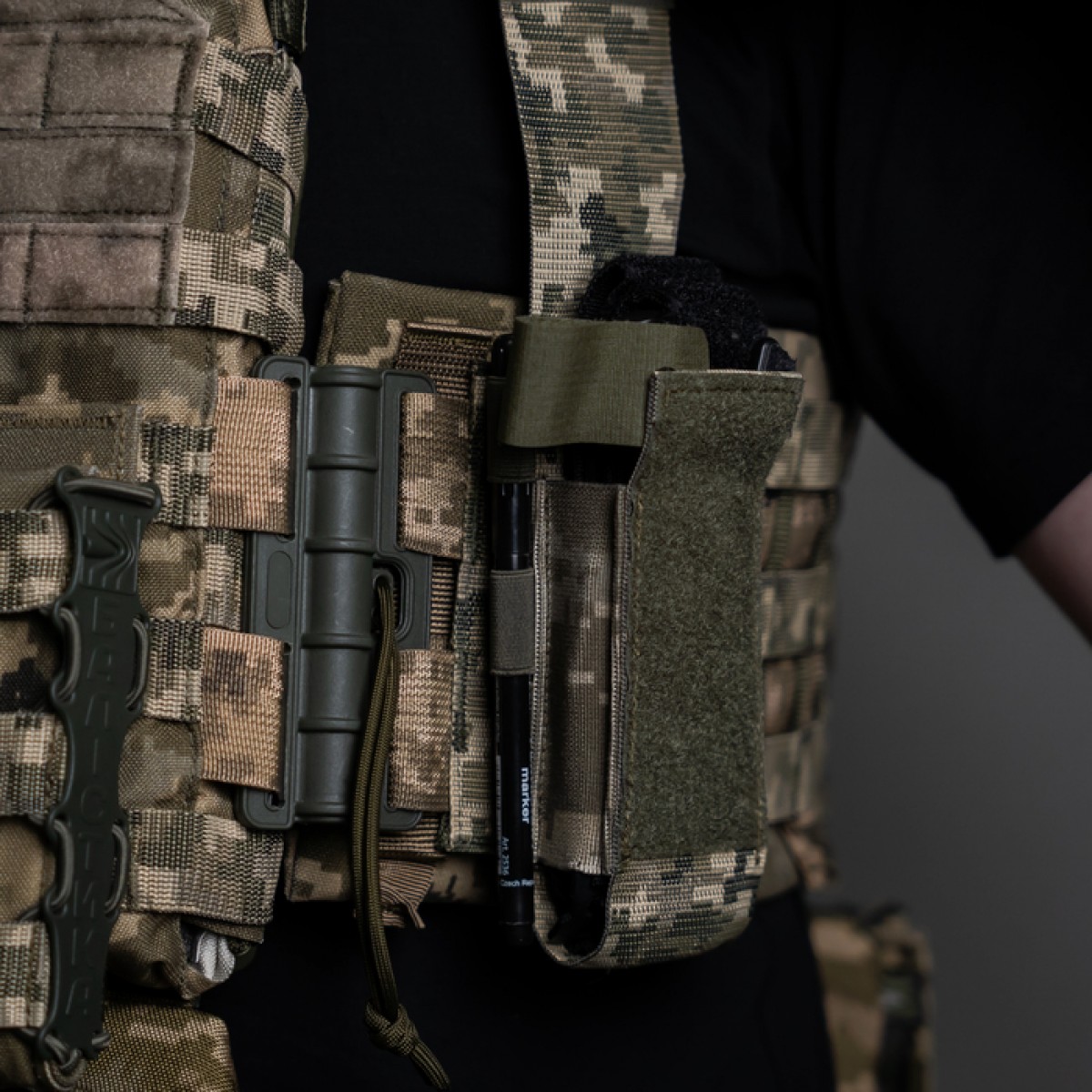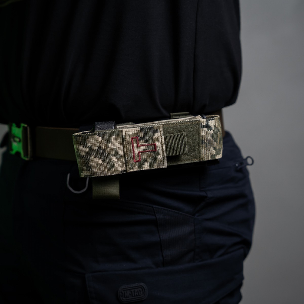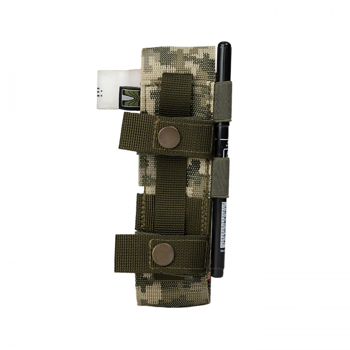 От быстрого доступа к турникету буквально зависит жизнь воина. «Баллистика» разработала качественный и практичный турникетный подсумок и позаботилась о его максимальном удобстве. Особенности товара Подсумок почти полностью закрывает турникет, однако его конструкцией предусмотрены боковые отверстия сверху и снизу. На клапане, которым он закрывается, вышита буква «Т», чтобы точно не спутать с подсумками другого назначения. К другим отличительным признакам этого изделия относятся следующие: Длинный клапан (14,5 см) на липучке можно приспособить к длине турникета благодаря регулируемой фиксации. Язычок на конце клапана облегчает открывание, и это можно сделать одной рукой. Боковины изделия изготовлены из эластичного материала, что позволяет ему адаптироваться к объему содержимого. Задняя стенка усилена двойным слоем прочной ткани, что помогает ей держать форму. Подсумок крепится к снаряжению на одну стропу системы MOLLE. При этом удлиненные свободные концы двух ячеек могут служить креплениями для ножниц и фиксируются липучкой и кнопкой. За хлястики с кнопкой изделие также можно вешать на ремень в горизонтальном положении. Сбоку помещены две резинки для маркера, которым указывается время установки турникета. Благодаря узкому и компактному дизайну можно прикрепить сразу несколько таких подсумков там, где не поместятся другие. Это позволит всегда иметь под рукой необходимое количество турникетов. Технические характеристики Ременная стропа: полиамид, 2; 2,5; 5 см. Фурнитура: латунные кнопки. Липучка: Velcro. Размеры закрытого подсумка: 5×16 см. Вес: 70 г.Основные характеристики Подсумок под турникет закрытый gen. 2.0 (ММ-14)