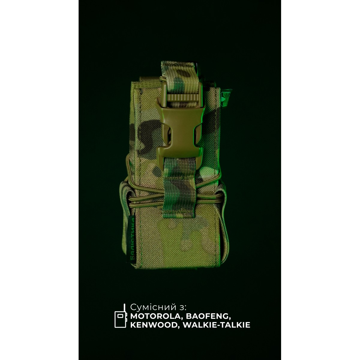 «Вестун» разработан для удобного размещения портативной радиостанции и может адаптироваться под популярные модели разных брендов. ✅ Ключевые преимущества Совместим с радиостанциями Motorola, Baofeng, Kenwood, Walkie-Talkie Приспосабливается к габаритам устройства Есть доступ к основным кнопкам без необходимости доставать рацию из подсумка или крепить гарнитуру Пластиковые вставки поддерживают устойчивую форму С фастексом рация надежно удерживается внутри Легкий и компактный, занимает на снаряжении ширину двух ячеек молли Выносливые материалы – нейлон 1000D (аналог Cordura), полиамидная стропа – и прочная фурнитура WJ (Южная Корея) Описание товара Универсальный адаптивный подсумок упростит работу с рацией и не даст ей выпасть во время активности. В этой генерации подсумок получил фастекс вместо кнопки и велкро. Это сделало фиксацию рации еще более стабильной. Полуоткрытая, подвижная конструкция обеспечивает свободный доступ к основным органам управления радиостанции (в том числе переключателям каналов и звуку). ✔️ Передняя, задняя стенки и дно содержат внутри пластиковые вставки, которые придают необходимую жесткость и одновременно гибкость. ✔️ Короткие боковины выполнены из стропы и пришиты только ко дну подсумка, что позволяет ему подстраиваться под разную ширину радиостанций. ✔️ В петли и ячейки молли вплетен шоккорд, который соединяет все элементы и обеспечивает плотное и эластичное закрепление. ✔️ Сверху подсумок замыкается фастексом на том же шоккорде, что позволяет регулировать высоту под конкретную рацию. Кнопка РТТ и микрофон остаются открытыми, что позволяет использовать устройство без гарнитуры при закреплении подсумка на плече. Элементы подсумка также не мешают использовать выносную PTT. Следовательно, можно беспрепятственно управлять рацией даже во время движения, не снимая подсумок с плеча. Подходит практически к любым моделям распространенных радиостанций, например: ✔️ Motorola 4400, 4600, 4800; ✔️ Baofeng UV 5R, UV 9R, UV 82; ✔️ Kenwood К2АТ, К4АТ, TH-F5; ✔️ компактные модели формата Walkie-Talkie. Крепится к снаряжению на две стропы молли. ❓ Часто задаваемые вопросы Можно ли заменить шоккорд на более длинный? Да. Если ваша рация достаточно массивна и вам не хватает длины шоккорда для корректного закрепления, вы можете установить другой. Можно ли стирать подсумок в стиральной машине? Нет, это может растянуть шоккорд, стропу и повредить фурнитуру. Лучше очищать подсумок мягкой щеткой с водой и бесфосфатным порошком. Можно ли использовать подсумок «Вестун» для переноски магазина на 30 патронов АК/AR? Да, при необходимости это возможно. Подсумок достаточно прочен и гибок, чтобы вместить магазин.Отзывы о Подсумок под рацию "Вестун" GEN 2 (Фастекс | Мультикам неоригинальный) ТМ Баллистика