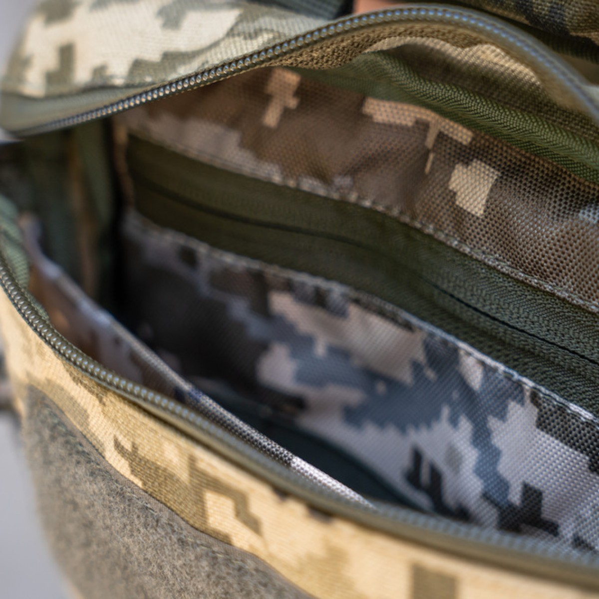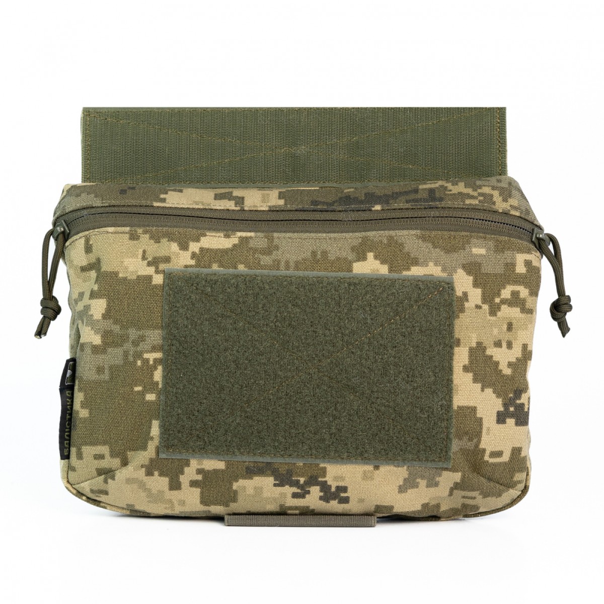 Это не просто сумка, а универсальный элемент, который можно использовать вместе с бронепакетом первого или второго класса защиты. В условиях «войны артиллерий» такая функция является чрезвычайно важной. «Ладник» крепится к плитоноске на переднюю или заднюю плиту и даже с бронепакетом имеет достаточно пространства для хранения различных мелочей. Особенности товара Благодаря своей вместительности и эргономичному дизайну сумка обеспечивает удобный доступ к содержимому и при этом не ограничивает в движении. Другими характеристиками этого изделия являются следующие: Сверху к сумке прикреплена несъемная велкро-панель (22,5×5 см), которая вставляется в клапан плитоноски (совместима с «Сарматом» и M3 Pro/Lite). Обратите внимание, что на ее лицевой стороне расположены крючки, а на тыльной – петельки. Поэтому, если ваша плитоноска имеет другое расположение липучки, вы можете отдельно приобрести у нас велкро-переходники. Изделие можно использовать среди прочего как аптечку благодаря доступу обеими руками. На нижней части содержится внешнее эластичное крепление (шириной 8 см), специально предназначенное для турникета. Основное отделение разделено на два отсека невысокой перегородкой. Ее бортик усилен полоской пластика для придания устойчивости и жесткости. Внутренние швы обработаны отделочной лентой. Также здесь помещен внутренний карман на молнии, в который и устанавливается баллистический пакет. Молния, которой застегивается основное отделение, расположена на передней панели сумки, на расстоянии 3 см от верхнего края, что и обеспечивает удобный доступ к содержимому. Два бегунка позволяют раскрывать «Ладник» на одну или другую сторону. На карман нашита эластичная лента, разделенная швами на отрезки, которыми можно зафиксировать различные небольшие предметы – от дополнительного турникета или бандажа до батончиков и других необходимых на поле боя припасов. На передней части сумки помещена велкро-панель с ячейками MOLLE (16×7 см). Технические характеристики Внешний материал: Cordura 1000D. Внутренний материал: Oxford 600D. Липучка: Velcro. Фурнитура: YKK. Стропа: полиамид. Размеры: 25×17×3 см. Вес: 155 г.Основные характеристики Напашник "Ладник" со сплошной велкро панелью (ММ-14)