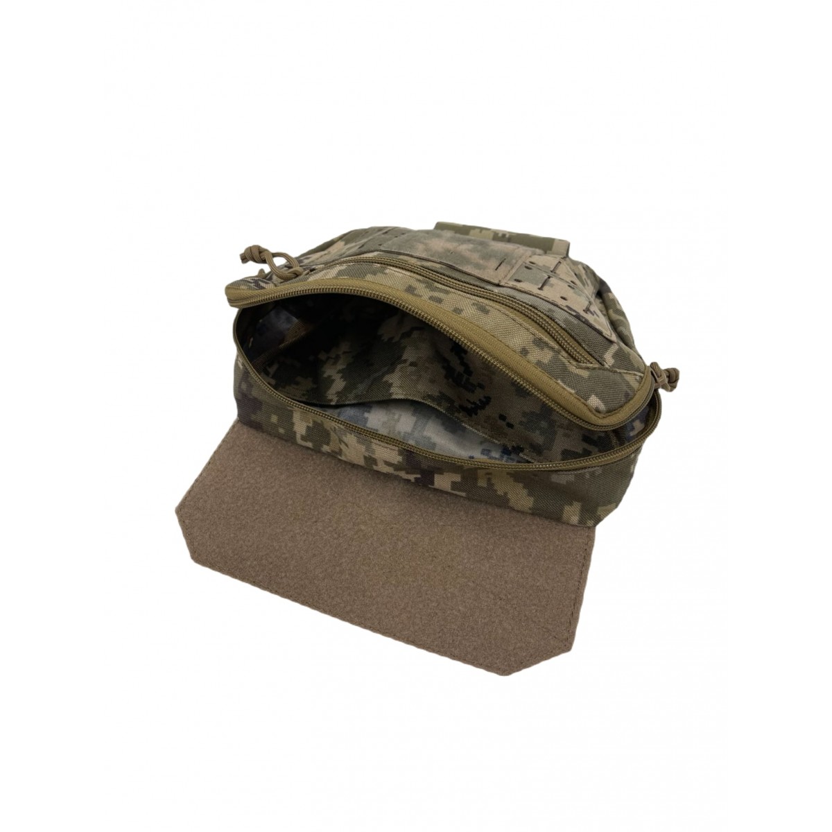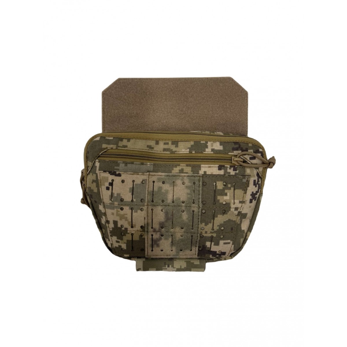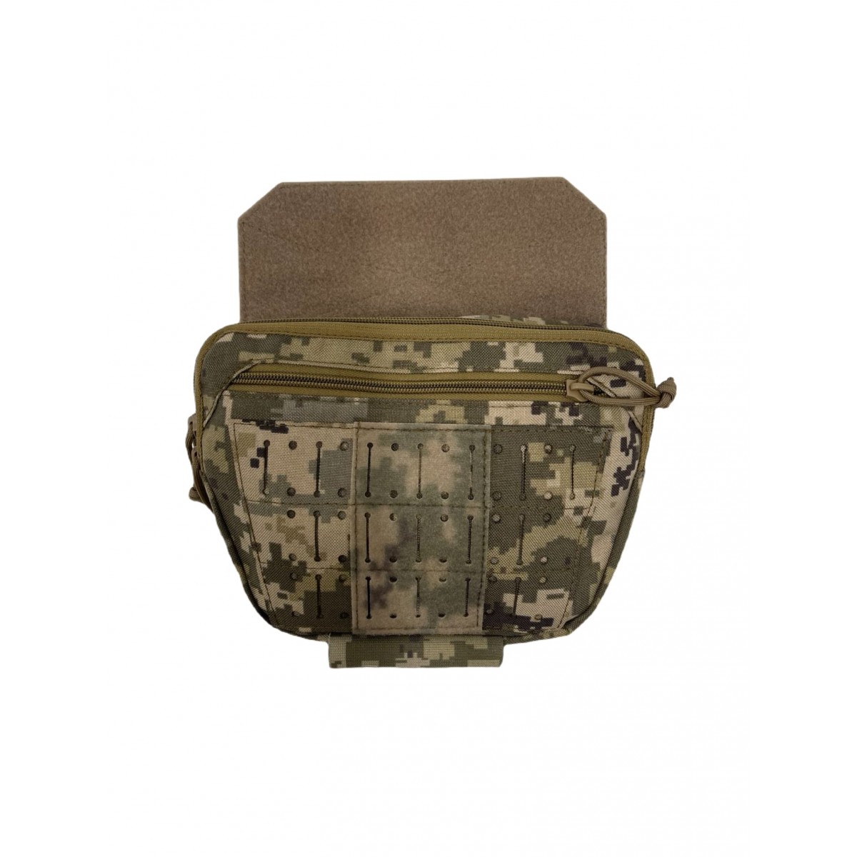 Сумка имеет две большие велкропанели. Фронтальная велкро-панель оснащена интерфейсом MOLLE Laser Cut, позволяющим прикреплять к сумке дополнительное снаряжение, например, итоги или другие аксессуары. Это расширяет функциональность сумки и позволяет персонализировать ее под свои потребности и задачи.