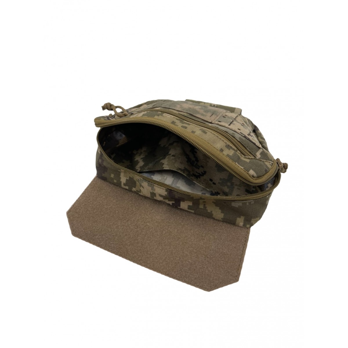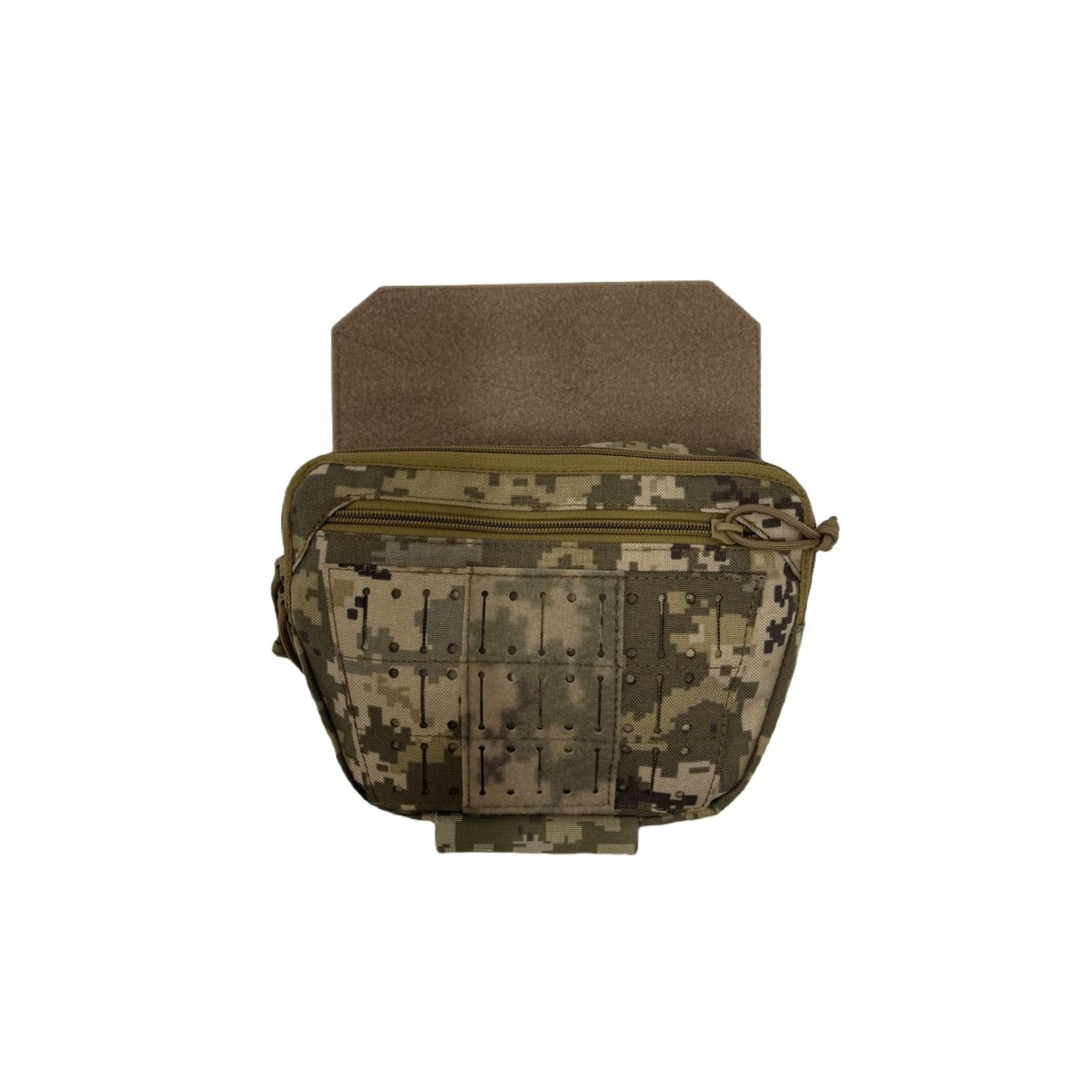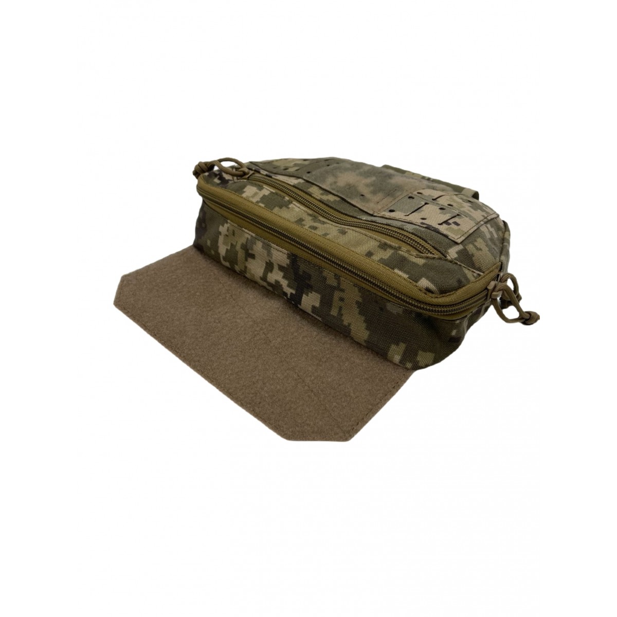 Сумка имеет две большие велкропанели. Фронтальная велкро-панель оснащена интерфейсом MOLLE Laser Cut, позволяющим прикреплять к сумке дополнительное снаряжение, например, итоги или другие аксессуары. Это расширяет функциональность сумки и позволяет персонализировать ее под свои потребности и задачи.
