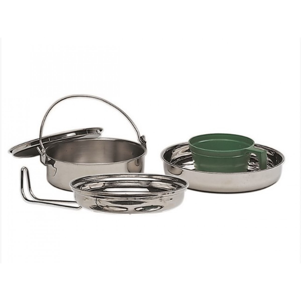 Набор сложной производной посуды из нержавеющей стали, позволяющей приготовить полноразмерную пищу. Посуда легкая, удобная и легко помещается в рюкзак. Компактный размер набора позволяет брать его в путешествие на выживание, в поход или ночную рыбалку.