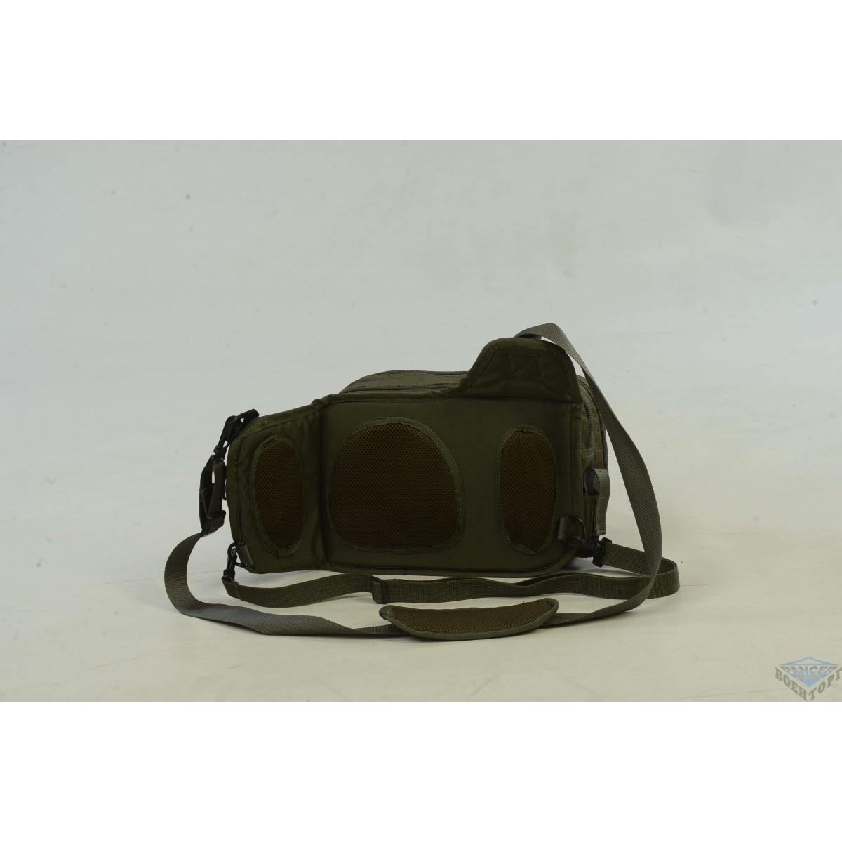 Сумка предназначена для переноски рыбацких коробок и других аксессуаров. Регулируемые лямки через плечо и пояс.