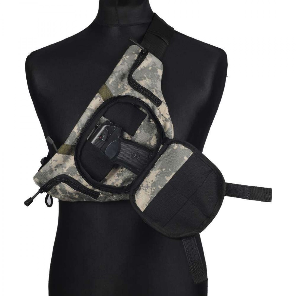 Основное отделение сумки - это кобура, которая закрывается на пластиковую молнию с двумя