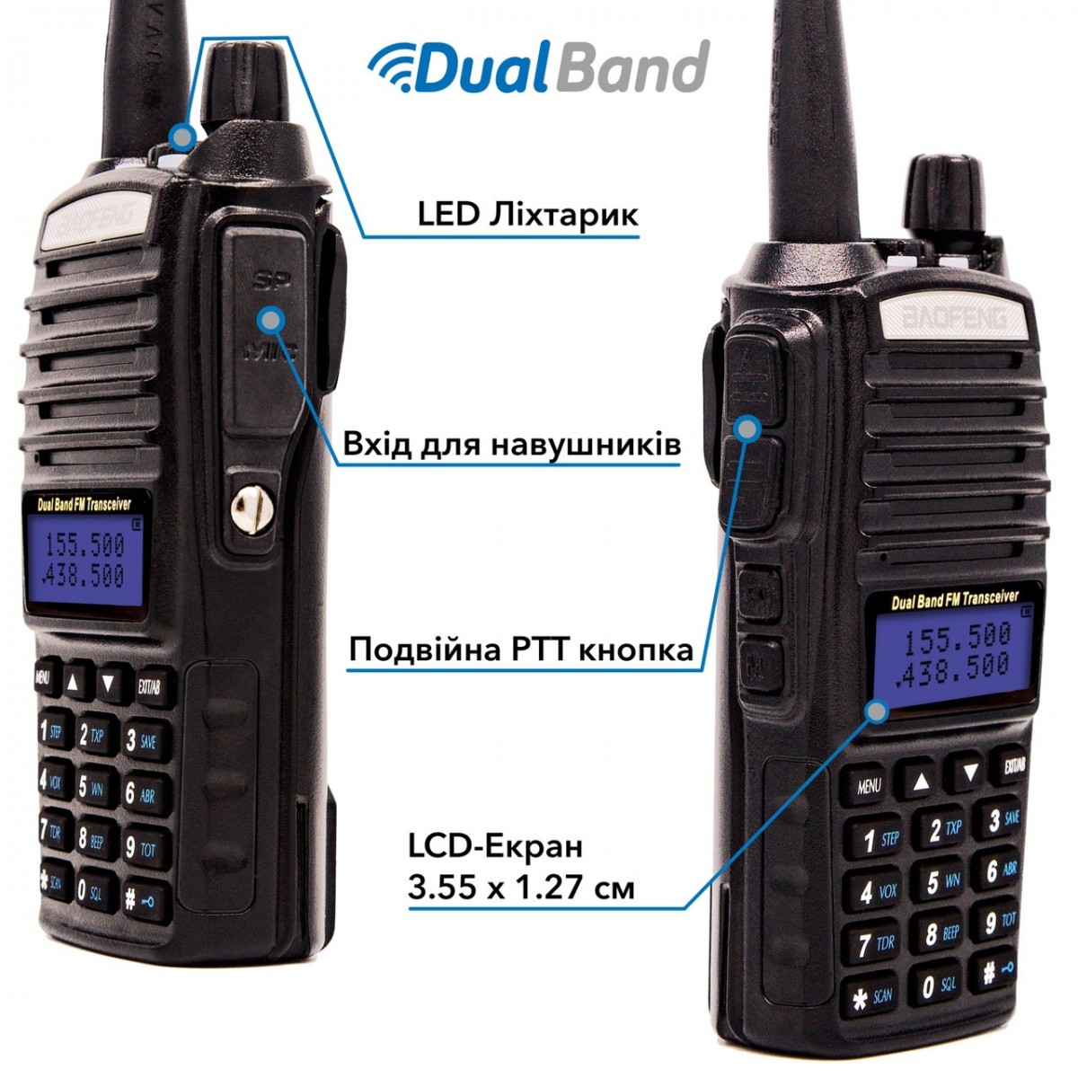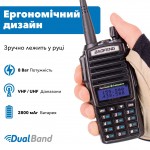 Baofeng UV-82 способен работать в двух диапазонном режиме, а именно в диапазонах VHF, UHF. Максимальная мощность 8Вт c аккумулятором емкостью 2000mAh, который также обеспечит долгую работу рации без подзарядок.