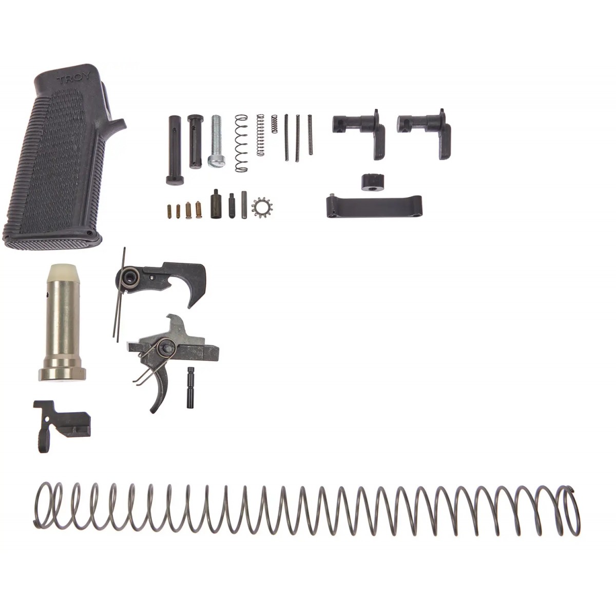 В комплект входит пистолетная рукоятка TROY с винтом и стопорной шайбой, спусковой крючок с курком и пружиной курка, спусковая скоба, передний и задний штифты с пружинами и стопорами, клавиша сброса магазина со штифтами и пружинами, рычаг предохранителя/перевода огня с пружиной и стопором, буфер отдачи с пружиной.