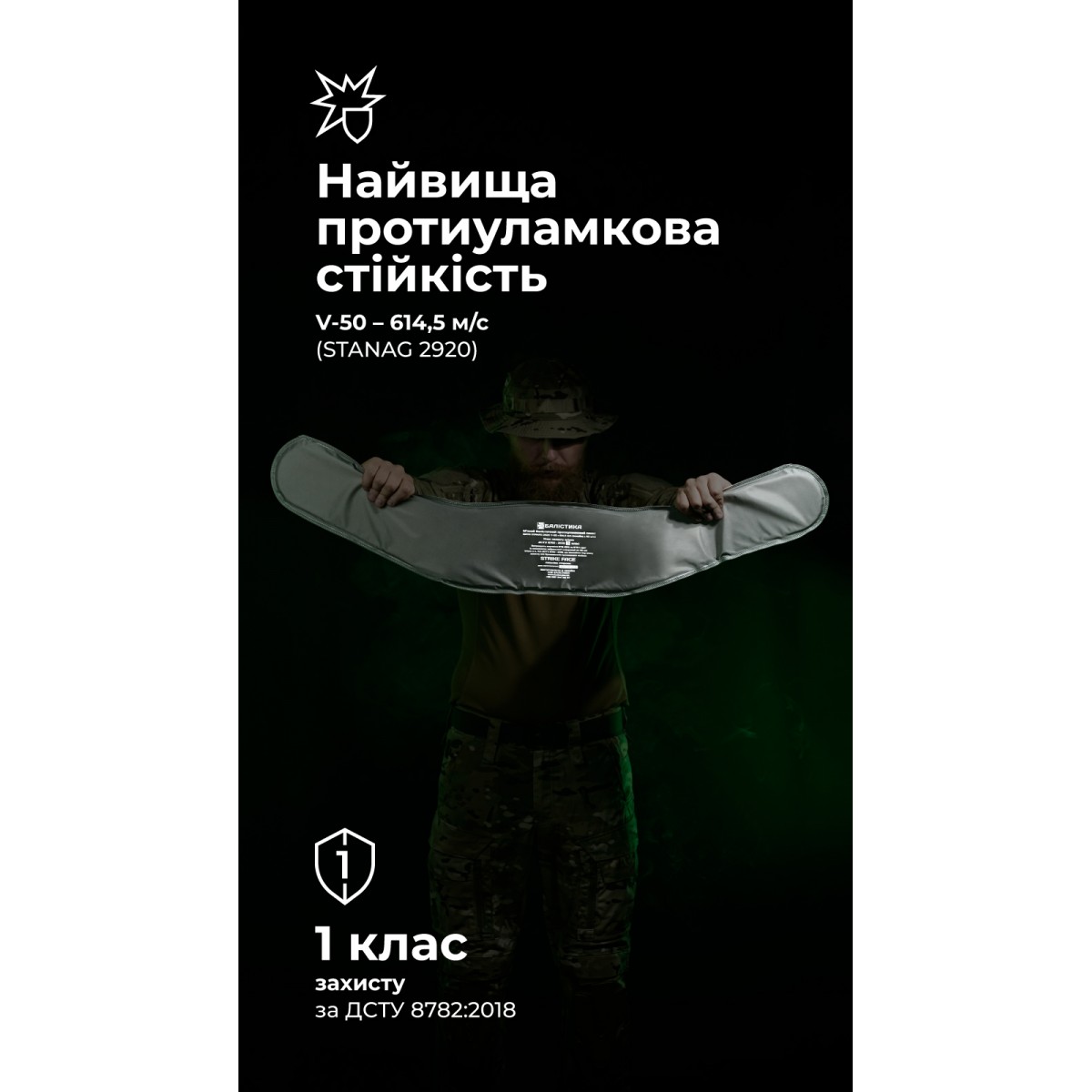 Баллистический пакет 1-го класса защиты для «Черсел» XL расширяет площадь защиты снаряжения на 10 дм² и при этом сохраняет полную функциональность разгрузочной системы. ✅ Ключевые преимущества Самые высокие показатели противоосколочной стойкости: бронепакет из 36 слоев СВМПЭ держит осколки со скоростью 614,5 м/с (STANAG 2920 V50) Сырье мирового уровня: СВМПЭ от FMS (Израиль) Уменьшает запреградную травму: СВМПЭ от FMS имеет плотное перекрестное наложение волокон, что уменьшает вдавливание брони с внутренней стороны Соответствует 1-му классу защиты по ДСТУ 8782:2018 Запаян в герметичный чехол, который защищает от влаги, грязи и ультрафиолета Описание товара Наши бронепакеты созданы прежде всего для защиты от осколков, которые являются наиболее распространенной угрозой на фронте. Изделия имеют самые высокие показатели противоосколочной стойкости и результаты по показателю V50 (STANAG 2920, ДСТУ 8782:2018) в своем классе. Сверхвысокомолекулярный полиэтилен (СВМПЭ), из которого они изготовлены, является легким, гибким и одновременно очень прочным материалом. Бронепакет устойчив к поражению шарами калибра 9×18 мм (9 мм Makarov), 9×19 мм (9 мм Luger, 9 мм Parabellum), 9×19 (мм), что соответствует 1-му классу защиты по ДСТУ 8782:2018. Во время испытаний выдерживает выстрел из автоматического пистолета Стечкина и пистолета Glock 17 пулей со свинцовым сердечником с расстояния 10 м. Защищает от мелких осколков и вторичных поражающих элементов – фрагментов бетона, кирпича, стекла, дерева и т. д. Имеет запреградную деформацию до 22 мм (в среднем 15 мм и меньше). Этому способствует плотное плетение волокон СВМПЭ. Это критически важно для снижения риска контузий без пробития. Ультразвуковая герметизация гарантирует, что бронепакет не потеряет свойства под влиянием пота, дождя, грязи или прямых солнечных лучей. Продуманное количество слоев и естественная гибкость материала способствуют тому, что бронепакет адаптируется к форме тела и не мешает в бою. ℹ️ Протокол отстрела бронепакета 1-го класса защиты согласно ДСТУ (STANAG V50 – 614,5 м/с) ℹ️ Протокол отстрела бронепакета 1-го класса защиты согласно ДСТУ (8782:2018 ) ️ Конструктивные особенности ✔️ Изделие имеет нестандартную форму с расширением в центре и сужением к концам, которая полностью повторяет изгибы и контуры РПС. ✔️ Подходит только под «Черсел» и с разгрузочными системами других производителей не совместим. ✔️ Покрывает область талии и поясницы, однако из-за специфики пояса абдоминальная зона остается почти полностью открытой. Для нее в «Баллистика» предусмотрены отдельные модули защиты. ✔️ Демпферные качества бронеэлемента усиливаются благодаря вставке из пены, которой комплектуется РПС. ❓ Часто задаваемые вопросы Какой смысл ставить бронепакет в РПС, если есть плитоноска? Плитоноска защищает только жизненно важные органы грудной клетки. А бронепакет в РПС покрывает дополнительную зону (талия, бока, поясница), которая также часто подвергается осколочным ранениям. Баллистический пакет нужно устанавливать вместо той пенки, которая идет внутри РПС, или вместе с ней, поверх? Мы рекомендуем не вынимать пену, если вы используете этот бронепакет. Она служит как дополнительный демпфер. Пена должна находиться ближе к телу, затем бронепакет. Нужно ли вынимать бронепакет перед стиркой РПС? Да, пакет не предназначен для стирки – он вынимается 
