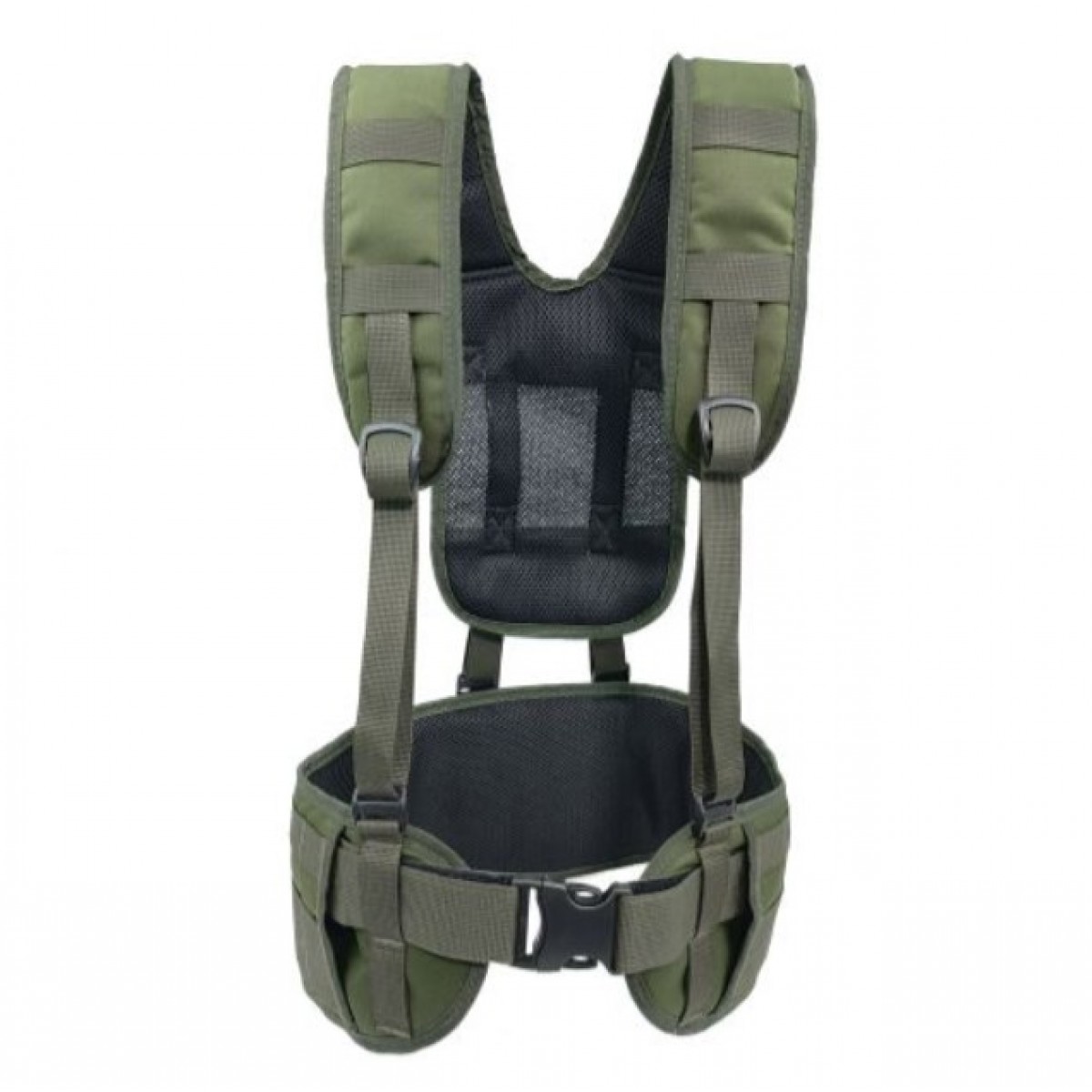 Лямки и пояс имеют строповую систему MOLLE. Система регулируется по высоте и крепится на талии ремнем с фастексом и липучкой велкро.