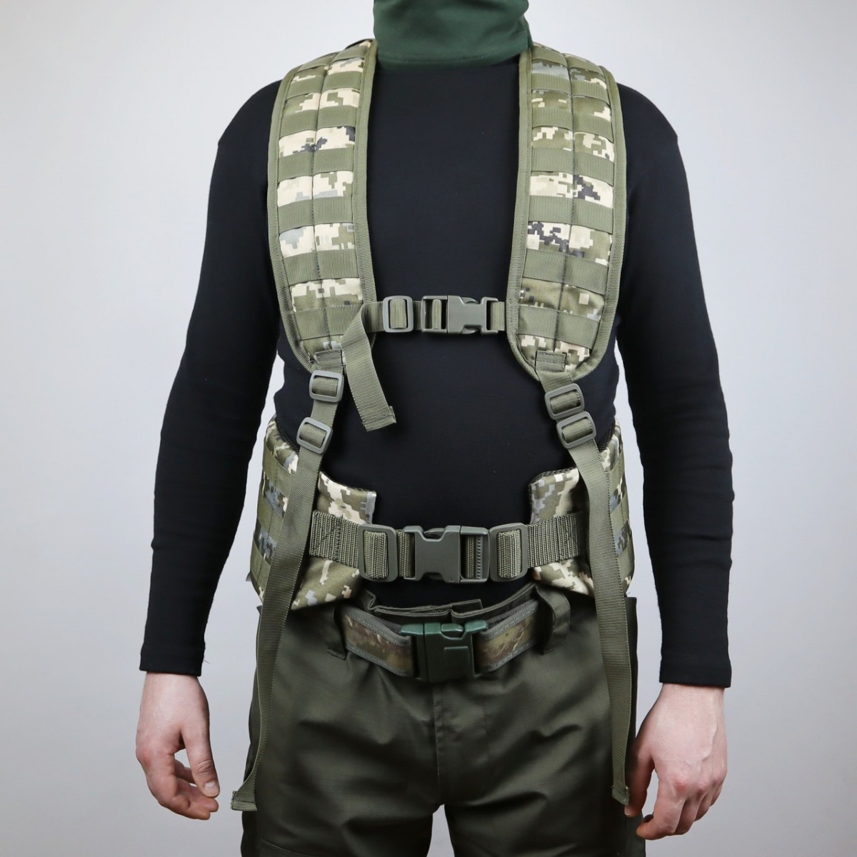 Комплект ременно-плечевая система на MOLLE, состоит из модульного пояса и модульных плечевых лямок.