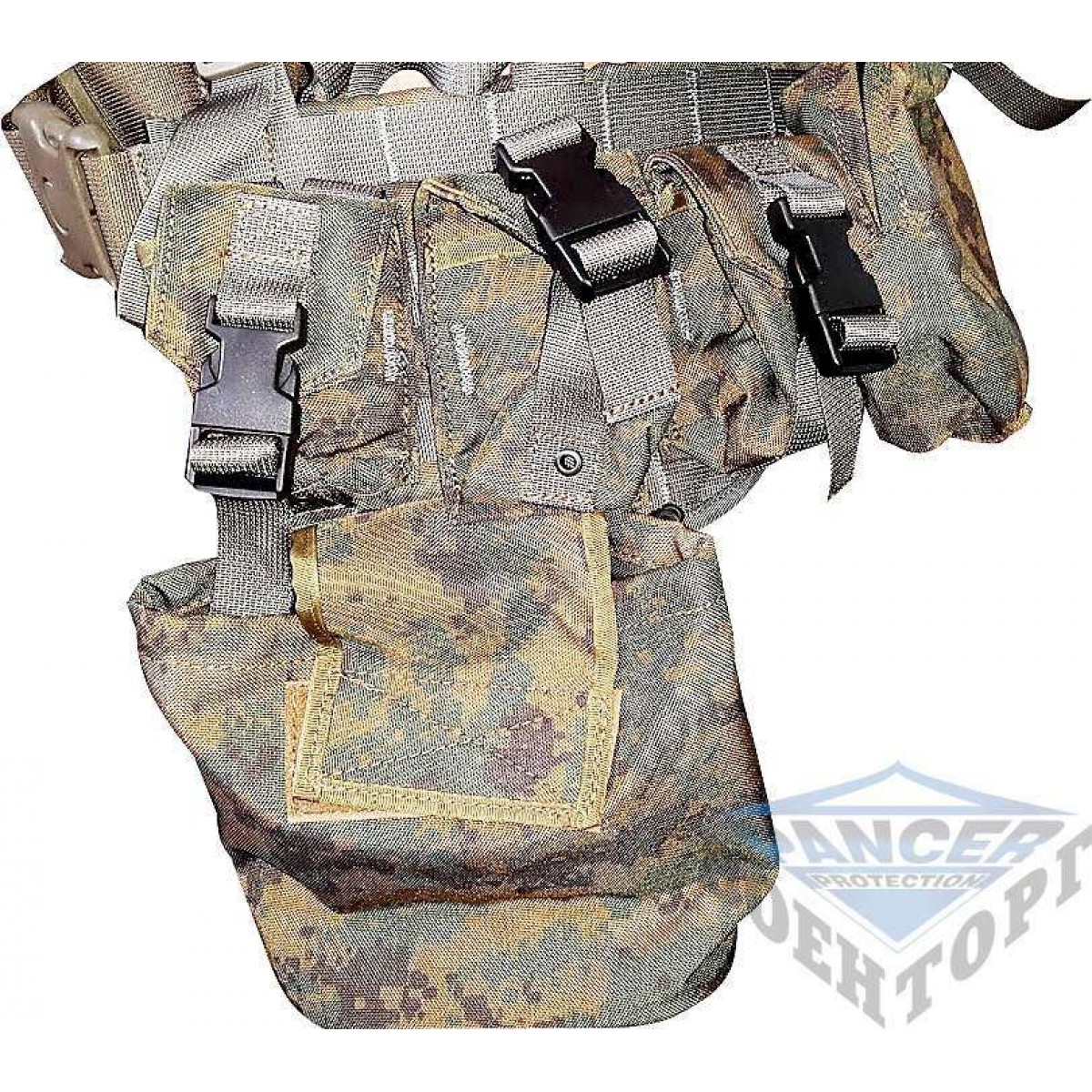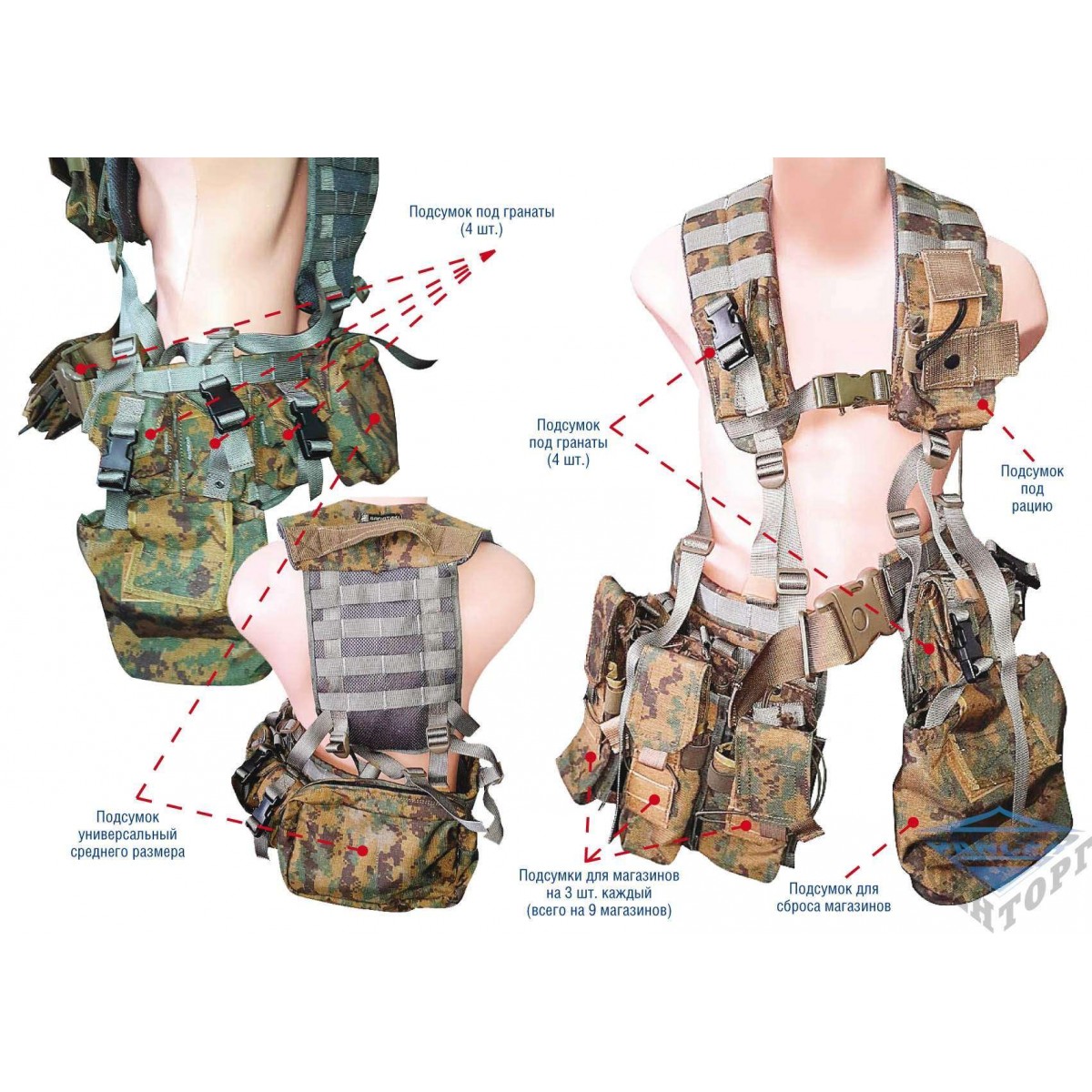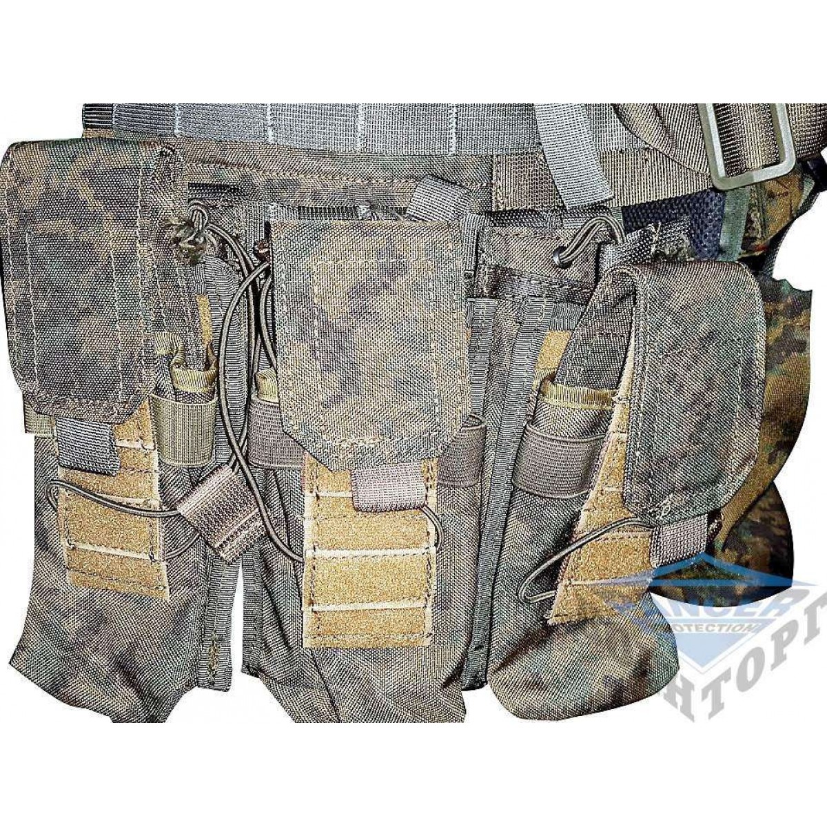 Аптечка, сумка сброса магазинов, 5 подсумок под рожки (3 подсумка под 1 рожок и 2 подсумка под 2 рожка), 4 подсумка под гранаты, 1 подсумок под рацию