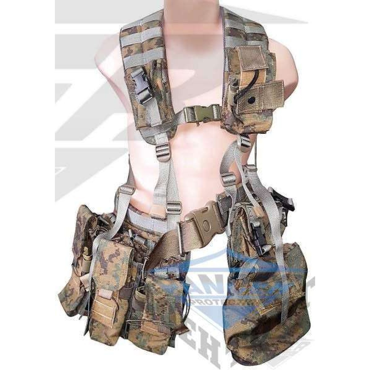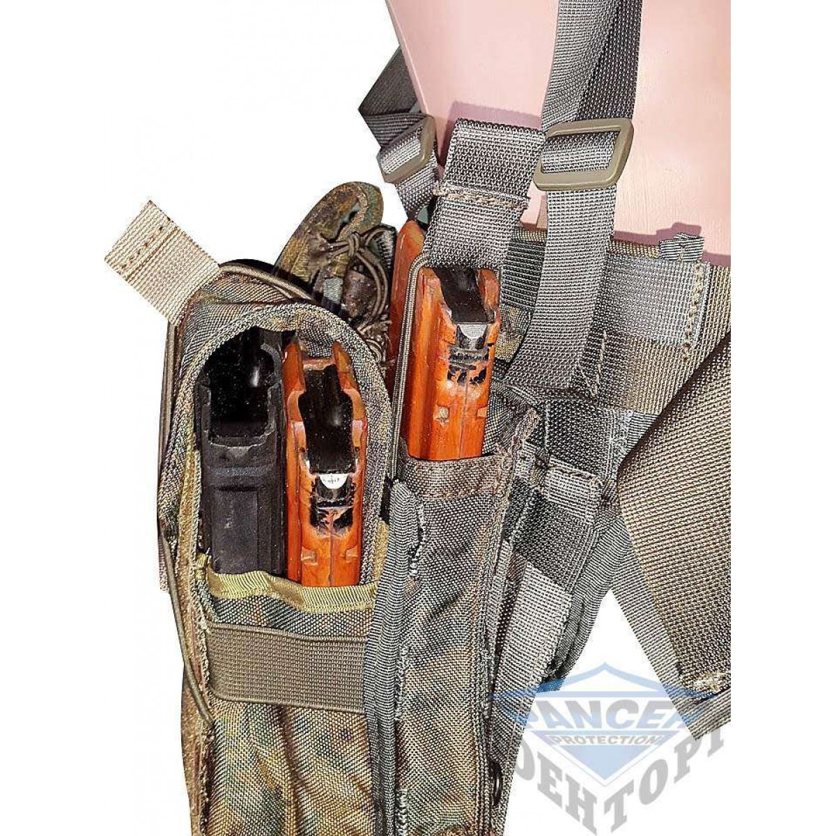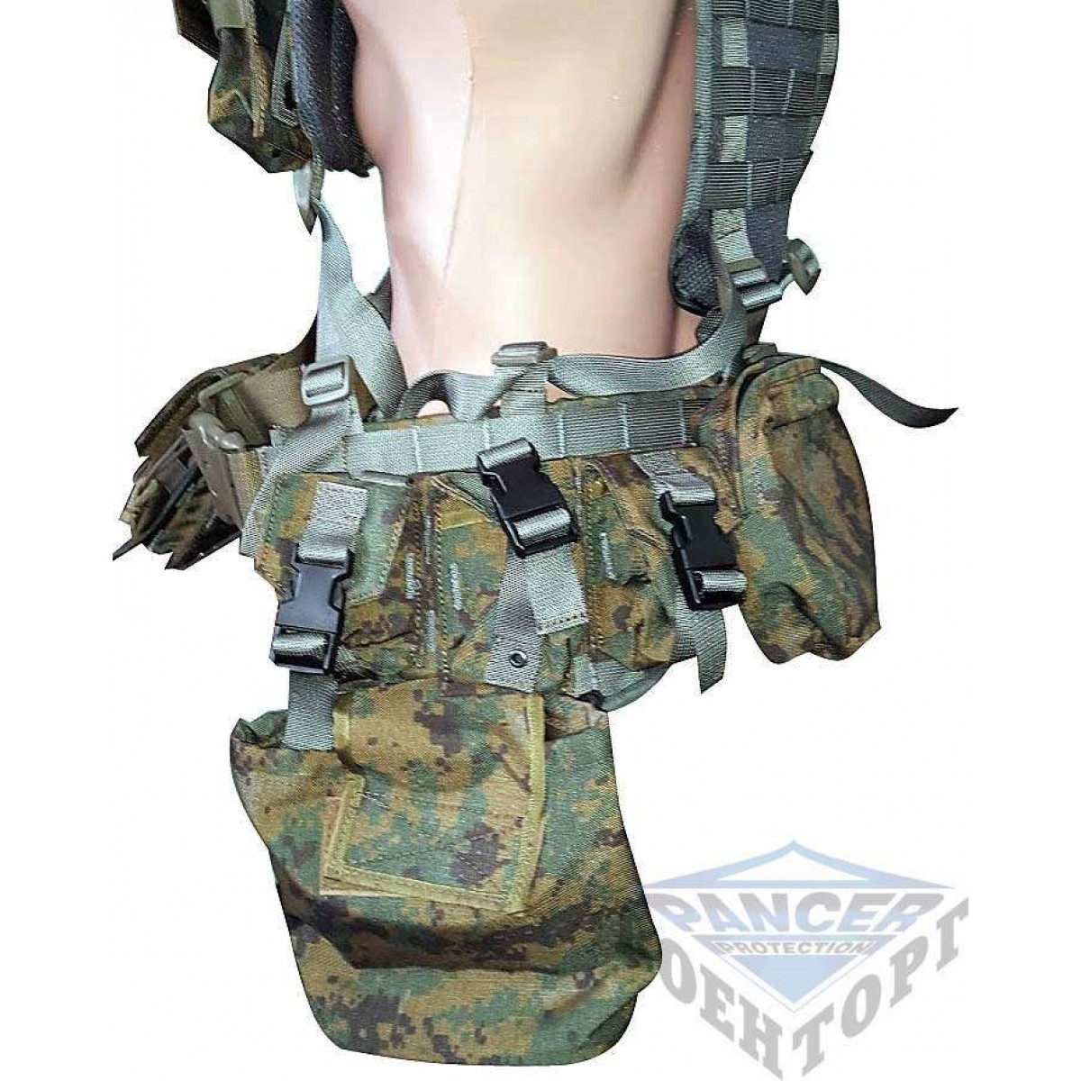 Аптечка, сумка сброса магазинов, 5 подсумок под рожки (3 подсумка под 1 рожок и 2 подсумка под 2 рожка), 4 подсумка под гранаты, 1 подсумок под рацию
