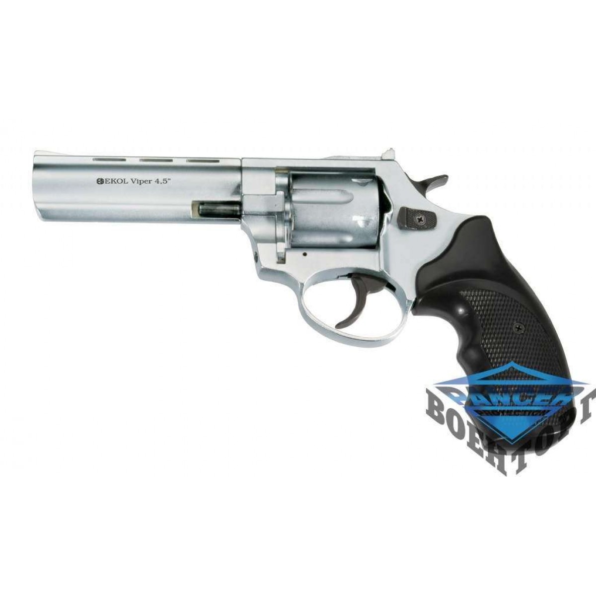 Это револьвер под патрон Флобера производства фирмы Ekol (Турция). Он является копией револьвера Smith & Wesson Model 19. Ekol Viper 4.5 может похвастаться хорошей убойной силой, в купе с качественной сборкой. Система взвода в данном револьвере — двойного действия: стрельба возможна как с предварительно взведенным курком, так и без взвода, простым нажатием спускового крючка. Характеристики: - Калибр 4 мм - Начальная скорость пули 190 м/с - Вид ствола Стальной гладкий - Длина ствола 4.5" - Общая длина 238 мм - Вместимость барабана 9 - Материал барабана Сталь - Тип прицела Прицельная планка и мушка - Тип взвода Двойного действия - Материал накладки на рукояти ПластикОтзывы о Первый пистолет под патрон Флобера EKOL VIPER 4,5 white
