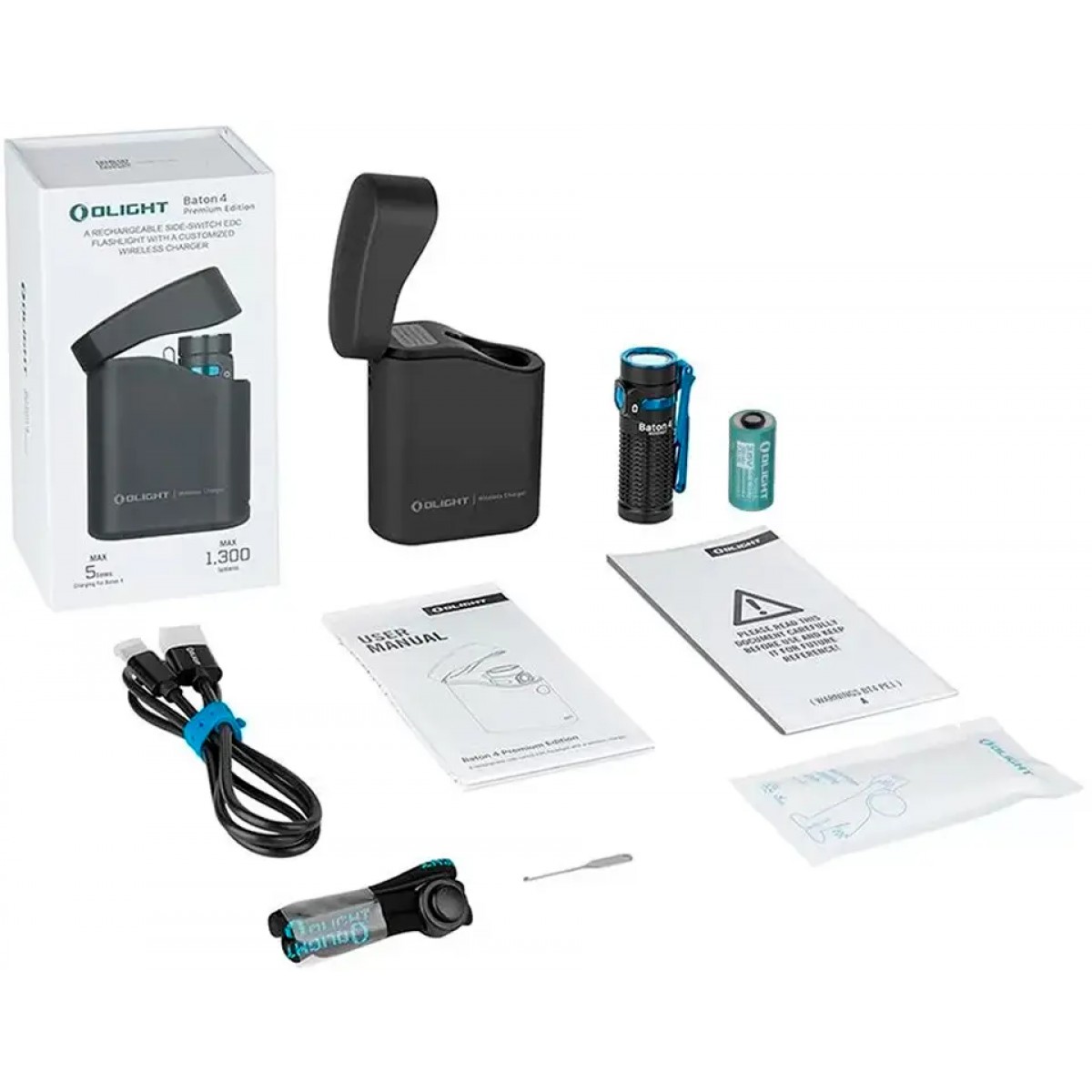 Baton 4 Premium - это премиальная версия модели Baton 4 от Olight. Отличается от обычной версии имеющимся зарядным кейсом для фонаря, который также может служить и павербанком, ведь имеет емкость 5000 мАч. Фонарь оснащен высокоэффективным светодиодом CW LED и линзой TIR, что обеспечивает мягкий и сбалансированный световой поток до 1300 люмен и дальность до 170 метров. В минимальном режиме (0,5 люмен) фонарь может непрерывно светить до 30 дней. Baton 4 Premium имеет 5 режимов освещения и режим Strob, переключаемые удобным металлическим переключателем.