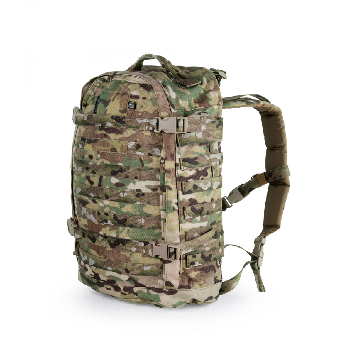 Боевой рюкзак от «Баллистика» отлично приспособлен для удобной переноски грузов во время длительных миссий. Он является частью боевого комплекта военнослужащих ВСУ и разработан для использования в сложных полевых условиях. Рюкзак можно носить отдельно или в сочетании с другими элементами снаряжения. Особенности товара РБИ имеет одно основное отделение и три внутренних кармана. Он оснащен ручкой сверху, двумя косыми плечевыми лямками, стабилизационными и разгрузочными ремнями, а также дополнительными элементами для навесного закрепления предметов экипировки. Внешняя конструкция Широкий функционал рюкзака охватывает следующие аспекты: Основное отделение закрывается с помощью молнии с двумя бегунками, которые сходятся вместе и которые можно открывать на одну или вторую сторону. Молния прячется под планкой, что защищает ее от неблагоприятных погодных условий. К верхней части рюкзака пришита прочная ручка из сдвоенной стропы. На левом крае этой ручки помещен клапан на велкро, который закрывает отверстие для вывода наружу приспособлений по типу антенны, шланга к гидратору, проводов для наушников и т. д. На передней панели снаружи расположены ячейки MOLLE в семь рядов. На один из верхних рядов нашита липучка, также есть отдельная велкро-панель для идентификаторов (9×5 см). Боковые панели также оснащены ячейками, на которые удобно навесить несколько подсумков. На заднюю панель настрочены три смягчающие подушки, которые уменьшают давление на спину. В специальное отделение внутри рюкзака вставлен дополнительный слой пены и лист жесткого пластика, который помогает спинке держать форму. Плечевые лямки оснащены встроенными демпферами, которые равномерно распределяют вес на большей площади плечевой зоны. К каждой лямке пришита разгрузочная стропа. Ее свободный конец прикреплен к верхней панели рюкзака с помощью трехщелевой рамки. Это позволяет регулировать высоту лямки и положение рюкзака относительно туловища, а значит, также снижает нагрузку на плечи и спину. Лямки можно зафиксировать с помощью грудного ремешка с фастексом, который предотвращает их сползание во время движения. Длина ремешка также регулируется, к тому же его можно снять и переместить на удобный для пользователя уровень. В четырех местах к фронтальным ячейкам крепятся боковые стяжки с фастексами, с помощью которых регулируется объем рюкзака или закрепляется дополнительное снаряжение. Ко дну пришиты два ремешка, которые помогут зафиксировать спальник или коврик. Трехщелевые рамки на них позволяют затянуть стропы и отрегулировать их объем. Внутреннее наполнение Отдельно следует рассмотреть возможности для организации внутреннего пространства РБИ. Они предусматривают следующее: Изнутри передней панели помещены два кармана на молниях. Верхний имеет размер 17×26 см, нижний – 24×26 см. Оба оснащены металлическими люверсами для вентиляции и выхода мелкого мусора. На дне основного отделения есть еще один люверс. Складки на карманах обеспечивают дополнительный объем, что позволяет хранить в них больше вещей без лишнего давления на содержимое. В самом верху передней панели помещена петля из стропы, которая выполняет роль пулера для быстрого раскрытия основного отделения. Для этого во время закрывания ее нужно вывести наружу и оставить между бегунками. На 