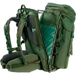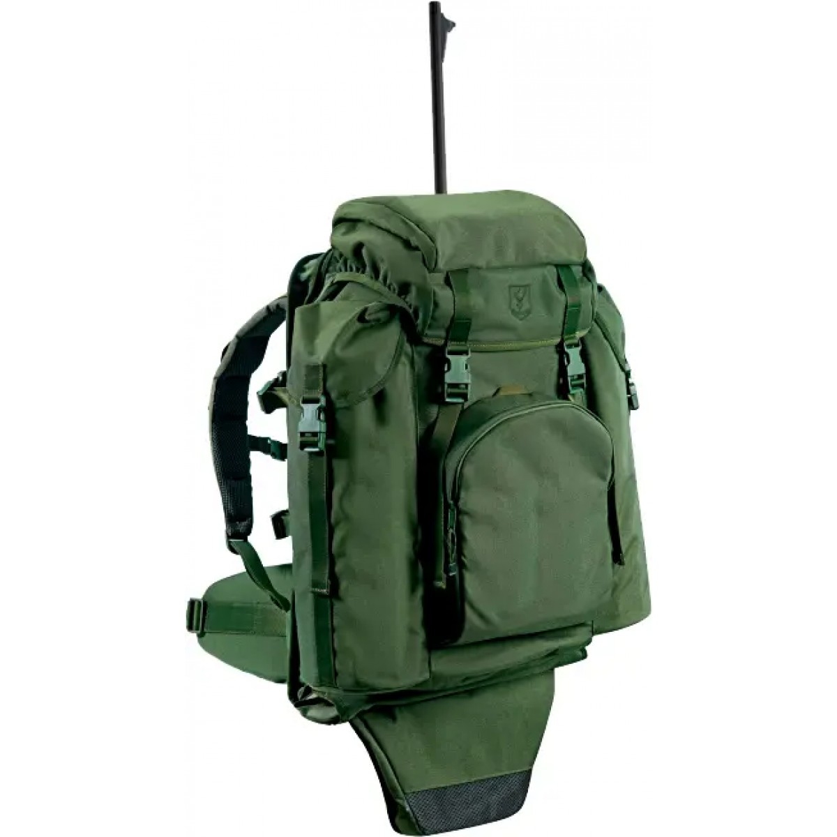 Корпус рюкзака представляет собой 3 отделения (1 основное и 2 боковых) которые закрываются крышками на фастексы и отдельный передний карман на молнии. Также в корпусе интегрирован карман для документов под крышкой основного отделения и место для оружия между спинкой и основным отделением. Имеет отделение со смягчителем для оптического прибора (37 х 10 х 13 см), а также отделение для переноски дичи.