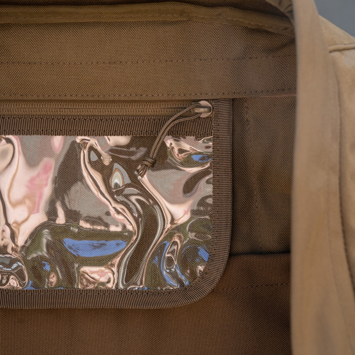 Рюкзак «Гамуз» от «Баллистика» рассчитан на многодневные переходы и миссии. Благодаря продуманной конструкции, каркасной системе и демпферным вставкам с 3D-сеткой он обеспечивает оптимальное распределение нагрузки и вентиляцию спины. А это повышает комфорт при длительном ношении. Система MOLLE, многочисленные крепления и 15 карманов делают рюкзак еще более функциональным и адаптивным. С учетом большого объема, износостойкости и удобства «Гамуз» пригодится военным, а также туристам, рыбакам, охотникам и т. д. Особенности товара «Гамуз» имеет суженную к верху, обтекаемую форму. Это обеспечивает лучшее прилегание к телу и равновесие во время движения, особенно если самые тяжелые вещи разместить ближе к спинке. Для разгрузки служат также специальные стропы на лямках и металлическая рама. Кроме того, рюкзак совместим с РПС и может быть присоединен к ней. РПС не входит в комплект. Внешняя конструкция Изделие имеет множество полезных функций, среди которых следует перечислить следующие: Одно основное отделение закрывается с помощью молнии с двумя сходящимися вместе бегунками, которые можно открывать на одну или другую сторону. Молния прячется под планкой, что защищает ее от неблагоприятных погодных условий. Снаружи помещены шесть карманов: Нижний (30×24×4 см) и средний (30×22×4 см) фасадные карманы объемные, застегиваются с трех сторон молниями с двумя бегунками, которые прикрыты планками. В нижнем есть еще два прозрачных кармашка из 2D-сетки, в среднем – эластичная лента с шестью секциями. На обоих карманах снаружи нашиты ячейки MOLLE. Верхний фасадный карман (29×23 см) плоский, застегивается молнией сверху. На нем помещена велкро-панель (15×10 см), а сквозь ячейки MOLLE накрест протянут эластичный шнурок, который можно регулировать с помощью пластикового фиксатора или же вообще снять. Боковые карманы (23×34×4 см) также объемные, застегиваются молнией, которая оснащена планкой, а также имеют ячейки MOLLE. Сзади есть еще один наружный карман (33×53 см), предназначенный для переноски оружия. Он закрывается клапаном на велкро, который расположен над плечевыми лямками. Сверху на спинке помещена ручка, а прямо под ней – окошко (12×7 см) из прозрачного пластика, в которое можно вставить идентификационную карточку/бейдж. Оно имеет нижний доступ и застегивается на липучку. Две пары боковых стяжек регулируют объем рюкзака и при этом визуально делят его на три секции. Кроме того, ими можно закрепить дополнительное снаряжение. Плечевые лямки крепятся к рюкзаку под углом, выполнены со смягчающими демпферами и 3D-сеткой. Их длину можно отрегулировать в соответствии с ростом пользователя. Грудной ремешок с фастексом позволяет зафиксировать плечевые лямки вместе, чтобы они не сползали во время движения. Длина ремешка также регулируется, а благодаря рамке-переходнику его можно переместить на удобный для пользователя уровень. К каждой лямке пришита разгрузочная стропа, свободный конец которой прикреплен к верху рюкзака с помощью трехщелевой рамки. Она позволяет регулировать высоту лямки и положение рюкзака относительно туловища, а следовательно, снижает нагрузку на плечи и спину. На этой же стропе помещены D-образные кольца для подвешивания дополнительного оборудования. На спинке вшиты три демпферные подушки с 3D-сеткой – две для плеч и одна для поясницы. Они смягч