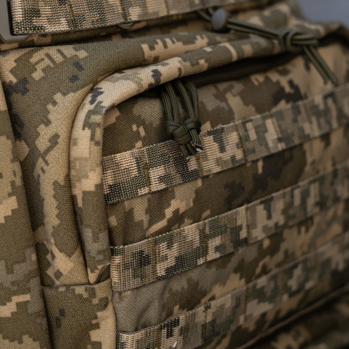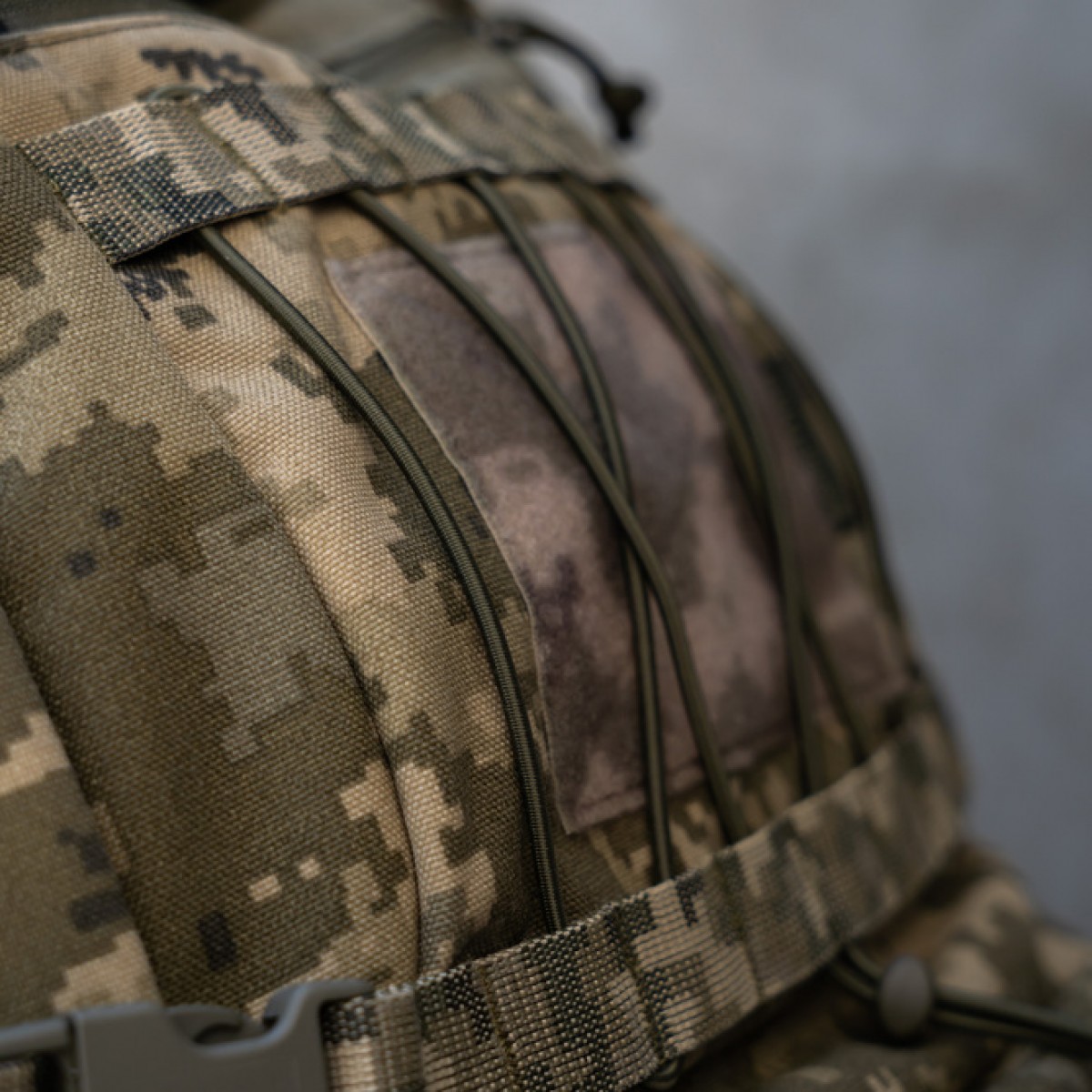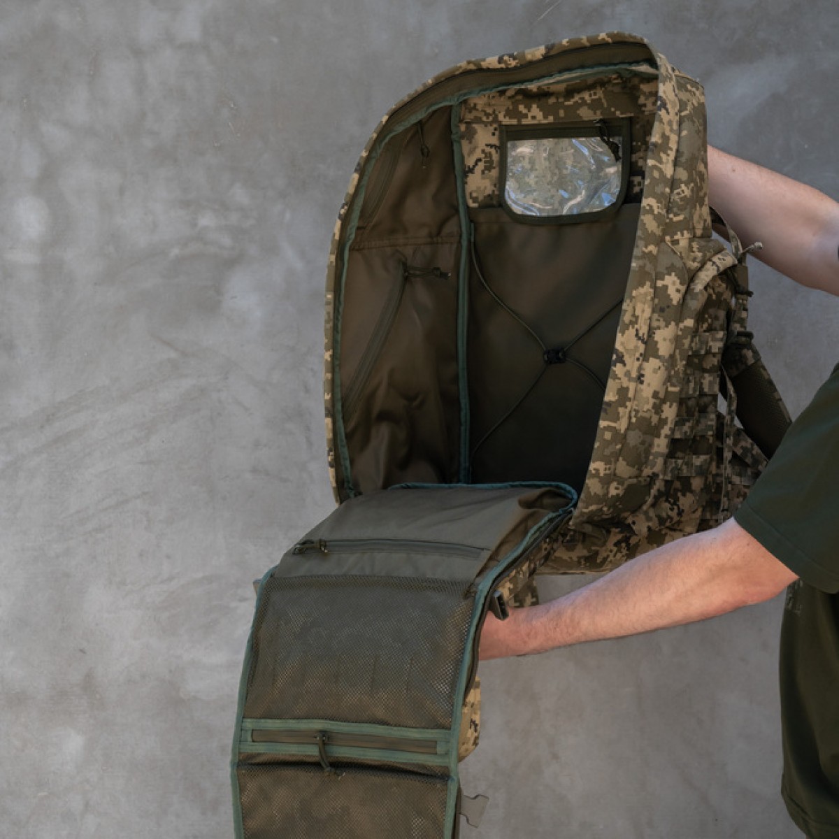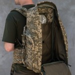 Рюкзак «Гамуз» от «Баллистика» рассчитан на многодневные переходы и миссии. Благодаря продуманной конструкции, каркасной системе и демпферным вставкам с 3D-сеткой он обеспечивает оптимальное распределение нагрузки и вентиляцию спины. А это повышает комфорт при длительном ношении. Система MOLLE, многочисленные крепления и 15 карманов делают рюкзак еще более функциональным и адаптивным. С учетом большого объема, износостойкости и удобства «Гамуз» пригодится военным, а также туристам, рыбакам, охотникам и т. д. Особенности товара «Гамуз» имеет суженную к верху, обтекаемую форму. Это обеспечивает лучшее прилегание к телу и равновесие во время движения, особенно если самые тяжелые вещи разместить ближе к спинке. Для разгрузки служат также специальные стропы на лямках и металлическая рама. Кроме того, рюкзак совместим с РПС и может быть присоединен к ней. РПС не входит в комплект. Внешняя конструкция Изделие имеет множество полезных функций, среди которых следует перечислить следующие: Одно основное отделение закрывается с помощью молнии с двумя сходящимися вместе бегунками, которые можно открывать на одну или другую сторону. Молния прячется под планкой, что защищает ее от неблагоприятных погодных условий. Снаружи помещены шесть карманов: Нижний (30×24×4 см) и средний (30×22×4 см) фасадные карманы объемные, застегиваются с трех сторон молниями с двумя бегунками, которые прикрыты планками. В нижнем есть еще два прозрачных кармашка из 2D-сетки, в среднем – эластичная лента с шестью секциями. На обоих карманах снаружи нашиты ячейки MOLLE. Верхний фасадный карман (29×23 см) плоский, застегивается молнией сверху. На нем помещена велкро-панель (15×10 см), а сквозь ячейки MOLLE накрест протянут эластичный шнурок, который можно регулировать с помощью пластикового фиксатора или же вообще снять. Боковые карманы (23×34×4 см) также объемные, застегиваются молнией, которая оснащена планкой, а также имеют ячейки MOLLE. Сзади есть еще один наружный карман (33×53 см), предназначенный для переноски оружия. Он закрывается клапаном на велкро, который расположен над плечевыми лямками. Сверху на спинке помещена ручка, а прямо под ней – окошко (12×7 см) из прозрачного пластика, в которое можно вставить идентификационную карточку/бейдж. Оно имеет нижний доступ и застегивается на липучку. Две пары боковых стяжек регулируют объем рюкзака и при этом визуально делят его на три секции. Кроме того, ими можно закрепить дополнительное снаряжение. Плечевые лямки крепятся к рюкзаку под углом, выполнены со смягчающими демпферами и 3D-сеткой. Их длину можно отрегулировать в соответствии с ростом пользователя. Грудной ремешок с фастексом позволяет зафиксировать плечевые лямки вместе, чтобы они не сползали во время движения. Длина ремешка также регулируется, а благодаря рамке-переходнику его можно переместить на удобный для пользователя уровень. К каждой лямке пришита разгрузочная стропа, свободный конец которой прикреплен к верху рюкзака с помощью трехщелевой рамки. Она позволяет регулировать высоту лямки и положение рюкзака относительно туловища, а следовательно, снижает нагрузку на плечи и спину. На этой же стропе помещены D-образные кольца для подвешивания дополнительного оборудования. На спинке вшиты три демпферные подушки с 3D-сеткой – две для плеч и одна для поясницы. Они смягч