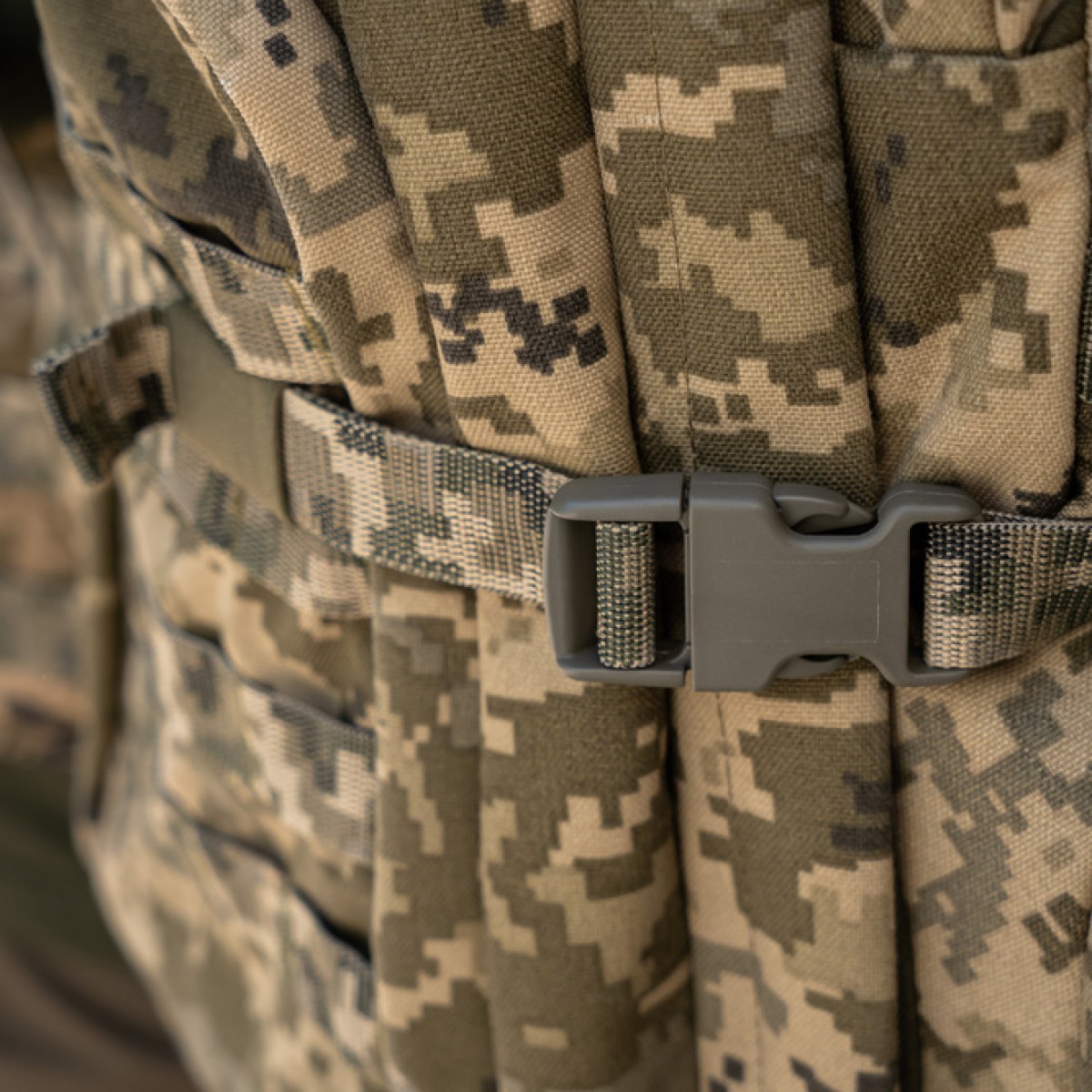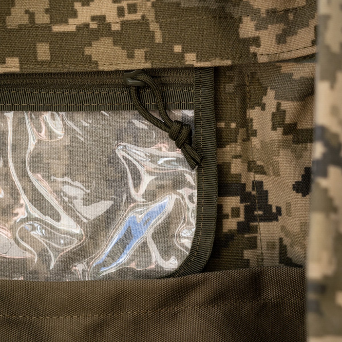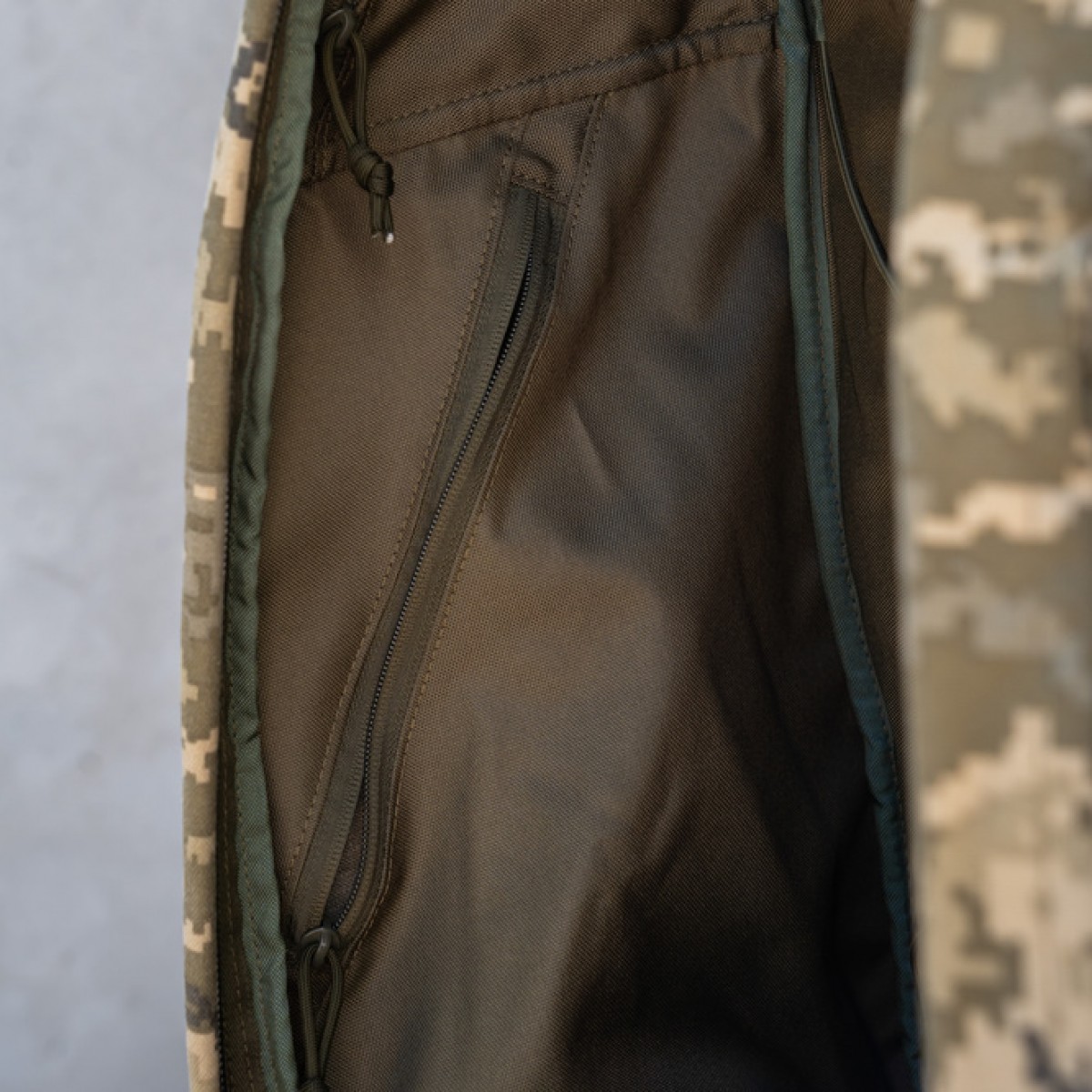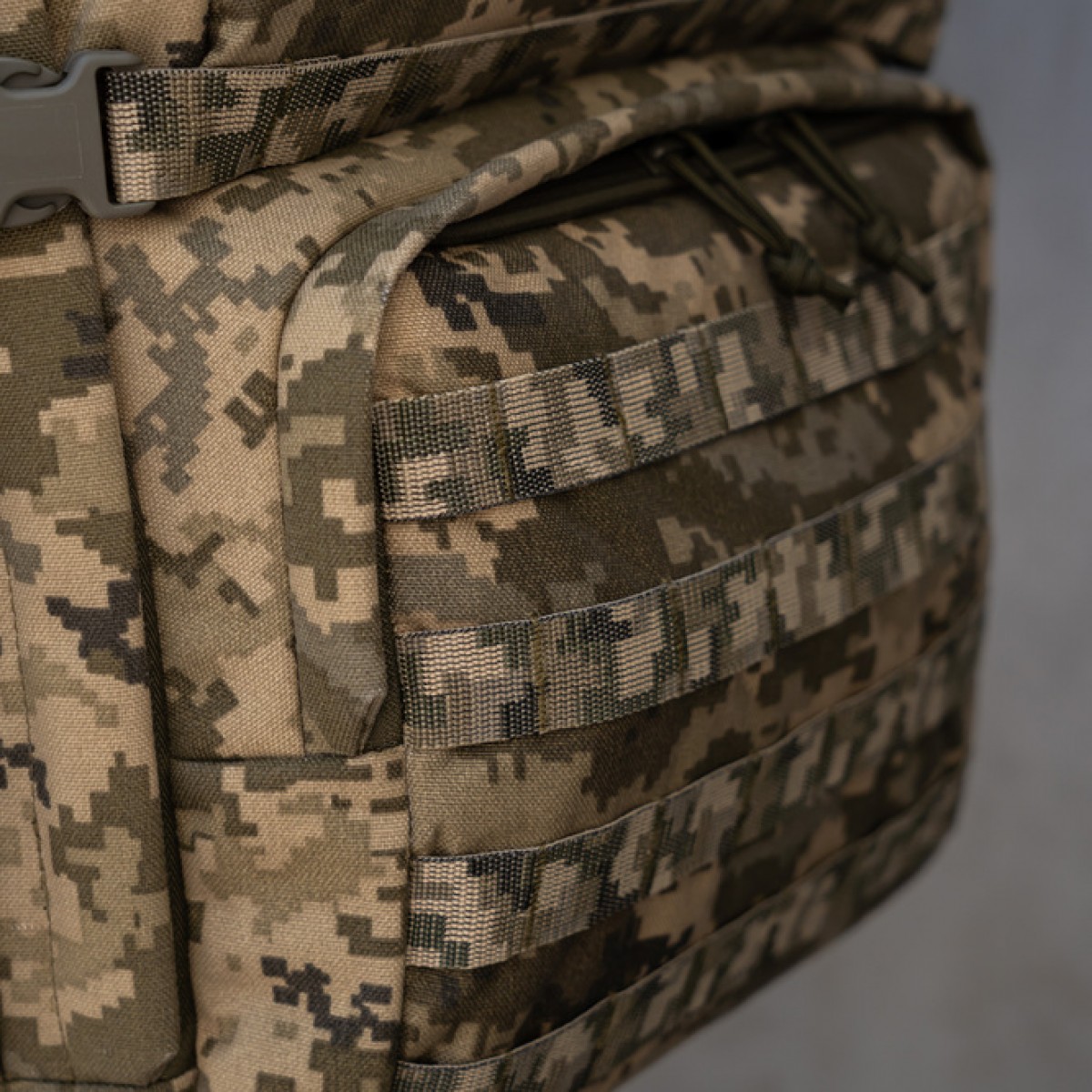 Рюкзак «Гамуз» от «Баллистика» рассчитан на многодневные переходы и миссии. Благодаря продуманной конструкции, каркасной системе и демпферным вставкам с 3D-сеткой он обеспечивает оптимальное распределение нагрузки и вентиляцию спины. А это повышает комфорт при длительном ношении. Система MOLLE, многочисленные крепления и 15 карманов делают рюкзак еще более функциональным и адаптивным. С учетом большого объема, износостойкости и удобства «Гамуз» пригодится военным, а также туристам, рыбакам, охотникам и т. д. Особенности товара «Гамуз» имеет суженную к верху, обтекаемую форму. Это обеспечивает лучшее прилегание к телу и равновесие во время движения, особенно если самые тяжелые вещи разместить ближе к спинке. Для разгрузки служат также специальные стропы на лямках и металлическая рама. Кроме того, рюкзак совместим с РПС и может быть присоединен к ней. РПС не входит в комплект. Внешняя конструкция Изделие имеет множество полезных функций, среди которых следует перечислить следующие: Одно основное отделение закрывается с помощью молнии с двумя сходящимися вместе бегунками, которые можно открывать на одну или другую сторону. Молния прячется под планкой, что защищает ее от неблагоприятных погодных условий. Снаружи помещены шесть карманов: Нижний (30×24×4 см) и средний (30×22×4 см) фасадные карманы объемные, застегиваются с трех сторон молниями с двумя бегунками, которые прикрыты планками. В нижнем есть еще два прозрачных кармашка из 2D-сетки, в среднем – эластичная лента с шестью секциями. На обоих карманах снаружи нашиты ячейки MOLLE. Верхний фасадный карман (29×23 см) плоский, застегивается молнией сверху. На нем помещена велкро-панель (15×10 см), а сквозь ячейки MOLLE накрест протянут эластичный шнурок, который можно регулировать с помощью пластикового фиксатора или же вообще снять. Боковые карманы (23×34×4 см) также объемные, застегиваются молнией, которая оснащена планкой, а также имеют ячейки MOLLE. Сзади есть еще один наружный карман (33×53 см), предназначенный для переноски оружия. Он закрывается клапаном на велкро, который расположен над плечевыми лямками. Сверху на спинке помещена ручка, а прямо под ней – окошко (12×7 см) из прозрачного пластика, в которое можно вставить идентификационную карточку/бейдж. Оно имеет нижний доступ и застегивается на липучку. Две пары боковых стяжек регулируют объем рюкзака и при этом визуально делят его на три секции. Кроме того, ими можно закрепить дополнительное снаряжение. Плечевые лямки крепятся к рюкзаку под углом, выполнены со смягчающими демпферами и 3D-сеткой. Их длину можно отрегулировать в соответствии с ростом пользователя. Грудной ремешок с фастексом позволяет зафиксировать плечевые лямки вместе, чтобы они не сползали во время движения. Длина ремешка также регулируется, а благодаря рамке-переходнику его можно переместить на удобный для пользователя уровень. К каждой лямке пришита разгрузочная стропа, свободный конец которой прикреплен к верху рюкзака с помощью трехщелевой рамки. Она позволяет регулировать высоту лямки и положение рюкзака относительно туловища, а следовательно, снижает нагрузку на плечи и спину. На этой же стропе помещены D-образные кольца для подвешивания дополнительного оборудования. На спинке вшиты три демпферные подушки с 3D-сеткой – две для плеч и одна для поясницы. Они смягч