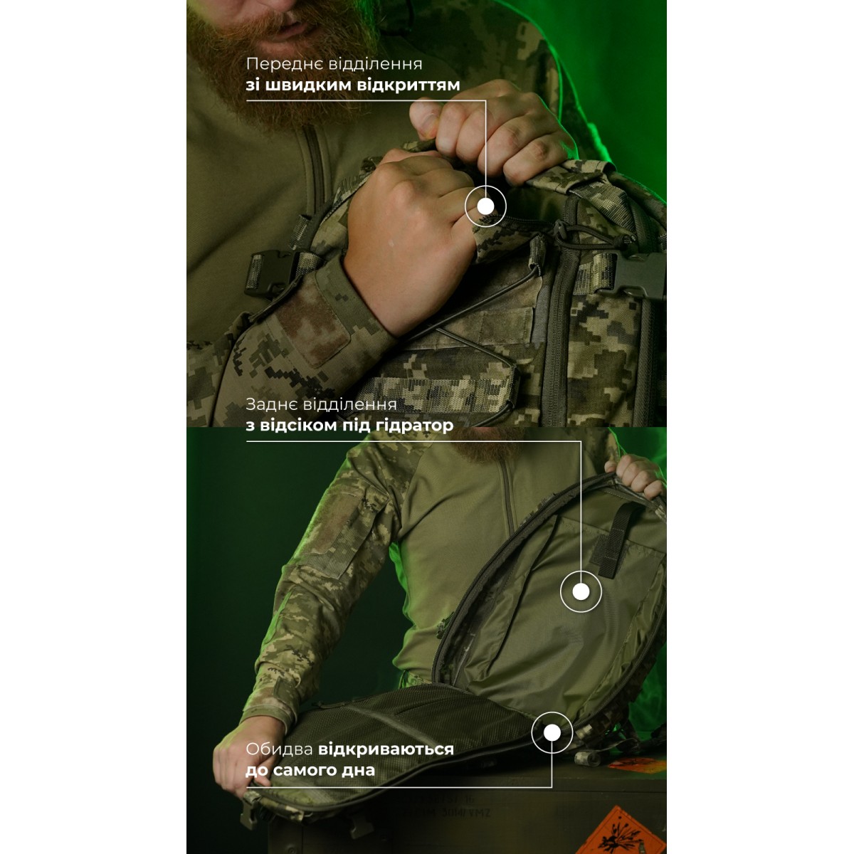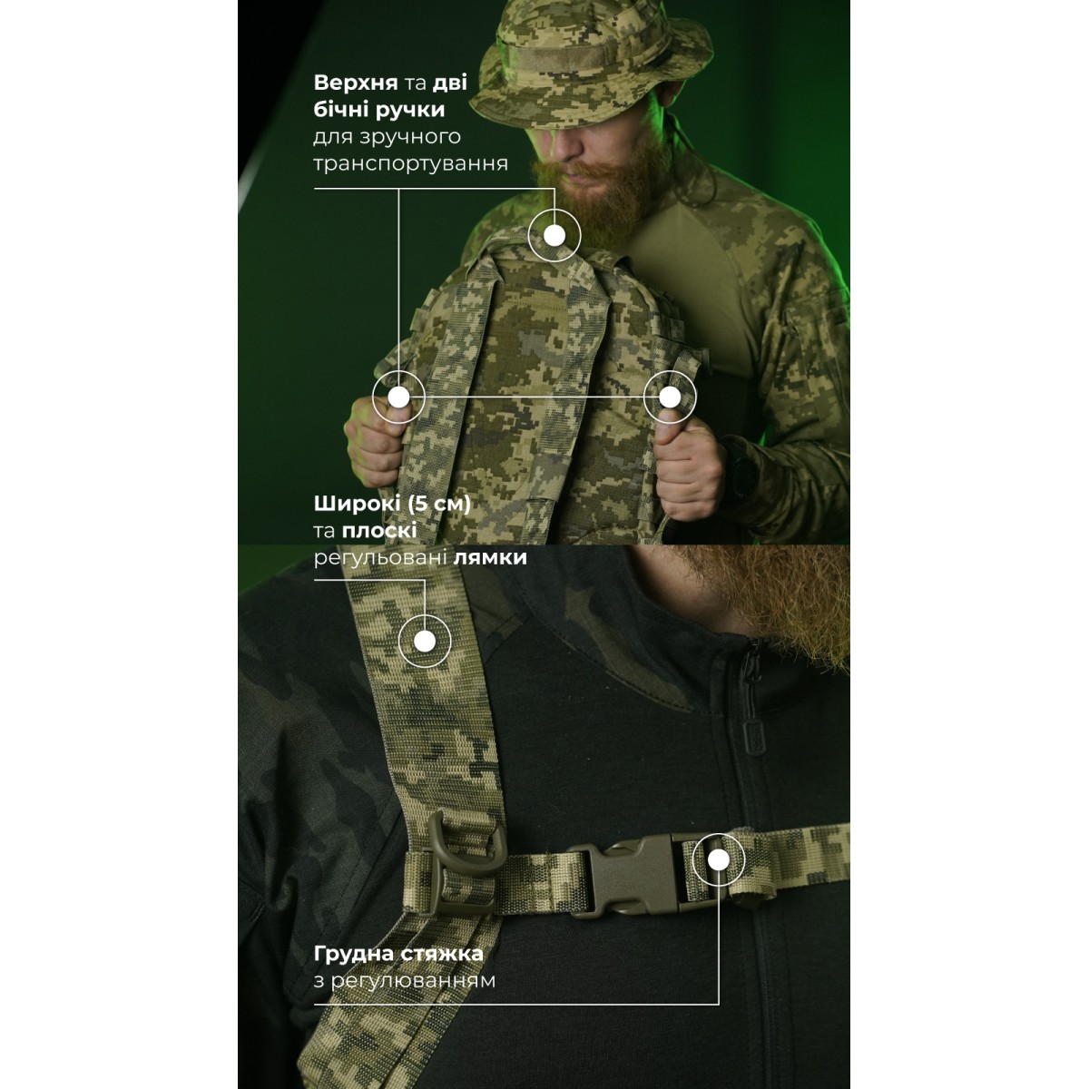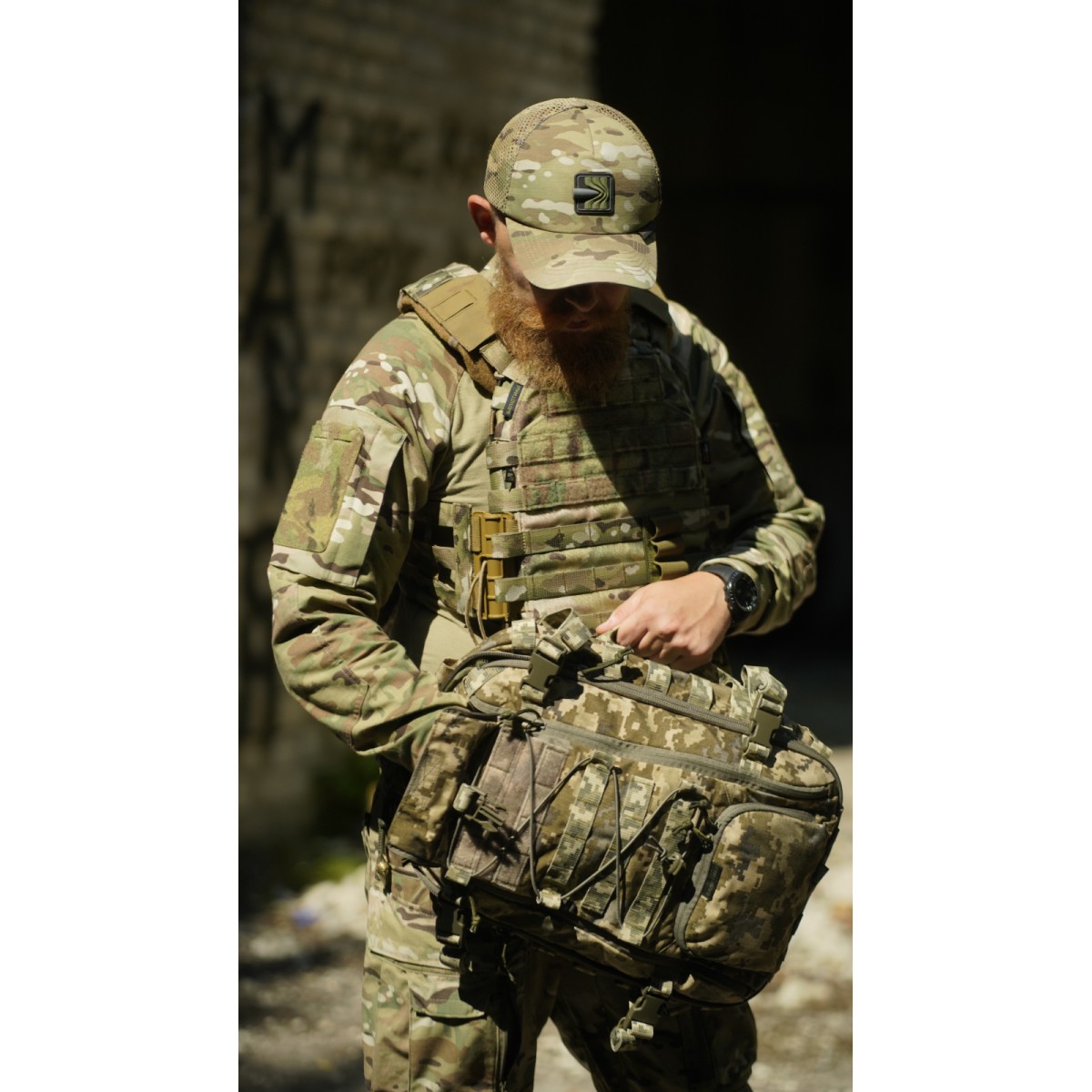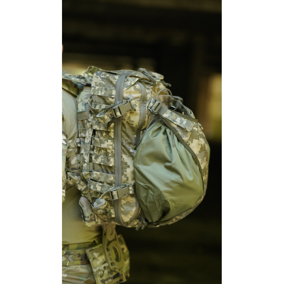 Штурмовой рюкзак «Штормар» создан как готовое решение для боевых задач. В комплекте уже есть ключевые подсумки – утилитарный, по магазины и под шлем. Боевое отделение оснащено быстрым открытием, плоские лямки не мешают укладке оружия в бронежилете / плитоноске. Есть отсек под гидратор с несколькими выходами для шланга и креплениями для него. Снаружи можно зафиксировать необходимый инвентарь на систему MOLLE, шоккорд, стропы-стяжки, велкро-панель. Пластиковая вставка и демпферы в стенках помогают рюкзаку держать форму. ✅ Ключевые преимущества Рассчитан на штурмовые задачи В комплекте утилитарный подсумок и подсумок под магазины на велкро, а также подсумок для шлема Переднее отделение под БК с быстрым открытием Заднее отделение с отсеком под гидратор на 2-3 л Носится поверх бронежилета / плитоноски 6 внутренних и 1 внешний карман Ячейки молли на фасаде и сбоку На дне – стропы для крепления снаряжения Регулируемые лямки из стропы и грудная стяжка Классическая верхняя ручка и две боковые для удобной транспортировки Устойчивая спинка с пластиковой вставкой и демпфером Люверс на дне для отвода лишней влаги и грязи Выносливые материалы: Cordura 500D/нейлон 500D (аналог Cordura), Oxford 340D, полиамидная стропа Объем: 21 л; вес: 1390 г Описание товара Этот рюкзак предназначен для использования в штурмовых условиях. В нем удобно переносить БК, гидратор, суточный рацион и другие необходимые штурмовику вещи. Основные отделения В рюкзаке есть два основных отделения. Переднее оснащено функцией быстрого раскрытия. Оно замыкается двумя молниями по бокам, а сверху – клапаном с липучкой и фастексом. Сначала нужно открыть фастекс, затем резко потянуть за клапан – и отделение раскроется до самого дна одним движением. ✔️ Фастекс предотвращает случайное открытие отделения и берет на себя нагрузку, которая приходится на фасадную часть рюкзака. ✔️ В планку над клапаном протянута эластичная лента, которая предотвращает ее самопроизвольное отгибание и попадание внутрь грязи. Заднее отделение имеет одну молнию, но с двумя бегунками, и тоже раскрывается до самого дна. Это облегчает и загрузку, и поиск вещей. Задняя стенка рюкзака держит форму благодаря пластиковой вставке и демпферу, который одновременно смягчает давление на спину. Внутренние карманы и подсумки Переднее отделение Изнутри передней панели помещены два кармана из 2D-сетки. Одна из них (18×23 см) имеет боковой доступ, другая (21×17 см) – верхний. К задней стенке пришит просторный карман (19,5×35,5 см), куда при необходимости можно положить планшет и карты. Ее передний бортик усилен демпфером и снаружи выстлан мягкой липучкой. Застегивается велкро-хлястиком. На эту липучку зафиксированы: ✔️ Утилитарный подсумок (26×15×6 см) для гранат и БК россыпью. Оснащен молнией, металлическим люверсом и велкро-панелью (15×5 см). Сбоку есть ручка, за которую его легко отрывать от липучки. ✔️ Подсумок (25,5×11 см) под 3 магазина AK/AR. Снаружи на каждом отсеке помещены велкро-панели. С обеих сторон пришиты петли для легкого открывания. Заднее отделение Передняя стенка здесь также оснащена двумя сетчатыми карманами (27×19 и 29×19 см). Продольные складки на них дают дополнительный объем при наполнении. На задней стенке помещается большой карман (28×33×5 см), адаптированный под гидратор на 2-3 л. Сверху над ним пришиты велкро-хлястики, одним можно 